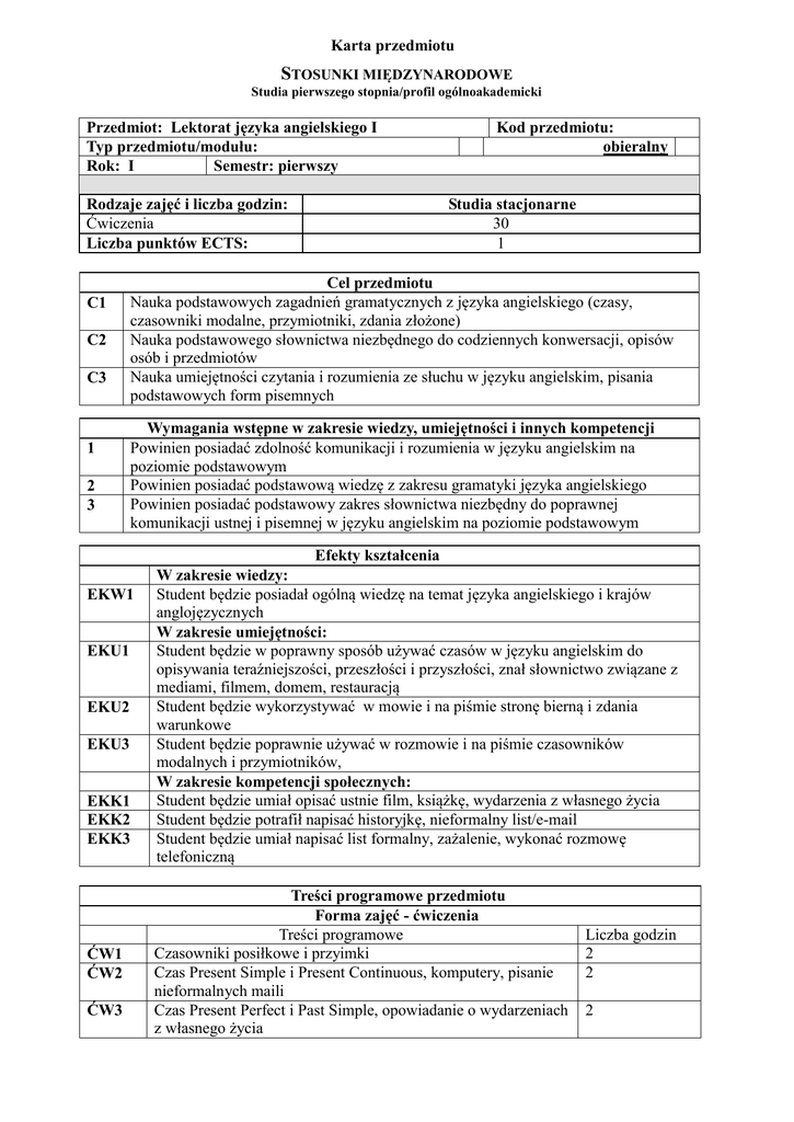 Karta przedmiotu STOSUNKI MIĘDZYNARODOWE Studia pierwszego stopnia/profil ogólnoakademicki Przedmiot: Lektorat języka angielskiego I Typ przedmiotu/modułu: Rok: I Semestr: pierwszy Rodzaje zajęć i liczba godzin: Ćwiczenia Liczba punktów ECTS: C1 C2 C3 1 2 3 Wymagania wstępne w zakresie wiedzy, umiejętności i innych kompetencji Powinien posiadać zdolność komunikacji i rozumienia w języku angielskim na poziomie podstawowym Powinien posiadać podstawową wiedzę z zakresu gramatyki języka angielskiego Powinien posiadać podstawowy zakres słownictwa niezbędny do poprawnej komunikacji ustnej i pisemnej w języku angielskim na poziomie podstawowym EKU1 EKU2 EKU3 EKK1 EKK2 EKK3 ĆW3 Studia stacjonarne 30 1 Cel przedmiotu Nauka podstawowych zagadnień gramatycznych z języka angielskiego (czasy, czasowniki modalne, przymiotniki, zdania złożone) Nauka podstawowego słownictwa niezbędnego do codziennych konwersacji, opisów osób i przedmiotów Nauka umiejętności czytania i rozumienia ze słuchu w języku angielskim, pisania podstawowych form pisemnych EKW1 ĆW1 ĆW2 Kod przedmiotu: obieralny Efekty kształcenia W zakresie wiedzy: Student będzie posiadał ogólną wiedzę na temat języka angielskiego i krajów anglojęzycznych W zakresie umiejętności: Student będzie w poprawny sposób używać czasów w języku angielskim do opisywania teraźniejszości, przeszłości i przyszłości, znał słownictwo związane z mediami, filmem, domem, restauracją Student będzie wykorzystywać w mowie i na piśmie stronę bierną i zdania warunkowe Student będzie poprawnie używać w rozmowie i na piśmie czasowników modalnych i przymiotników, W zakresie kompetencji społecznych: Student będzie umiał opisać ustnie film, książkę, wydarzenia z własnego życia Student będzie potrafił napisać historyjkę, nieformalny list/e-mail Student będzie umiał napisać list formalny, zażalenie, wykonać rozmowę telefoniczną Treści programowe przedmiotu Forma zajęć - ćwiczenia Treści programowe Czasowniki posiłkowe i przyimki Czas Present Simple i Present Continuous, komputery, pisanie nieformalnych maili Czas Present Perfect i Past Simple, opowiadanie o wydarzeniach z własnego życia Liczba godzin 2 2 2 ĆW4 ĆW5 ĆW6 ĆW7 ĆW8 ĆW9 ĆW10 ĆW11 ĆW12 ĆW13 ĆW14 ĆW15 1 2 3 Strona bierna, media, wyrażanie własnej opinii Zdania złożone, telewizja, rozwiązywanie problemów Czas przyszły, rzeczowniki złożone, rozmowy telefoniczne Czas przyszły, opis domu, pisanie zażaleń Przymiotniki, opisywanie miasta Czasy proste vs czasy ciągłe Question tags, phrasal verbs, nieformalne konwersacje Czasowniki modalne, przyjmowanie i odmawianie zaproszeń Pierwszy okres warunkowy Czasowniki z bezokolicznikiem lub imiesłowem, opisywanie książek/filmów Rzeczowniki policzalne i niepoliczalne, jedzenie, w restauracji Pisemny test zaliczeniowy 2 2 2 2 2 2 2 2 2 2 2 2 Metody i środki dydaktyczne Wykład, prezentacja ze strony prowadzącego zajęcia z wykorzystaniem materiałów źródłowych Dyskusja Wypowiedzi pisemne Sposoby oceniania Ocenianie kształtujące F1 F2 F3 Pisemny test zaliczeniowy Prezentacje ustne Prezentacje pisemne P1 Egzamin pisemny Ocenianie podsumowujące Obciążenie pracą studenta Forma aktywności Godziny kontaktowe z wykładowcą, realizowane w formie zajęć dydaktycznych – łączna liczba godzin w semestrze Średnia liczba godzin na realizowanie aktywności 30 Godziny kontaktowe z wykładowcą realizowane w formie (np. konsultacji) – łączna liczba godzin w semestrze Przygotowanie się do ... (np. laboratorium) – łączna liczba godzin w semestrze Praca własna studenta Suma Sumaryczna liczba punktów ECTS dla przedmiotu/modułu 1 2 3 30 1 Literatura podstawowa i uzupełniająca A. Clare, J.J. Wilson, „Total English” Intermediate, Longman Pearson Education D. Cotton, S. Kent, et.al. “Language Leader” Intermediate, Longman Pearson Education V. Evans, “Upstream” Intermediate, Express Publishing EKU2 EKU3 EKK1 EKK2 EKK3 C1, C2, C3 ĆW. 1-15 1,2,3 C1, C2, C3 ĆW. 1-15 1,2,3 C1, C2, C3 ĆW. 1-15 1,2,3 C1, C2, C3 ĆW. 1-15 1,2,3 C1, C2, C3 ĆW. 1-15 1,2,3 C1, C2, C3 ĆW. 1-15 1,2,3 C1, C2, C3 ĆW. 1-15 1,2,3 Sposoby oceniania Metody i środki dydaktyczne +++ +++ +++ +++ +++ +++ +++ +++ +++ +++ +++ +++ +++ +++ +++ +++ +++ +++ Treści programowe K_U01 K_U02 K_U03 K_U01 K_U02 K_U03 K_U01 K_U02 K_U03 K_K01 K_K02 K_K03 K_K01 K_K02 K_K03 K_K01 K_K02 K_K03 EKU1 Cele przedmiotu ++ ++ Stopień w jakim efekty kształcenia związane są z przedmiotem K_W01 K_W03 Odniesienie danego efektu do efektów specjalnościowych EKW1 Stopień w jakim efekty kształcenia związane są z przedmiotem Efekt kształcenia Odniesienie danego efektu kształcenia do efektów zdefiniowanych dla całego programu (PEK) Macierz efektów kształcenia F1, F2,F3, P1 F1, F2,F3, P1 F1, F2,F3, P1 F1, F2,F3, P1 F1, F2,F3, P1 F1, F2,F3, P1 F1, F2,F3, P1 Formy oceny - szczegóły Na ocenę 2 (ndst) Na ocenę 3 (dst) Na ocenę 3+ (dst+) Na ocenę 4 (db) Na ocenę 4+ (db+) Na ocenę 5 (bdb) Student nie posiada wiedzy ogólnej na temat języka angielskiego, nie potrafi w poprawny sposób używać czasów w języku angielskim do opisywania teraźniejszości, przeszłości i przyszłości, nie zna słownictwa związanego z mediami, filmem, domem, restauracją, nie umie wykorzystywać w mowie i na piśmie strony biernej i zdań warunkowych, opisać ustnie film, książkę, wydarzenie z własnego życia, napisać historyjki, nieformalny list/e-mail, list formalny, zażalenie, wykonać rozmowę telefoniczną Student posiada wiedzę ogólną na temat języka angielskiego, czasem potrafi w poprawny sposób używać czasów w języku angielskim do opisywania teraźniejszości, przeszłości i przyszłości, zna elementy słownictwa związanego z mediami, filmem, domem, restauracją, czasami umie wykorzystywać w mowie i na piśmie strony biernej i zdań warunkowych, czasami umie opisać ustnie