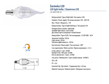Żarówka LED LED light bulbs / Лампочка LED LD-KRST3W-32 • • • • • • • • 3W • 23 W • 38 • 118 • • • • Rodzaj żarówki / Type of light bulb / Тип лампы: C30L Zasilanie / Power supply / Источник питания: 220 - 240 V AC Moc / Power / Мощность: 3 W Rodzaj trzonka / Type of light bulb bases / Тип цоколя: E14 Dostępne barwy światła: ciepły biały Available light colours: warm white Доступные цвета освещения: теплый белый Rodzaj ledów / Type of LED / Тип светодиодов: 33 LED SMD - 3014 Sprawność świetlna: 220 lm Light stream: 220 lm Световая эффективность: 220 lm Kąt świecenia / Beam angle / Угол свечения: 280⁰ Czas nagrzewania / Warm-up time / Время нагревания: < 0,1 s Liczba cykli wł. / wył.: 20 000 Number of On / Off cycles: 20 000 Кол-во циклов вкл. / выкл.: 20 000 Czas pracy / Working time / Срок службы лампы: 40 000 h CRI ≥ 80 PF = 0,4 Zawartość Hg / Hg content / Содержание Hg = 0,0 mg Materiał: tworzywo / Material: plastic / Материал: пластмасса