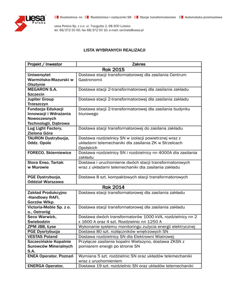 LISTA WYBRANYCH REALIZACJI Projekt / Inwestor Zakres Rok 2015 Uniwersytet Warmińsko-Mazurski w Olsztynie MEGARON S.A. Szczecin Jupiter Group Trzeszczyn Fundacja Edukacji Innowacji i Wdrażania Nowoczesnych Technologii, Dąbrowa Lug Light Factory, Zielona Góra TAURON Dystrybucja, Oddz. Opole FORECO, Skierniewice Stora Enso, Tartak w Murowie PGE Dystrybucja, Oddział Warszawa Dostawa stacji transformatorowej dla zasilania Centrum Gastronomii Dostawa stacji 2-transformatorowej dla zasilania zakładu Dostawa stacji 2-transformatorowej dla zasilania zakładu Dostawa stacji 2-transformatorowej dla zasilania budynku biurowego Dostawa stacji transformatorowej do zasilana zakładu Dostawa rozdzielnicy SN w izolacji powietrznej wraz z układami telemechaniki dla zasilania ZK w Strzelcach Opolskich Dostawa rozdzielnicy SN i rozdzielnicy nn 4000A dla zasilania zakładu Dostawa i uruchomienie dwóch stacji transformatorowych wraz z układami telemechaniki dla zasilania zakładu Dostawa 8 szt. kompaktowych stacji transformatorowych Rok 2014 Zakład Produkcyjno -Handlowy RAFI, Gorzów Wlkp. Victoria-Meble Sp. z o. o., Ostroróg Seco Warwick, Świebodzin ZPM JBB, Łyse PGE Dysrtybucja VESTAS Poland Szczecińskie Kopalnie Surowców Mineralnych S.A. ENEA Operator, Poznań ENERGA Operator, Dostawa stacji transformatorowej dla zasilania zakładu Dostawa stacji transformatorowej dla zasilania zakładu Dostawa dwóch transformatorów 1000 kVA, rozdzielnicy nn 2 x 1600 A oraz 4 szt. Rozdzielnic nn 1250 A Wykonanie systemu monitoringu zużycia energii elektrycznej Dostawa 80 szt. rozłączników wnętrzowych SN Dostawa rozdzielnicy SN dla Elektrowni Wiatrowej Przyłącze zasilania kopalni Wietszyno, dostawa ZKSN z pomiarem energii po stronie SN Wymiana 5 szt. rozdzielnic SN oraz układów telemechaniki wraz z uruchomieniem Dostawa 19 szt. rozdzielnic SN oraz układów telemechaniki oddz. Toruń Wielospecjalistyczny Szpital Miejski im. Józefa Strusia, Poznań PKP Energetyka, Zakład Zachodni TAURON Dystrybucja Hala Stulecia Wrocław RED PARK TWN Szczecin wraz z uruchomieniem Wymiana dwóch 5-cio polowych rozdzielnic SN Dostawa 3 rozdzielnic SN (łącznie 18 pól) Dostawa 78 rozłączników wnętrzowych SN wraz z układami telemechaniki (dla Oddziałów: Wrocław, Opole, Legnica, Jelenia Góra) Dostawa podziemnej stacji transformatorowej z dwoma transformatorami 1600 kVA Dostawa stacji transformatorowej 1,6 MVA zasilającej osiedle RED PARK w Poznaniu. Dostawa 14-polowej rozdzielnicy SN w izolacji powietrznej typu MSA-L dla Szpitala Wojewódzkiego w Szczecinie Rok 2013 PKP Energetyka Zakład Zachodni PKP Energetyka Zakład Zachodni Elstan Szczecin Energa / ZEP Handel ENEA Operator RD Choszczno TAURON Dystrybucja Oddział w Będzinie JAMP Sp. z o.o. ELTOR Lubań BHU/ENEA Gorzów Wlkp. ENERGOUD/ENEA Zielona Góra TAURON Dystrybucja Miejska Oczyszczalnia Ścieków w Lubsku Afirkarium Wrocław Huta Jedlice Swedwood Zbąszynek Port Lotniczy Gdynia-Kosakowo Dostawa kilkunastu kompaktowych stacji transformatorowych Dostawa 7-polowego złącza SN przystosowanego do zdalnego sterowania Dostawa rozdzielnicy SN z układem SZR zasilające Piastów Office Center Dostawa ponad 100 szt aparatów SN typu KL/KLF do modernizowanych stacji transformatorowych Dostawa wraz z montażem napędów elastycznych typu Flexball dla istniejących rozłączników SN w stacji wieżowej Dostawa wraz z montażem 3-ech rozłączników wnętrzowych SN z napędem elastycznym typu Flexball Dostawa wraz z montażem rozłącznika wnętrzowego SN z napędem elastycznym typu Flexball Dostawa wraz z wymianą rozdzielnic SN, rozdzielnic nn oraz układów telemechaniki dla TAUROn Dystrybucja Oddz. Jelenia Góra Dostawa stolarki drzwiowej dla kilku modernizowanych stacji transformatorowych na terenie ENEA Gorzów Wielkopolski Dostawa stolarki drzwiowej dla kilkunastu modernizowanych stacji transformatorowych na terenie ENEA Zielona Góra Dostawa wnętrzowych rozłączników SN wraz układami telemechaniki na potrzeby Koncernu Modernizacja układów zasilania i sterowania pracą oczyszczalni. Wykonanie układów automatyki, monitoringu i wizualizacji pracy oczyszczalni Budowa stacji transformatorowej 2,5 MW do zasilania Afrikarium (ZOO Wroclaw) Budowa rozdzielnicy sieciowej RS Jedlice wraz z układami automatyki dla Tauron Dystrybucja Dostawa stacji transformatorowych oraz rozdzielnic SN i nn do zasilania nowej części zakładu Budowa układu bezprzerwowego zasilania oświetlenia lotniska Elektrownia Wiatrowa Paproć Biogazownia Olesno Biogazownia w Klępsku Biomasa Orzeszkowo Stelmet Zielona Góra Wyprowadzenie mocy z EW o mocy 2,5 MW – w 2013 roku najwyższe wiatraki na świecie Dostawa stacji transformatorowej 800 kVA z układem AKPiA do wyprowadzenia mocy z biogazowi Dostawa urządzeń rozdzielczych do wyprowadzenia mocy z bigazowni Dostawa urządzeń stacji transformatorowej do wyprowadzenia mocy z bigazowni Wyprowadzenie mocy z biogazowni Rok 2012 GEDIA Nowa Sól PWSZ Sulechów LOIiWA Kalsk Uniwersytet Mikołaja Kopernika w Toruniu PPH Legs Sp. z o.o. Aleksandrów Łódzki TAURON Dystrybucja PKP Energetyka – Poznań Dworzec Główny Budowa rozdzielnicy sieciowej SN do zasilania nowobudowanego zakładu Dostawa stacji transformatorowej do zasilania LOIiWA oraz budowa systemu monitoringu zużycia mediów Dostawa stacji transformatorowej Dostawa stacji transformatorowej Dostawy rozłączników wnętrzowych SN sterowanych ręcznie Dostawa rozdzielnic SN i nn Rok 2011 i starsze Renomowany producent branży spożywczej PWSZ Sulechów -Centrum Energetyki Odnawialnej TAURON Dystrybucja Elektrownia Wodna Bledzew Stadion we Wrocławiu ZPM JBB, Łyse Poprawa niezawodności zasilania poprzez budowę nowej stacji transformatorowej o mocy 2,5MW oraz instalacja systemu monitoringu zużycia mediów Dostawa urządzeń do rozdziału energii elektrycznej oraz budowa systemu monitoringu produkcji energii ze źródeł odnawialnych Dostawy rozłączników wnętrzowyc