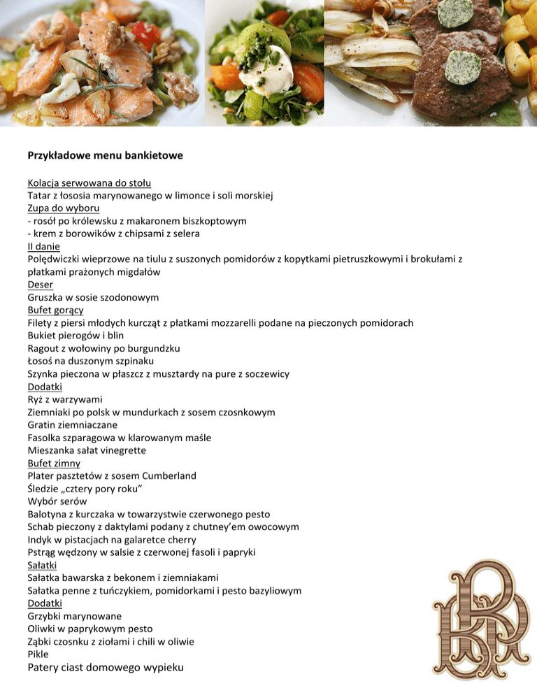 Przykładowe menu bankietowe Kolacja serwowana do stołu Tatar z łososia marynowanego w limonce i soli morskiej Zupa do wyboru - rosół po królewsku z makaronem biszkoptowym - krem z borowików z chipsami z selera II danie Polędwiczki wieprzowe na tiulu z suszonych pomidorów z kopytkami pietruszkowymi i brokułami z płatkami prażonych migdałów Deser Gruszka w sosie szodonowym Bufet gorący Filety z piersi młodych kurcząt z płatkami mozzarelli podane na pieczonych pomidorach Bukiet pierogów i blin Ragout z wołowiny po burgundzku Łosoś na duszonym szpinaku Szynka pieczona w płaszcz z musztardy na pure z soczewicy Dodatki Ryż z warzywami Ziemniaki po polsk w mundurkach z sosem czosnkowym Gratin ziemniaczane Fasolka szparagowa w klarowanym maśle Mieszanka sałat vinegrette Bufet zimny Plater pasztetów z sosem Cumberland Śledzie „cztery pory roku” Wybór serów Balotyna z kurczaka w towarzystwie czerwonego pesto Schab pieczony z daktylami podany z chutney’em owocowym Indyk w pistacjach na galaretce cherry Pstrąg wędzony w salsie z czerwonej fasoli i papryki Sałatki Sałatka bawarska z bekonem i ziemniakami Sałatka penne z tuoczykiem, pomidorkami i pesto bazyliowym Dodatki Grzybki marynowane Oliwki w paprykowym pesto Ząbki czosnku z ziołami i chili w oliwie Pikle Patery ciast domowego wypieku