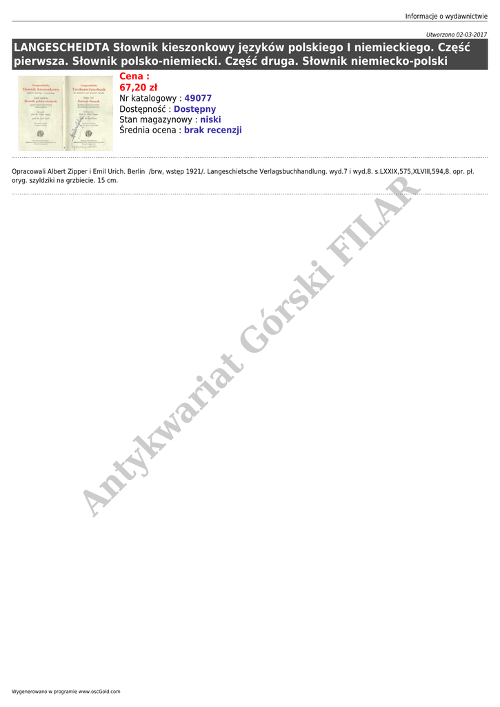 Informacje o wydawnictwie Utworzono 02-03-2017 LANGESCHEIDTA Słownik kieszonkowy języków polskiego I niemieckiego. Część pierwsza. Słownik polsko-niemiecki. Część druga. Słownik niemiecko-polski Cena : 67,20 zł Nr katalogowy : 49077 Dostępność : Dostępny Stan magazynowy : niski Średnia ocena : brak recenzji An ty k w ar ia t G ór sk i FI LA R Opracowali Albert Zipper i Emil Urich. Berlin /brw, wstęp 1921/. Langeschietsche Verlagsbuchhandlung. wyd.7 i wyd.8. s.LXXIX,575,XLVIII,594,8. opr. pł. oryg. szyldziki na grzbiecie. 15 cm. Wygenerowano w programie www.oscGold.com