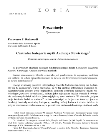 Σ Ο Φ Ι Α ISSN 1642-1248 NR13/2013 7/2007 NR ISSN 1642-1248 Prezentacje Презентации Francesco P. Raimondi Accademia delle Scienze di Apulia Università del Salento di Lecce Centralne kategorie myśli Andrzeja Nowickiego1 Главные категории мысли Анджея Новицкого W pierwszym akapicie swojego fundamentalnego dzieła Centralne kategorie filozofii Vaniniego Andrzej Nowicki napisał: Sercem renesansowej filozofii człowieka jest przekonanie, że najwyższą wartością jest kultura i że jedyną racją istnienia ludzi na świecie jest tworzenie przez nich wspaniałe2 go świata dziel ludzkich . Biorąc w nawias problem interpretacji filozofii Odrodzenia, którą nie będziemy się tu zajmować3, warto zauważyć, że w tej krótkiej introdukcji wyraźnie zasygnalizowane zostały dwie najbardziej doniosłe centralne kategorie myśli Nowickiego (pensiero nowickiano), kultura jako najwyższa ludzka wartość i tworzenie cudownych dzieł ludzkich jako najgłębszy sens istnienia. W słowach „jedyna racja istnienia ludzi na świecie” można zauważyć w tle jeszcze trzecią i jeszcze bardziej doniosłą centralną kategorię, według której kultura i dzieła ludzkie to jedyna możliwość znalezienia się w przestrzeni nieśmiertelności (proiettarsi nella 1 Tekst został napisany z okazji 90. urodzin Andrzeja Nowickiego i tłumaczony przez niego samego na język polski. Miał stanowić wstęp do pracy zbiorowej Atena Creanda, która nie została wydana z powodu śmierci filozofa. 2 A. Nowicki, Le categorie centrali della filosofia del Vanini [w:] G. Papuli, Le interpretazioni di G.C. Vanini, Galatina, Congedo 1975, s. 153–316 (A. Nowicki, Centralne kategorie filozofii Vaniniego, PWN, Warszawa 1970, s. 11). 3 Zob. F.P. Raimondi, Andrzej Nowicki filosofo e storico della filosofia, Taurisano, Presenza Taurisanese 1992, s. 5–22. Презентации 346 dimensione dell’immortalita). Z tych wstępnych uwag można wydobyć dwa podstawowe elementy: pierwszy, że myśl Nowickiego budowana jest w splocie badań historycznych z rozważaniami teoretycznymi; i drugi, że centralne kategorie mają nie tylko charakter instrumentalny i pojęciowy, ale są także imperatywami i bodźcami twórczymi (carattere imperativo e poietico-creativo). Filozofia spotkania (dla Nowickiego) jest przede wszystkim filozofią wstępowania (ingresso) w świat kultury, czyli mówiąc słowami Vaniniego w Respublica literaria, żeby znaleźć się in comnuni theatro sapientum, czyli w świecie podmiotów myślących i tworzących i w świecie przedmiotów wymyślanych i wytwarzanych. W ten sposób filozofia splata się ściśle z historią filozofii. Nie można ich od siebie oddzielić; badania historyczne i aktywność teoretyczna wzajemnie się zapładniają i wzbogacają, oddziałują na siebie. Nie są polami oddzielonymi i odgrodzonymi od siebie, lecz polami osmozy, w których płynność i przenikalność mają wyraźną przewagę nad stabilnością, statycznością i krystalizacją esencji starej metafizyki ontologicznej czy nad eternizacją kategorii myśli religijnej. W tym sensie inkontrologia Nowickiego (incontrologia nowickiana) jest odpowiedzią na jeden z najtrudniejszych problemów myśli współczesnej, którym jest Abgrenzungsproblem4, definitywne odrzucenie starych schematów typu metafizycznego i wszystkich takich antropologii, które petryfikują i mumifikują egzystencję ludzką. Wynika z tego wniosek, że wejście w optykę inkontrologii Nowickiego oznacza przyjęcie nowoczesnej perspektywy myślowej, w której stare wyjaśniające schematy okazują się bezużyteczne, a w każdym razie nieprzydatne do interpretacji nieustannie płynącego strumienia twórczości ludzkiej. Badania historyczne są więc wstępowaniem w świat kultury, w świat dzieł ludzkich, w przestrzeń spotkania z wielkimi Herosami. Myślicielami przeszłości, jak Bruno, Vanini, Campanella, Lullus ze względu na wielki potencjał twórczy swoich myśli. Spotkania z wielkimi Osobami są zapośredniczone przez ‘rzeczy’, przez ich dzieła. Jako historyk, Nowicki tworzy swój własny modus investigandi, którego korzenie znajdują się w jego własnej filozofii. W rozprawie pod tytułem Bruno a filozofia chińska5 Nowicki wyjaśnia, że – będąc filozofem – odczuwał potrzebę: (...) stworzenia własnej metody badań (modus investigandi), własnego sposobu uprawiania historii filozofii koncentrującego uwagę nie na „myślach wytworzonych” (pensieri pensati) filozofów czyli na ich doktrynach, ale na ich „myśli myślącej” (Pensiero pensante) czyli na ich „narzędziach pojęciowych” a więc na ich sposobie kategoryzowania rze6 czywistości, i właśnie te narzędzia nazwał ‘centralnymi kategoriami’ ich filozofii . 4 Problemem tym zajmuje się wielu neopozytywistów, zwłaszcza M. Schlick, Die Wende der Philosophie, „Erkenntnis” 1930, I, s. 4–11. 5 Zob. A. Nowicki, Bruno e la filosofia cinese, „Bruniana e Campanelliana” 2008, XIV, s. 405, 424. 6 Ibidem. Prezentacje 347 W tej wypowiedzi splot badań historycznych z rozważaniami filozoficznymi widać bardzo wyraźnie. Przeciwstawienie „narzędzi pojęciowych” doktrynom ma nie tylko charakter logiczny, ale także i przede wszystkim sens aksjologiczny. Doktryny (religijne, polityczne, naukowe a także filozoficzne) są czymś ustabilizowanym, zastygłym, czymś, co kładzie kres poszukiwaniom, „wymaga wiary, ortodoksji, posłuszeństwa, odbiera wolność myśleniu”7. Narzędzia, przeciwnie, zachęcają, żeby je wypróbować, sprawdzać jak działają, czy nadają się do rozwiązywania nowych problemów, poprawiać i doskonalić. „Doktryny starzeją się, są wypierane przez nowe”, natomiast narzędzia mogą być wciąż ulepszane. Oznacza to, że centralne kategorie są obdarzone witalnością, dzięki której znajdują się w nieustannym ruchu, uczestnicząc aktywnie w „walce o 