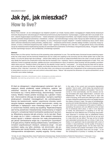 MAŁGORZATA MIZIA* Jak żyć, jak mieszkać? How to live? Streszczenie Renzo Piano twierdzi1, że era rozlewających się miejskich peryferii2 już minęła. Dywany płasko rozciągających miejską tkankę tarasowych domostw ekspansywnie rozbudowujących infrastrukturę techniczną są zbyt kosztowne i wyniszczające, a system jako taki musi przejść do historii. Jedynie dogęszczające wysokościowce – miasta wertykalne wykorzystujące brownfields, czyli miejskie obszary niezabudowane, mogą sprostać potrzebie ekspansji budowlanej o charakterze „implozji”, czyli dośrodkowego rozwoju miast. Rysuje się zatem tendencja rugowania zabudowy podmiejskiej, satelitarnej, nawet wiejskiej, na rzecz intensywnych skupisk miejskich3 i możliwie nieskażonej natury wokół. Gdzie zatem ulokować atawistyczną ludzką potrzebę „wiejskiej ciszy” – mieszkania pośród drzew, potrzeby stałego kontaktu z przyrodą, trwogi wysokości, w końcu umiłowania bezpiecznej skali „małych miast”4 zgodnej z tendencją ruchu citta slow. Z drugiej jednak strony coraz bardziej rysuje się niedostosowanie współczesnej populacji do samodzielności przetrwania i konfrontacji z nieograniczoną naturą. „Przygoda” nabrała wymiaru sportowego wyczynu, aktu bohaterstwa, śmiertelnego wyzwania. Abstract Renzo Piano is of the opinion1 that the era of the sprawling urban peripheries2 is over. The vast flat areas of terraced houses stretching expansively the urban tissue and the technical infrastructure are too costly and crippling to the economy and the whole system has to pass into history. It is only the dense high-rise buildings – vertical cities making use of the so called brownfields that is the urban un-built up areas, that may satisfy the need for the construction boom that has the character of an “implosion” that is a centripetal development of cities. Thus, one observes a trend to eradicate suburban, satellite and even rural architecture in favor of intensive urban housing3 and the possibly uncontaminated nature around. Therefore where is the place for the atavistic human need for “rural peace” – for living among the trees and for permanent contact with nature and the fear of heights; and finally what about the love of the safe scale of “small cities”4 which is in accord with the tendency of the “citta slow” movement. Yet on the other hand, one notices an ever greater lack of adjustment of the contemporary population to being able to survive on one’s own and confront unbounded nature. “Nature” has acquired the dimension of a sports achievement, an act of heroism and a lethal challenge. Słowa kluczowe: urbanistyka, ukierunkowanie, artyści, ekodesignerzy, potrzeby społeczne Keywords: urban planning, giving direction, artists, eco-designers, social needs W ślad za obiegowym i stygmatyzującym pytaniem ‘jak żyć’, mającym dzisiaj podteksty nawet polityczne, pytanie ‘jak mieszkać’ narzuca się automatycznie, ale też odpowiedzi formowane są z równą determinacją, dezorientacją i bezradnością. Wielkie miasta polskie borykają się z głodem mieszkań, równocześnie oferując do sprzedaży i wynajmu wachlarz atrakcyjnych mieszkań nieosiągalnych dla potrzebujących. Szerzy się bezdomność, nędza i psychiczne choroby cywilizacyjne będące następstwem spirali niemożności, osoby nią dotknięte w najlepszym razie mieszkają kątem u innych lub w ruinach bez mediów, szerzy się squatting. Najskuteczniejszą zaś formą zaradności mieszkaniowej obserwowaną w krajach znanych z utrwalonej historii kontrastów społecznych są slumsy. Mieszkamy wszyscy tak jak umiemy i na ile nas stać. Rzadko wiąże się to li tylko z wyborem. Brak estetyki mieszkania można łączyć z brakiem wzorców lub małą pomysłowością, ale jakość zamieszkania wiąże się z wymiernymi czynnikami. Z drugiej strony chętnie dzisiaj praktykowany i zachwalany minimalizm współczesnych młodych, zwłaszcza singli – nie jest wynikiem nędzy czy tylko ubóstwa, lub skromności, ale podyktowany jest raczej filozofią ruchu, chęcią zmian i potrzebą niekrępowania obciążeniami, zwykłej wygody. Formy miesz- In the wake of the current and somewhat stigmatizing question “how to exist”, which today has acquired even strongly political connotations, the question “how to live” comes to mind automatically; and the answers are being formulated with equal determination, confusion and helplessness. The big Polish cities have to cope with a lack of housing, at the same time offering for sale or rent a range of attractive apartments which are largely beyond the means of those in need. The wave of homelessness, poverty and mental disturbances, that is diseases of affluence which are a consequence of the spiral of inability, is spreading; the persons who are afflicted by them at best live at somebody else’s place, or else in ruins deprived of media; the phenomenon of squatting is on the rise. Whereas the most effective form of housing resourcefulness observed in countries with an established history of social contrasts, are slums. We all live as we can and in a way which we can afford. The way we live is hardly ever associated exclusively with our choice. A lack of esthetics in an apartment may be associated with a lack of models or resourcefulness, but the quality of housing is associated with tangible factors. On the other hand, the widely practiced and praised minimalism of the contemporary young, particularly those who are single – is not the consequence of poverty or modesty, but rather the * Dr hab. inż. arch. Małgorzata Mizia, Instytut Projektowania Urbanistycznego, Wydział Architektury Politechniki Krakowskiej im.T. Kościuszki / Małgorzata Mizia, Associate Prof. Ph.D. Eng. Arch, Institute of Urban Design, Faculty of Architecture, T. Kościuszko Cracow University of Technology, e-mail: [email protected] 151 kania przyszłości zatem dyktowane będą głó