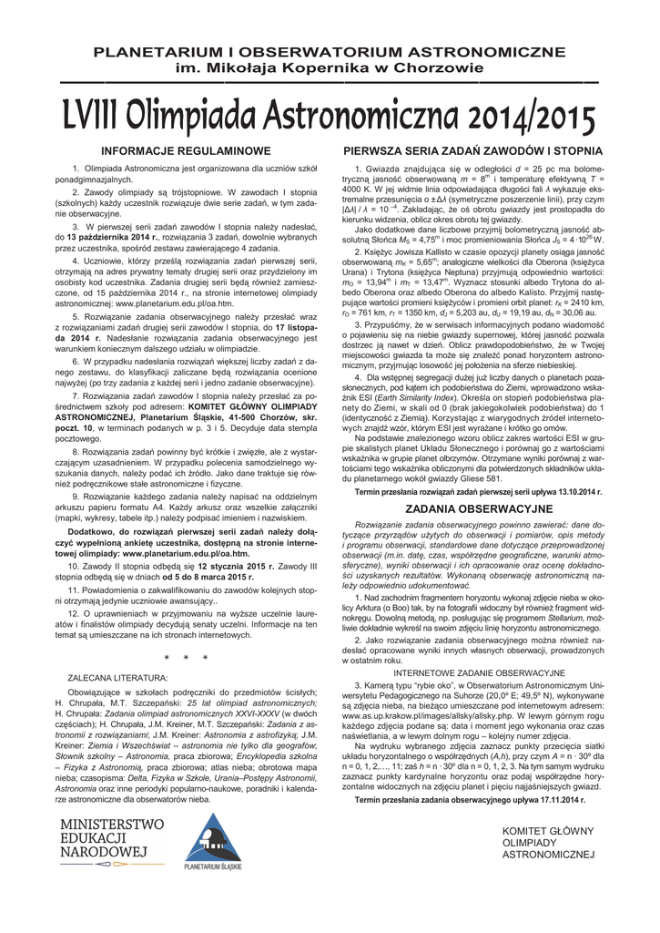 PLANETARIUM I OBSERWATORIUM ASTRONOMICZNE im. Mikołaja Kopernika w Chorzowie –––––––––––––––––––––––––––––––––––– /9,,,2OLPSLDGD$VWURQ ,,,2OLPSLDGD$VWURQR 2OLPSLDGD$VWURQRPLF]QD PLF]QD INFORMACJE REGULAMINOWE PIERWSZA SERIA ZADAē ZAWODÓW I STOPNIA 1. Olimpiada Astronomiczna jest organizowana dla uczniów szkół ponadgimnazjalnych. 1. Gwiazda znajdująca siĊ w odległoĞci d = 25 pc ma bolometryczną jasnoĞü obserwowaną m = 8m i temperaturĊ efektywną T = 4000 K. W jej widmie linia odpowiadająca długoĞci fali Ȝ wykazuje ekstremalne przesuniĊcia o ± ǻȜ (symetryczne poszerzenie linii), przy czym |ǻȜ| / Ȝ = 10 –4. Zakładając, Īe oĞ obrotu gwiazdy jest prostopadła do kierunku widzenia, oblicz okres obrotu tej gwiazdy. Jako dodatkowe dane liczbowe przyjmij bolometryczną jasnoĞü absolutną SłoĔca MS = 4,75m i moc promieniowania SłoĔca JS = 4 ·1026 W. 2. KsiĊĪyc Jowisza Kallisto w czasie opozycji planety osiąga jasnoĞü obserwowaną mK = 5,65m; analogiczne wielkoĞci dla Oberona (ksiĊĪyca Urana) i Trytona (ksiĊĪyca Neptuna) przyjmują odpowiednio wartoĞci: mO = 13,94m i mT = 13,47m. Wyznacz stosunki albedo Trytona do albedo Oberona oraz albedo Oberona do albedo Kalisto. Przyjmij nastĊpujące wartoĞci promieni ksiĊĪyców i promieni orbit planet: rK = 2410 km, rO = 761 km, rT = 1350 km, dJ = 5,203 au, dU = 19,19 au, dN = 30,06 au. 3. PrzypuĞümy, Īe w serwisach informacyjnych podano wiadomoĞü o pojawieniu siĊ na niebie gwiazdy supernowej, której jasnoĞü pozwala dostrzec ją nawet w dzieĔ. Oblicz prawdopodobieĔstwo, Īe w Twojej miejscowoĞci gwiazda ta moĪe siĊ znaleĨü ponad horyzontem astronomicznym, przyjmując losowoĞü jej połoĪenia na sferze niebieskiej. 4. Dla wstĊpnej segregacji duĪej juĪ liczby danych o planetach pozasłonecznych, pod kątem ich podobieĔstwa do Ziemi, wprowadzono wskaĨnik ESI (Earth Similarity Index). OkreĞla on stopieĔ podobieĔstwa planety do Ziemi, w skali od 0 (brak jakiegokolwiek podobieĔstwa) do 1 (identycznoĞü z Ziemią). Korzystając z wiarygodnych Ĩródeł internetowych znajdĨ wzór, którym ESI jest wyraĪane i krótko go omów. Na podstawie znalezionego wzoru oblicz zakres wartoĞci ESI w grupie skalistych planet Układu Słonecznego i porównaj go z wartoĞciami wskaĨnika w grupie planet olbrzymów. Otrzymane wyniki porównaj z wartoĞciami tego wskaĨnika obliczonymi dla potwierdzonych składników układu planetarnego wokół gwiazdy Gliese 581. 2. Zawody olimpiady są trójstopniowe. W zawodach I stopnia (szkolnych) kaĪdy uczestnik rozwiązuje dwie serie zadaĔ, w tym zadanie obserwacyjne. 3. W pierwszej serii zadaĔ zawodów I stopnia naleĪy nadesłaü, do 13 paĨdziernika 2014 r., rozwiązania 3 zadaĔ, dowolnie wybranych przez uczestnika, spoĞród zestawu zawierającego 4 zadania. 4. Uczniowie, którzy przeĞlą rozwiązania zadaĔ pierwszej serii, otrzymają na adres prywatny tematy drugiej serii oraz przydzielony im osobisty kod uczestnika. Zadania drugiej serii bĊdą równieĪ zamieszczone, od 15 paĨdziernika 2014 r., na stronie internetowej olimpiady astronomicznej: www.planetarium.edu.pl/oa.htm. 5. Rozwiązanie zadania obserwacyjnego naleĪy przesłaü wraz z rozwiązaniami zadaĔ drugiej serii zawodów I stopnia, do 17 listopada 2014 r. Nadesłanie rozwiązania zadania obserwacyjnego jest warunkiem koniecznym dalszego udziału w olimpiadzie. 6. W przypadku nadesłania rozwiązaĔ wiĊkszej liczby zadaĔ z danego zestawu, do klasyfikacji zaliczane bĊdą rozwiązania ocenione najwyĪej (po trzy zadania z kaĪdej serii i jedno zadanie obserwacyjne). 7. Rozwiązania zadaĔ zawodów I stopnia naleĪy przesłaü za poĞrednictwem szkoły pod adresem: KOMITET GŁÓWNY OLIMPIADY ASTRONOMICZNEJ, Planetarium ĝląskie, 41-500 Chorzów, skr. poczt. 10, w terminach podanych w p. 3 i 5. Decyduje data stempla pocztowego. 8. Rozwiązania zadaĔ powinny byü krótkie i zwiĊzłe, ale z wystarczającym uzasadnieniem. W przypadku polecenia samodzielnego wyszukania danych, naleĪy podaü ich Ĩródło. Jako dane traktuje siĊ równieĪ podrĊcznikowe stałe astronomiczne i fizyczne. 9. Rozwiązanie kaĪdego zadania naleĪy napisaü na oddzielnym arkuszu papieru formatu A4. KaĪdy arkusz oraz wszelkie załączniki (mapki, wykresy, tabele itp.) naleĪy podpisaü imieniem i nazwiskiem. Dodatkowo, do rozwiązaĔ pierwszej serii zadaĔ naleĪy dołączyü wypełnioną ankietĊ uczestnika, dostĊpną na stronie internetowej olimpiady: www.planetarium.edu.pl/oa.htm. 10. Zawody II stopnia odbĊdą siĊ 12 stycznia 2015 r. Zawody III stopnia odbĊdą siĊ w dniach od 5 do 8 marca 2015 r. 11. Powiadomienia o zakwalifikowaniu do zawodów kolejnych stopni otrzymają jedynie uczniowie awansujący.. 12. O uprawnieniach w przyjmowaniu na wyĪsze uczelnie laureatów i finalistów olimpiady decydują senaty uczelni. Informacje na ten temat są umieszczane na ich stronach internetowych. ÃÃÃ ZALECANA LITERATURA: Obowiązujące w szkołach podrĊczniki do przedmiotów Ğcisłych; H. Chrupała, M.T. SzczepaĔski: 25 lat olimpiad astronomicznych; H. Chrupała: Zadania olimpiad astronomicznych XXVI-XXXV (w dwóch czĊĞciach); H. Chrupała, J.M. Kreiner, M.T. SzczepaĔski: Zadania z astronomii z rozwiązaniami; J.M. Kreiner: Astronomia z astrofizyką; J.M. Kreiner: Ziemia i WszechĞwiat – astronomia nie tylko dla geografów; Słownik szkolny – Astronomia, praca zbiorowa; Encyklopedia szkolna – Fizyka z Astronomią, praca zbiorowa; atlas nieba; obrotowa mapa nieba; czasopisma: Delta, Fizyka w Szkole, Urania–PostĊpy Astronomii, Astronomia oraz inne periodyki popularno-naukowe, poradniki i kalendarze astronomiczne dla obserwatorów nieba. Termin przesłania rozwiązaĔ zadaĔ pierwszej serii upływa 13.10.2014 r. ZADANIA OBSERWACYJNE Rozwiązanie zadania obserwacyjnego powinno zawieraü: dane dotyczące przyrządów uĪytych do 