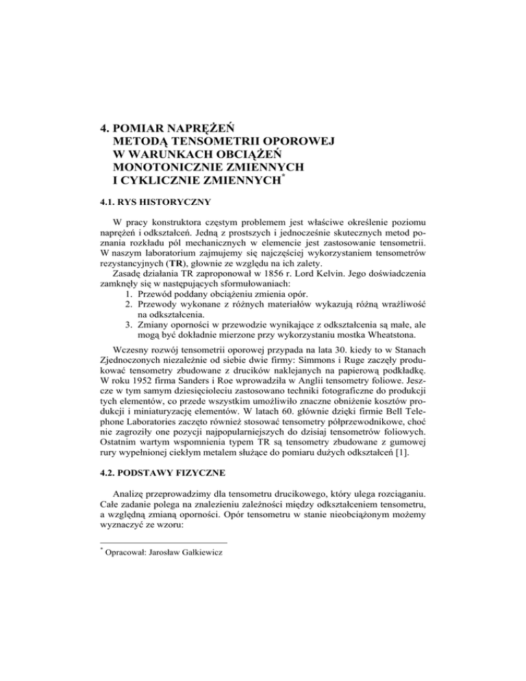 4. POMIAR NAPRĘŻEŃ METODĄ TENSOMETRII OPOROWEJ W WARUNKACH OBCIĄŻEŃ MONOTONICZNIE ZMIENNYCH I CYKLICZNIE ZMIENNYCH* 4.1. RYS HISTORYCZNY W pracy konstruktora częstym problemem jest właściwe określenie poziomu naprężeń i odkształceń. Jedną z prostszych i jednocześnie skutecznych metod poznania rozkładu pól mechanicznych w elemencie jest zastosowanie tensometrii. W naszym laboratorium zajmujemy się najczęściej wykorzystaniem tensometrów rezystancyjnych (TR), głownie ze względu na ich zalety. Zasadę działania TR zaproponował w 1856 r. Lord Kelvin. Jego doświadczenia zamknęły się w następujących sformułowaniach: 1. Przewód poddany obciążeniu zmienia opór. 2. Przewody wykonane z różnych materiałów wykazują różną wrażliwość na odkształcenia. 3. Zmiany oporności w przewodzie wynikające z odkształcenia są małe, ale mogą być dokładnie mierzone przy wykorzystaniu mostka Wheatstona. Wczesny rozwój tensometrii oporowej przypada na lata 30. kiedy to w Stanach Zjednoczonych niezależnie od siebie dwie firmy: Simmons i Ruge zaczęły produkować tensometry zbudowane z drucików naklejanych na papierową podkładkę. W roku 1952 firma Sanders i Roe wprowadziła w Anglii tensometry foliowe. Jeszcze w tym samym dziesięcioleciu zastosowano techniki fotograficzne do produkcji tych elementów, co przede wszystkim umożliwiło znaczne obniżenie kosztów produkcji i miniaturyzację elementów. W latach 60. głównie dzięki firmie Bell Telephone Laboratories zaczęto również stosować tensometry półprzewodnikowe, choć nie zagroziły one pozycji najpopularniejszych do dzisiaj tensometrów foliowych. Ostatnim wartym wspomnienia typem TR są tensometry zbudowane z gumowej rury wypełnionej ciekłym metalem służące do pomiaru dużych odkształceń [1]. 4.2. PODSTAWY FIZYCZNE Analizę przeprowadzimy dla tensometru drucikowego, który ulega rozciąganiu. Całe zadanie polega na znalezieniu zależności między odkształceniem tensometru, a względną zmianą oporności. Opór tensometru w stanie nieobciążonym możemy wyznaczyć ze wzoru: * Opracował: Jarosław Gałkiewicz R=ρ L S (4.1) gdzie: R to opór tensometru, ρ jest oporem właściwym, L długością czynną tensometru i S polem przekroju poprzecznego drutu tensometru. W wyniku pojawienia się naprężeń wzrasta długość elementu czynnego tensometru, a zmniejsza się pole przekroju. W druciku pojawia się jednoosiowy stan naprężenia, w którym: ε1 = dL , ε 2 = −νε 1 L (4.2) gdzie ε1, ε2 oznaczają odkształcenia główne, ale jednocześnie ε2 = dC C (4.3) gdzie C jest średnicą przewodnika. Logarytmując a następnie zróżniczkując równanie (4.1) otrzymamy: dR dρ dL dS dρ dL dC = + − = + −2 R ρ L S ρ L C (4.4) Przy wykorzystaniu zależności (4.1)÷(4.3) równanie (4.4) przybiera postać: dR dρ = + ε 1 + 2νε 1 ρ R (4.5) dR dρ 1 = + 1 + 2ν ε 1 R ρ ε1 (4.6) lub Wyrażenie znajdujące się w nawiasie oznacza się przez k. Jest to tzw. współczynnik czułości lub stała tensometru. W badaniach przeprowadzonych dla różnych materiałów okazało się, że k dla szerokiego zakresu materiałów i odkształceń 58 sprężystych zachowuje stałą wartość (np. dla konstantanu 2,0÷2,1 dla manganinu 2,0 a dla nichromu 1,9÷2,4). Stwierdzono jednak duży wpływ środowiska (głównie temperatury i wilgotności), sposobu ułożenia drutu, rodzaju kleju, materiału podkładki itp. Zakres odkształceń w którym współczynnik czułości jest rzeczywiście stały określa zakres pomiarowy tensometru [2]. Ostatecznie więc zależność między względnym przyrostem oporu, a odkształceniem ε1 wygląda następująco: dR = kε 1 R (4.7) Stała k to współczynnik czułości lub stała tensometru. Zachowuje stałą wartość. Zależy od materiału tensometru. Pamiętajmy jednak, że środowisko, sposób ułożenia drutu, rodzaj kleju, materiał podkładki itp. wpływa na wartości mierzonych odkształceń. Zakres odkształceń, w którym współczynnik czułości jest rzeczywiście stały określa zakres pomiarowy tensometru 4.3. RODZAJE TENSOMETRÓW REZYSTANCYJNYCH 4.3.1. Tensometr drucikowy Typowy tensometr drucikowy (rys. 4.1) utworzony jest z cienkiego drutu oporowego 1 w kształcie wielokrotnego wężyka przyklejonego specjalnym klejem 2 do podkładki nośnej 3 wykonanej z papieru lub tworzywa sztucznego. Do końców drutu rezystancyjnego przymocowane są druty 4 o większym przekroju. Służą one do podłączenia tensometru do układu pomiarowego. Wężyk oporowy i jego styki przykrywane są podkładką 5 po uprzednim powleczeniu powierzchni kontaktu klejem. Ma to na celu zabezpieczenie tensometru przed uszkodzeniami mechanicznymi i wpływem środowiska (głównie wilgoci). 59 Rys. 4.1. Typowy tensometr drucikowy 4.3.2. Tensometr kratowy Odmianą tensometru drucikowego jest tensometr kratowy. Ma on bardzo podobną budowę. Jedynym szczegółem odróżniającym go od tensometru drucikowego jest fakt, że prostoliniowe odcinki połączone są za pomocą zgrzanej lub przylutowanej miedzianej taśmy 6 (jak na rysunku 4.2). Taki sposób łączenia powoduje, że nie są one czułe na odkształcenia w kierunku poprzecznym. Rys. 4.2. Szkic tensometru kratowego 60 4.3.3. Tensometr foliowy Ten typ tensometrów składa się z siatki rezystancyjnej 1 (rysunek 4.3) w postaci wężykowej, wykonanej z cienkiej folii metalowej, sklejonej pod naciskiem z podkładką nośną 2. Część pomiarowa wężyka przykryta jest nakładką ochronną 3 wykonaną podobnie jak podkładka nośna z folii z tworzywa sztucznego. Do zakończeń 4 dołącza się przewody elektryczne. Ponieważ siatkę otrzymuje się podobnie jak obwody drukowane metodą fotochemiczną bezpośrednio po naklejeniu folii na podkładkę nośną ten typ tensometrów stał się bardzo popularny ze względu na możliwość taniej i szybkiej produkcji. Więcej informacji na temat tensometrów znaleźć można w [3].