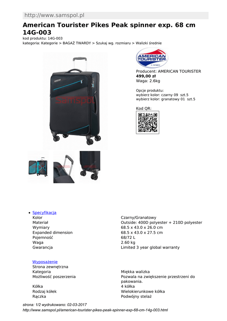 http://www.samspol.pl American Tourister Pikes Peak spinner exp. 68 cm 14G-003 kod produktu: 14G-003 kategoria: Kategorie > BAGAŻ TWARDY > Szukaj wg. rozmiaru > Walizki średnie Producent: AMERICAN TOURISTER 499,00 zł Waga: 2.6kg Opcje produktu: wybierz kolor: czarny 09 szt.5 wybierz kolor: granatowy 01 szt.5 Kod QR: Specyfikacja Kolor Materiał Wymiary Expanded dimension Pojemność Waga Gwarancja Wyposażenie Strona zewnętrzna Kategoria Możliwość poszerzenia Kółka Rodzaj kółek Rączka Czarny/Granatowy Outside: 400D polyester + 210D polyester 68.5 x 43.0 x 26.0 cm 68.5 x 43.0 x 27.5 cm 68/72 L 2.60 kg Limited 3 year global warranty Miękka walizka Pozwala na zwiększenie przestrzeni do pakowania. 4 kółka Wielokierunkowe kółka Podwójny stelaż strona: 1/2 wydrukowano: 02-03-2017 http://www.samspol.pl/american-tourister-pikes-peak-spinner-exp-68-cm-14g-003.html Rączki Zamek Suwaki Kieszenie zewnętrzne Wnętrze Organizer w formie przegródek Pasy spinające Kieszeń górna Kieszeń dolna Rączki na górze, z boku i na spodzie Zintergrowany zamek szyfrowy TSA dla wygodnej podróży do USA, oraz ochrony Twoich rzeczy. Tak 2 kieszenie z przodu W górnym przedziale bagażowym, z kieszonką W górnym i dolnym przedziale bagażowym Przedział z pasami spinającymi. strona: 2/2 wydrukowano: 02-03-2017 http://www.samspol.pl/american-tourister-pikes-peak-spinner-exp-68-cm-14g-003.html