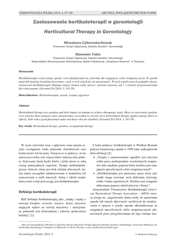 GERONTOLOGIA 2014, 4, 97-158 180 MIROSŁAWAPOLSKA CYLKOWSKA-NOWAK, SŁAWOMIR TOBIS ARTYKUŁ POGLĄDOWY/REVIEW PAPER Zastosowanie hortikuloterapii w gerontologii Horticultural Therapy in Gerontology Mirosława Cylkowska-Nowak Pracownia Terapii Zajęciowej, Katedra Geriatrii i Gerontologii Sławomir Tobis Pracownia Terapii Zajęciowej, Katedra Geriatrii i Gerontologii Wojewódzkie Stowarzyszenie Wolontariuszy Opieki Paliatywnej „Hospicjum Domowe” w Poznaniu Streszczenie Hortikuloterapia wykorzystuje ogrody i ich oddziaływanie na człowieka dla osiągnięcia celów terapeutycznych. W sposób mniej lub bardziej świadomy korzystano z nich w tych celach już od starożytności. W myśl współczesnych poglądów obszar zastosowań hortikuloterapii obejmuje między innymi osoby starsze: zarówno sprawne, jak i z różnymi niesprawnościami lub schorzeniami. (Gerontol Pol 2014, 3, 143-58) Słowa kluczowe: Horticuloterapia, ogrody, terapia zajęciowa Abstract Horticultural therapy uses gardens and their impact on humans to achieve therapeutic goals. More or consciously gardens were used for these purposes since ancient times. according to current views horticultural therapy applies among others to elderly, both with a good functional status and those who are disabled. (Gerontol Pol 2014, 3, 143-58) Key words: Horticultural therapy, gardens, occupational therapy W życiu człowieka wraz z upływem czasu narasta ryzyko wystąpienia wielu jednostek chorobowych oraz konieczności ich leczenia. Oznacza to w praktyce, że im starsza jest osoba, tym więcej leków statystycznie pobiera. Zażywanie dużej liczby leków z kolei niesie ze sobą szereg potencjalnych zagrożeń. Terapie niefarmakologiczne, których zaletą jest brak działań ubocznych, budzą zatem szczególne zainteresowanie w kontekście ich zastosowania u osób starszych. Jedną z takich terapii, którą warto wziąć pod uwagę, jest hortikuloterapia. Definicja hortikuloterapii Relf definiuje hortikuloterapię jako „sztukę i naukę o rozwoju kwiatów, owoców, warzyw, drzew, krzewów mających wpływ na rozwój umysłowy i emocjonalny jednostek oraz doskonalenie i zdrowie społeczności ludzkiej” [1]. Z kolei praktycy hortikuloterapii w Wielkiej Brytanii podczas branżowego zjazdu w 1999 roku zaakceptowali dwie definicje [2]: · „Terapia z zastosowaniem ogrodów jest użyciem roślin przez profesjonalnie wyszkolonych terapeutów jako medium, poprzez które możliwe jest osiągnięcie specyficznych celów terapeutycznych”. · „Hortikuloterapia jest procesem, przez który jednostki mogą rozwinąć swój dobrostan używając roślin i kultur ogrodowych. Możliwe jest osiąganie dobrostanu poprzez udział aktywny i bierny”. Amerykańskie Towarzystwo Hortikuloterapii (American Horticultural Therapy Association – AHTA) zwraca uwagę na „angażowanie danej osoby do uprawiania ogrodu lub innych aktywności możliwych do zrealizowania w oparciu o zasoby ogrodu, ukierunkowane na osiągnięcie specyficznych celów terapeutycznych, planowanych przez przygotowanego do tego rodzaju tera- Adres do korespondencji: Mirosława Cylkowska-Nowak; Pracownia Terapii Zajęciowej Katedra Geriatrii i Gerontologii, Uniwersytet Medyczny im. Karola Marcinkowskiego w Poznaniu; ul. Bukowska 70, 60-812 Poznań,; e-mail: [email protected] Gerontologia Polska, 2014, 4 Ó Akademia Medycyny ZASTOSOWANIE HORTIKULOTERAPII W GERONTOLOGII pii terapeutę, będącego członkiem multiprofesjonalnego zespołu terapeutycznego” [3]. Z kolei Haller i Kramer akcentują w swej definicji sytuowanie osoby terapeutyzowanej w centrum procesu i uważają, że hortikuloterapia jest „profesjonalnie prowadzoną, zorientowaną na kliencie terapią wspomagającą, która wykorzystuje aktywności w ogrodzie do osiągnięcia specyficznych celów terapeutycznych lub rehabilitacyjnych jej uczestników” [4]. Ogrody z ich naturalnym potencjałem same w sobie stanowią miejsca, w których można rozwijać terapię. Różnorodność form i metod pracy, które mogą być podejmowane w ogrodzie lub wokół czyni zeń narzędzie diagnozy (zasobów, możliwości), przestrzeń terapii (relaksacji, rozładowywania napięć, uwalniania emocji, aktywizacji) oraz pozwala rozwijać prognozę na przyszłość [5]. Hortikulterapia może być wdrażana wobec populacji o różnorodnej charakterystyce oraz w różnych miejscach. Simson and Straus wyróżniają trzy zasadnicze typy programów hortikuloterapeutycznych: uzawodawiający, uspołeczniający i terapeutyczny. Program uzawodawiający kierowany jest do więźniów, osób z zaburzeniami rozwoju, chorobami psychicznymi lub osób z problemami społeczno-ekonomicznymi. Dwa pozostałe programy stosowane są wobec osób z chorobami psychicznymi, fizycznymi, osób uzależnionych, osób starszych [6]. Historia leczenia przy użyciu zasobów ogrodów Pozytywny wpływ ogrodów na człowieka znany był już w starożytności. W starożytnej Mezopotamii (około 2000 lat p.n.e.) tworzono ogrody w dolinie Tygrysa i Eufratu. Były to zarówno ogrody zamknięte, otoczone murami, jak i otwarte parki krajobrazowe. Unikalnym pomysłem tej cywilizacji były także ogrody wiszące. Wśród roślin dominowały cyprysy, palmy, winorośl, sosny, cedry i lotosy. Rośliny rosnące w pobliżu budowli mieszkalnych lub na budowlach, ich barwy, zapachy miały łagodzić wpływ warunków klimatycznych i nastrajać mieszkańców pozytywnie [7]. Z kolei w starożytnym Egipcie osoby zajmujące się leczeniem zalecały spacery w ogrodach chorym z problemami mentalnymi. Wykorzystywane były także lecznicze właściwości różnych roślin. Osoby leczące często studiowały botanikę, po to by móc lepiej pomagać chorym [8]. Od około 500 roku p.n.e. zapoczątkowano celowe tworzenie ogrodów dla zapewnienia przebywającym w nich osobom oddziaływania piękna, zapachu, dźwięków (np. płynącej wody) oraz naturalnego chłodu. Święty Bernard opisywał na przeło
