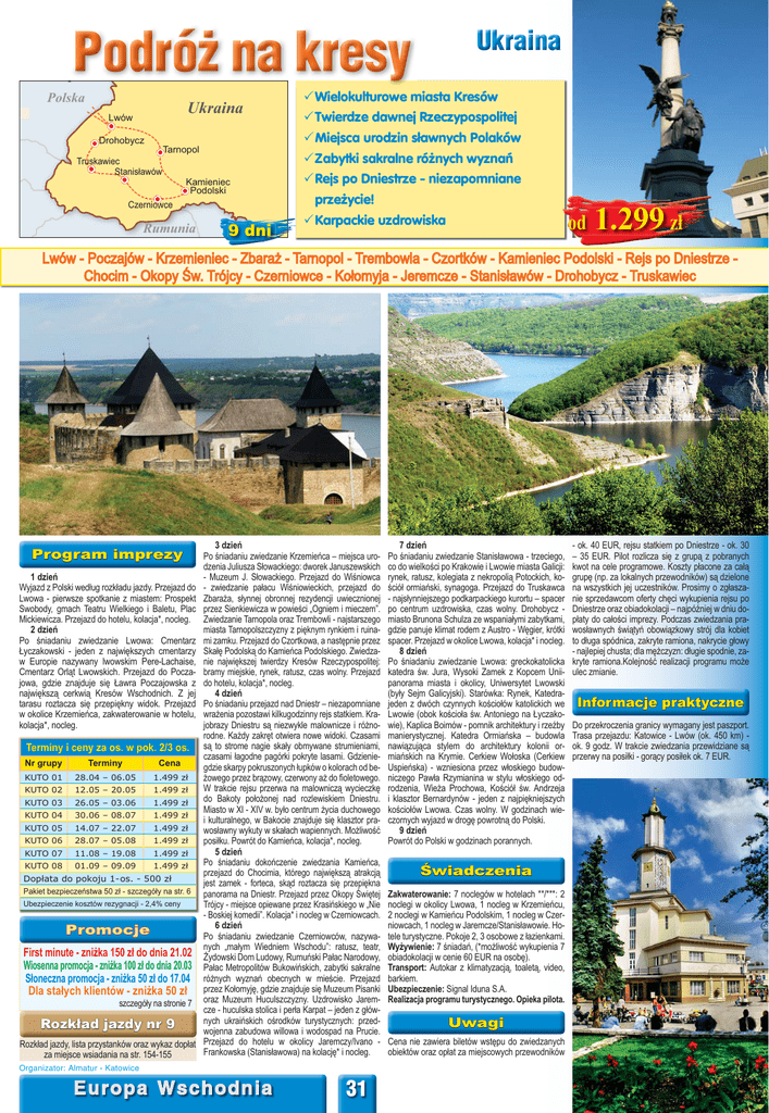 Podróż na kresy Polska Ukraina Lwów Twierdze dawnej Rzeczypospolitej Miejsca urodzin sławnych Polaków Drohobycz Tarnopol Zabytki sakralne różnych wyznań Truskawiec Stanisławów Kamieniec Podolski Czerniowce Rumunia Wielokulturowe miasta Kresów 9 dni Rejs po Dniestrze - niezapomniane przeżycie! Karpackie uzdrowiska od 1.299 zł Lwów - Poczajów - Krzemieniec - Zbaraż - Tarnopol - Trembowla - Czortków - Kamieniec Podolski - Rejs po Dniestrze Chocim - Okopy Św. Trójcy - Czerniowce - Kołomyja - Jeremcze - Stanisławów - Drohobycz - Truskawiec Program imprezy 1 dzień Wyjazd z Polski według rozkładu jazdy. Przejazd do Lwowa - pierwsze spotkanie z miastem: Prospekt Swobody, gmach Teatru Wielkiego i Baletu, Plac Mickiewicza. Przejazd do hotelu, kolacja*, nocleg. 2 dzień Po śniadaniu zwiedzanie Lwowa: Cmentarz Łyczakowski - jeden z największych cmentarzy w Europie nazywany lwowskim Pere-Lachaise, Cmentarz Orląt Lwowskich. Przejazd do Poczajowa, gdzie znajduje się Ławra Poczajowska z największą cerkwią Kresów Wschodnich. Z jej tarasu roztacza się przepiękny widok. Przejazd w okolice Krzemieńca, zakwaterowanie w hotelu, kolacja*, nocleg. Terminy i ceny za os. w pok. 2/3 os. Nr grupy Terminy Cena KUTO 01 28.04 – 06.05 1.499 zł KUTO 02 12.05 – 20.05 1.499 zł KUTO 03 26.05 – 03.06 1.499 zł KUTO 04 30.06 – 08.07 1.499 zł KUTO 05 14.07 – 22.07 1.499 zł KUTO 06 28.07 – 05.08 1.499 zł KUTO 07 11.08 – 19.08 1.499 zł KUTO 08 01.09 – 09.09 1.499 zł Dopłata do pokoju 1-os. - 500 zł Pakiet bezpieczeństwa 50 zł - szczegóły na str. 6 Ubezpieczenie kosztów rezygnacji - 2,4% ceny Promocje First minute - zniżka 150 zł do dnia 21.02 Wiosenna promocja - zniżka 100 zł do dnia 20.03 Słoneczna promocja - zniżka 50 zł do 17.04 Dla stałych klientów - zniżka 50 zł szczegóły na stronie 7 Rozkład jazdy nr 9 Rozkład jazdy, lista przystanków oraz wykaz dopłat za miejsce wsiadania na str. 154-155 3 dzień Po śniadaniu zwiedzanie Krzemieńca – miejsca urodzenia Juliusza Słowackiego: dworek Januszewskich - Muzeum J. Słowackiego. Przejazd do Wiśniowca - zwiedzanie pałacu Wiśniowieckich, przejazd do Zbaraża, słynnej obronnej rezydencji uwiecznionej przez Sienkiewicza w powieści „Ogniem i mieczem”. Zwiedzanie Tarnopola oraz Trembowli - najstarszego miasta Tarnopolszczyzny z pięknym rynkiem i ruinami zamku. Przejazd do Czortkowa, a następnie przez Skałę Podolską do Kamieńca Podolskiego. Zwiedzanie największej twierdzy Kresów Rzeczypospolitej: bramy miejskie, rynek, ratusz, czas wolny. Przejazd do hotelu, kolacja*, nocleg. 4 dzień Po śniadaniu przejazd nad Dniestr – niezapomniane wrażenia pozostawi kilkugodzinny rejs statkiem. Krajobrazy Dniestru są niezwykle malownicze i różnorodne. Każdy zakręt otwiera nowe widoki. Czasami są to strome nagie skały obmywane strumieniami, czasami łagodne pagórki pokryte lasami. Gdzieniegdzie skarpy pokruszonych łupków o kolorach od beżowego przez brązowy, czerwony aż do fioletowego. W trakcie rejsu przerwa na malowniczą wycieczkę do Bakoty położonej nad rozlewiskiem Dniestru. Miasto w XI - XIV w. było centrum życia duchowego i kulturalnego, w Bakocie znajduje się klasztor prawosławny wykuty w skałach wapiennych. Możliwość posiłku. Powrót do Kamieńca, kolacja*, nocleg. 5 dzień Po śniadaniu dokończenie zwiedzania Kamieńca, przejazd do Chocimia, którego największą atrakcją jest zamek - forteca, skąd roztacza się przepiękna panorama na Dniestr. Przejazd przez Okopy Świętej Trójcy - miejsce opiewane przez Krasińskiego w „Nie - Boskiej komedii”. Kolacja* i nocleg w Czerniowcach. 6 dzień Po śniadaniu zwiedzanie Czerniowców, nazywanych „małym Wiedniem Wschodu”: ratusz, teatr, Żydowski Dom Ludowy, Rumuński Pałac Narodowy, Pałac Metropolitów Bukowińskich, zabytki sakralne różnych wyznań obecnych w mieście. Przejazd przez Kołomyję, gdzie znajduje się Muzeum Pisanki oraz Muzeum Huculszczyzny. Uzdrowisko Jaremcze - huculska stolica i perła Karpat – jeden z głównych ukraińskich ośrodków turystycznych: przedwojenna zabudowa willowa i wodospad na Prucie. Przejazd do hotelu w okolicy Jaremczy/Ivano Frankowska (Stanisławowa) na kolację* i nocleg. Organizator: Almatur - Katowice Europa Wschodnia 31 7 dzień Po śniadaniu zwiedzanie Stanisławowa - trzeciego, co do wielkości po Krakowie i Lwowie miasta Galicji: rynek, ratusz, kolegiata z nekropolią Potockich, kościół ormiański, synagoga. Przejazd do Truskawca - najsłynniejszego podkarpackiego kurortu – spacer po centrum uzdrowiska, czas wolny. Drohobycz miasto Brunona Schulza ze wspaniałymi zabytkami, gdzie panuje klimat rodem z Austro - Węgier, krótki spacer. Przejazd w okolice Lwowa, kolacja* i nocleg. 8 dzień Po śniadaniu zwiedzanie Lwowa: greckokatolicka katedra św. Jura, Wysoki Zamek z Kopcem Uniipanorama miasta i okolicy, Uniwersytet Lwowski (były Sejm Galicyjski). Starówka: Rynek, Katedrajeden z dwóch czynnych kościołów katolickich we Lwowie (obok kościoła św. Antoniego na Łyczakowie), Kaplica Boimów - pomnik architektury i rzeźby manierystycznej. Katedra Ormiańska – budowla nawiązująca stylem do architektury kolonii ormiańskich na Krymie. Cerkiew Wołoska (Cerkiew Uspieńska) - wzniesiona przez włoskiego budowniczego Pawła Rzymianina w stylu włoskiego odrodzenia, Wieża Prochowa, Kościół św. Andrzeja i klasztor Bernardynów - jeden z najpiękniejszych kościołów Lwowa. Czas wolny. W godzinach wieczornych wyjazd w drogę powrotną do Polski. 9 dzień Powrót do Polski w godzinach porannych. Świadczenia Zakwaterowanie: 7 noclegów w hotelach **/***: 2 noclegi w okolicy Lwowa, 1 nocleg w Krzemieńcu, 2 noclegi w Kamieńcu Podolskim, 1 nocleg w Czerniowcach, 1 nocleg w Jaremcze/Stanisławowie. Hotele turystyczne. Pokoje 2, 3 osobowe z łazienkami. Wyżywienie: 7 śniadań, (*możliwość wykupienia 7 obiadokolacji w cenie 60 EUR na osobę
