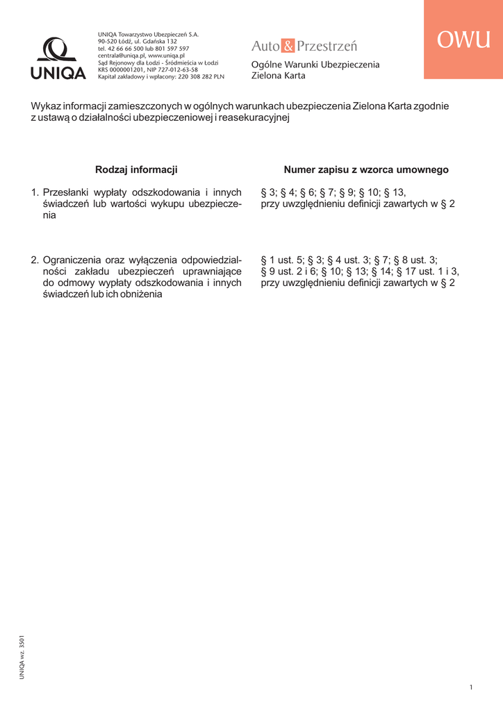UNIQA Towarzystwo Ubezpieczeń S.A. 90-520 Łódź, ul. Gdańska 132 tel. 42 66 66 500 lub 801 597 597 [email protected], www.uniqa.pl Sąd Rejonowy dla Łodzi - Śródmieścia w Łodzi KRS 0000001201, NIP 727-012-63-58 Kapitał zakładowy i wpłacony: 220 308 282 PLN Auto & Przestrzeń OWU Ogólne Warunki Ubezpieczenia Zielona Karta Wykaz informacji zamieszczonych w ogólnych warunkach ubezpieczenia Zielona Karta zgodnie z ustawą o działalności ubezpieczeniowej i reasekuracyjnej Rodzaj informacji Numer zapisu z wzorca umownego § 3; § 4; § 6; § 7; § 9; § 10; § 13, przy uwzględnieniu definicji zawartych w § 2 2. Ograniczenia oraz wyłączenia odpowiedzialności zakładu ubezpieczeń uprawniające do odmowy wypłaty odszkodowania i innych świadczeń lub ich obniżenia § 1 ust. 5; § 3; § 4 ust. 3; § 7; § 8 ust. 3; § 9 ust. 2 i 6; § 10; § 13; § 14; § 17 ust. 1 i 3, przy uwzględnieniu definicji zawartych w § 2 UNIQA wz. 3501 v.2 - 2015.12.22 - ALAGIERSKA Lidia - WERSJA NIE PRZEZNACZONA DO OBSŁUGI UBEZPIECZEŃ 1. Przesłanki wypłaty odszkodowania i innych świadczeń lub wartości wykupu ubezpieczenia 1 lub naczepa złączona była z pojazdem lub odłączyła się od pojazdu ciągnącego i jeszcze się toczyła. Rozdział 1 Postanowienia ogólne §1 1. Niniejsze ogólne warunki ubezpieczenia, zwane dalej OWU, stanowią integralną część umów ubezpieczenia odpowiedzialności cywilnej posiadaczy pojazdów mechanicznych za szkody powstałe w związku z ruchem tych pojazdów w określonych w polisie krajach należących do Systemu Zielonej Karty, zwane dalej OC ZK,zawieranych na ich podstawie pomiędzy UNIQA Towarzystwo Ubezpieczeń S.A., zwane dalej UNIQA TU S.A., a osobami fizycznymi, osobami prawnymi lub jednostkami organizacyjnymi nie posiadającymi osobowości prawnej, zwanymi dalej Ubezpieczającymi. 2. Ubezpieczający może zawrzeć umowę ubezpieczenia także na cudzy rachunek. 3. Osobą, na rachunek której zawiera się umowę ubezpieczenia jest posiadacz pojazdu mechanicznego, zwany dalej Ubezpieczonym. 4. W sprawach nieuregulowanych niniejszymi OWU zastosowanie mają przepisy powszechnie obowiązującego prawa, w tym kodeksu cywilnego, ustawy o działalności ubezpieczeniowej, ustawy o ubezpieczeniach obowiązkowych, Ubezpieczeniowym Funduszu Gwarancyjnym i Polskim Biurze Ubezpieczycieli Komunikacyjnych z zastrzeżeniem, iż zakres udzielanej ochrony ubezpieczeniowej odpowiada wymaganiom przepisów prawa obowiązujących w państwie, na terytorium którego miał miejsce wypadek. 5. UNIQA Towarzystwo Ubezpieczeń S.A. z siedzibą w Łodzi (90-520) przy ul. Gdańskiej 132 w związku z zawartą umową ubezpieczenia OC ZK informuje, że: 1) jest Administratorem powierzonych mu danych osobowych; 2) powierzone dane osobowe będą wykorzystywane oraz przetwarzane wyłącznie w prawnie uzasadnionym celu, przez który rozumie się: a) obsługę i wykonywanie umowy ubezpieczenia, b) rozliczenia z pośrednikami ubezpieczeniowymi, c) cele analityczne i archiwalne, d) marketing bezpośredni produktów i usług własnych przez UNIQA Towarzystwo Ubezpieczeń S.A., e) obsługę Programu Lojalnościowego UNIQA BonusClub, o ile Ubezpieczający/Ubezpieczony wyraził wolę uczestnictwa w tym programie; 3) Ubezpieczający/Ubezpieczony zachowuje prawo dostępu do danych osobowych oraz ich poprawiania. Rozdział 2 Definicje §2 1. W rozumieniu niniejszych ogólnych warunków ubezpieczenia pojęcia użyte w OWU otrzymują następujące znaczenie: 1) Contact Center UNIQA - jednostka organizacyjna UNIQA TU S.A. przyjmująca telefonicznie zgłoszenia szkód. Telefon kontaktowy do Contact Center UNIQA 801 597 597 (dla telefonów stacjonarnych) lub +48 42 66 66 500 (dla tel. komórkowych) podany jest na polisie potwierdzającej zawarcie umowy ubezpieczenia; 2) Pojazdy mechaniczne - pojazdy podlegające rejestracji w Rzeczpospolitej Polskiej, stosownie do przepisów ustawy prawo o ruchu drogowym; 3) Ubezpieczający - osoba zawierająca umowę ubezpieczenia i zobowiązana do opłacenia składki ubezpieczeniowej; 4) Ubezpieczony - posiadacz pojazdu, na rzecz którego została zawarta umowa ubezpieczenia. 5) Wypadek - zdarzenie wynikające z ruchu pojazdów, na skutek którego nastąpiła śmierć lub uszkodzenie ciała osoby lub osób, lub uszkodzenie mienia; 3. Zasadę określoną w ust. 2 stosuje się również w razie złączenia pojazdów w celu holowania. Rozdział 4 Zawarcie umowy ubezpieczenia §4 1. Umowę zawiera się na wniosek Ubezpieczającego. 2. Zawarcie umowy ubezpieczenia OC ZK potwierdza się polisą oraz wydaje się Międzynarodową Kartę Ubezpieczenia Samochodowego (Zielona Karta). 3. Warunkiem zawarcia umowy ubezpieczenia OC ZK jest zawarcie umowy ubezpieczenia OC posiadaczy pojazdów mechanicznych w UNIQA TU S.A. na ten sam pojazd. 4. W przypadku zawarcia umowy na cudzy rachunek, Ubezpieczony może żądać, aby UNIQA TU S.A. udzieliło mu informacji o postanowieniach zawartej umowy ubezpieczenia oraz ogólnych warunków ubezpieczenia w zakresie, w jakim dotyczą praw i obowiązków Ubezpieczonego. 5. Ubezpieczający/Ubezpieczony jest zobowiązany do: 1) podania do wiadomości UNIQA TU S.A. wszelkich znanych sobie okoliczności, o które UNIQA TU S.A. zapytywało we wniosku ubezpieczeniowym albo przed zawarciem umowy w innych pismach; 2) zgłaszania w formie pisemnej do UNIQA TU S.A. w czasie trwania umowy ubezpieczenia, wszelkich zmian w okolicznościach, o których mowa w pkt. 1, niezwłocznie po otrzymaniu o nich wiadomości. 6. Jeżeli Ubezpieczający zawiera umowę przez przedstawiciela, obowiązki określone w ust. 4 ciążą również na przedstawicielu i obejmują ponadto okoliczności jemu znane. Rozdział 5 Odstąpienie od umowy ubezpieczenia §5 1. Jeżeli umowa ubezpieczenia jest zawarta na okres dłuższy niż 6 miesięcy, Ubezpieczający ma prawo odstąpienia od umowy ubezpieczenia w terminie 30 dni, a w przypadku gdy Ubezpieczający jest przedsiębior