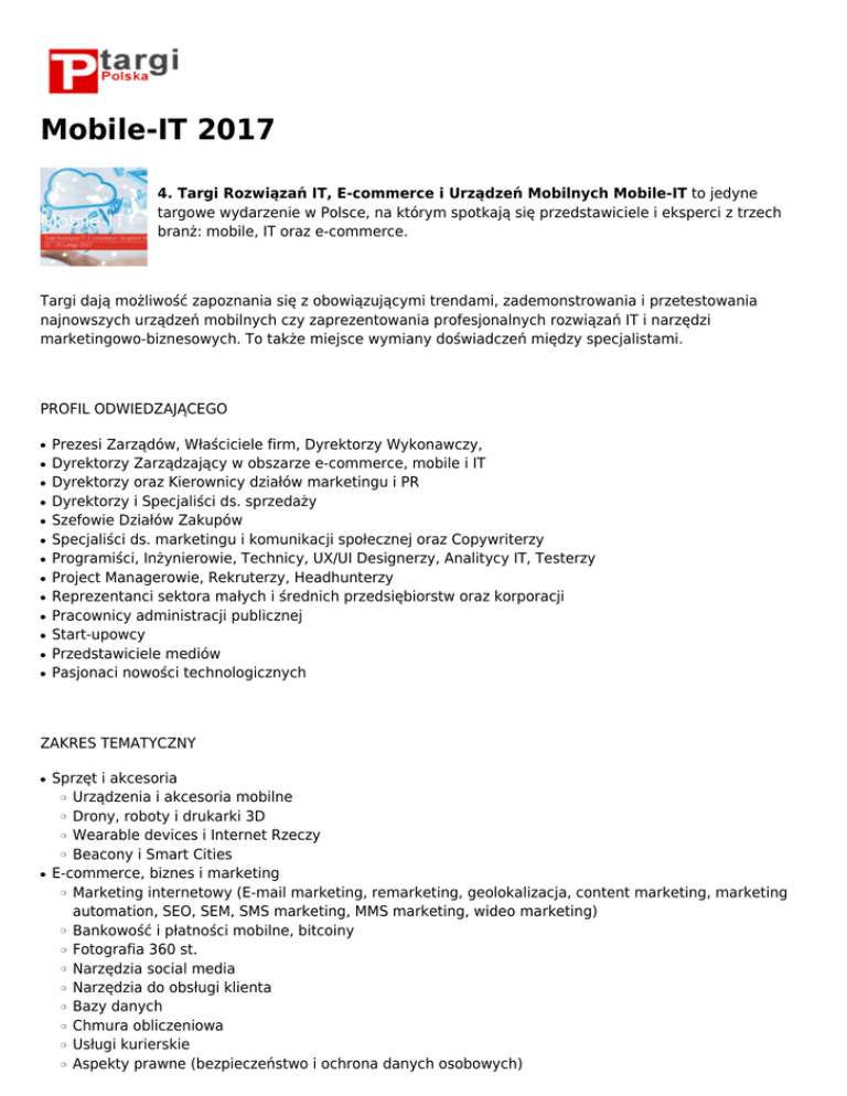Mobile-IT 2017 4. Targi Rozwiązań IT, E-commerce i Urządzeń Mobilnych Mobile-IT to jedyne targowe wydarzenie w Polsce, na którym spotkają się przedstawiciele i eksperci z trzech branż: mobile, IT oraz e-commerce. Targi dają możliwość zapoznania się z obowiązującymi trendami, zademonstrowania i przetestowania najnowszych urządzeń mobilnych czy zaprezentowania profesjonalnych rozwiązań IT i narzędzi marketingowo-biznesowych. To także miejsce wymiany doświadczeń między specjalistami. PROFIL ODWIEDZAJĄCEGO ● ● ● ● ● ● ● ● ● ● ● ● ● Prezesi Zarządów, Właściciele firm, Dyrektorzy Wykonawczy, Dyrektorzy Zarządzający w obszarze e-commerce, mobile i IT Dyrektorzy oraz Kierownicy działów marketingu i PR Dyrektorzy i Specjaliści ds. sprzedaży Szefowie Działów Zakupów Specjaliści ds. marketingu i komunikacji społecznej oraz Copywriterzy Programiści, Inżynierowie, Technicy, UX/UI Designerzy, Analitycy IT, Testerzy Project Managerowie, Rekruterzy, Headhunterzy Reprezentanci sektora małych i średnich przedsiębiorstw oraz korporacji Pracownicy administracji publicznej Start-upowcy Przedstawiciele mediów Pasjonaci nowości technologicznych ZAKRES TEMATYCZNY ● Sprzęt i akcesoria Urządzenia i akcesoria mobilne Drony, roboty i drukarki 3D Wearable devices i Internet Rzeczy Beacony i Smart Cities E-commerce, biznes i marketing Marketing internetowy (E-mail marketing, remarketing, geolokalizacja, content marketing, marketing automation, SEO, SEM, SMS marketing, MMS marketing, wideo marketing) Bankowość i płatności mobilne, bitcoiny Fotografia 360 st. Narzędzia social media Narzędzia do obsługi klienta Bazy danych Chmura obliczeniowa Usługi kurierskie Aspekty prawne (bezpieczeństwo i ochrona danych osobowych) ❍ ❍ ❍ ❍ ● ❍ ❍ ❍ ❍ ❍ ❍ ❍ ❍ ❍ ● Oprogramowanie Systemy operacyjne Programy graficzne Bezpieczeństwo sieci Dla biznesu Producenci oprogramowania Aplikacje mobilne Dla biznesu M-learning, m-health Multimedia Logistyka, transport, komunikacja Rozrywka i lifestyle Gry mobilne Infrastruktura sieciowa Serwery Sieci GSM i urządzenia Wi-Fi Systemy RFID VPN, VoiP Strefy specjalne Strefa start-up Strefa gier i rozrywki Strefa kariery ❍ ❍ ❍ ❍ ❍ ● ❍ ❍ ❍ ❍ ❍ ❍ ● ❍ ❍ ❍ ❍ ● ❍ ❍ ❍ Godziny otwarcia: 22 lutego 2017 (środa): 10:00 – 16:00 23 lutego 2017 (czwartek): 10:00 – 16:00 Miejsce targów Kraków Galicyjska 9 Organizator Targi w Krakowie Kraków Galicyjska 9 12 644 59 32 www.targi.krakow.pl [email protected]