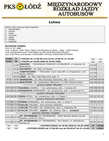 Łotwa Każda cyfra oznacza dzień tygodnia: 1 - poniedziałek 2 - wtorek 3 - środa 4 - czwartek 5 - piątek 6 - sobota 7 - niedziela Eurolines Polska Kurs nr: E – 614 Linia: Kraków- Łodź- Riga- Tallinn- St.Petersburg-Tallinn – Riga – Łódź-Kraków Linia obsługiwana przez: BIACOMEX SA,VEOLIA EUROLINES POLSKA, oraz przez firmy partnerskie: EUROLINES LATIVIA, EUROLINES ESTONIA 12467 5 z POLSKI do 17.06.08 oraz od 01.10.08 do 31.10.08 13467 25 --:-- 11:00 --:-- 12:40 KATOWICE - dw. PKS, ul.P.Skargi --:-- 14:20 --:-- 16:30 ŁÓDŹ - dw. PKS, Łódź Fabryczna, stan. 9 z POLSKI od 18.06.2008 do 30.09.2008 KRAKÓW - * REGIONALNY DWORZEC AUTOBUSOWY, ul. Bosacka 18, płyta górna CZĘSTOCHOWA - * McDonalds`s przy stacji BP, ul. Drogowców 1 (od strony TESCO) +16:30 --:-+14:50 --:-+13:20 --:-+11:20 --:-- 19:00 19:00 WARSZAWA - dw. PKS Warszawa Zachodnia, stan. 13-14 +09:00 +09:00 22:20 22:20 BIAŁYSTOK - dw. autobusowy "Biacomex", ul. Boh. Monte Cassino +05:40 +05:40 ----------------granica polsko-litewska------------------------+03:10 +03:10 KAUNAS (KOWNO) - * dw. autobusowy, stan. 1 Vytauto 38 +02:45 +02:45 +04:50 +04:50 PANEVEZYS (PONIEWIEŻ) - dw. autobusowy, stan. 1 Savanorju 6-5 +00:55 +00:55 -------------------granica litewsko-łotewska-------------------------+08:30 +08:30 RIGA (RYGA) - dw. autobusowy, stan. 2, Pragas 1 22:10 22:10 ---------------------granica łotewsko-estońska---------------------------+11:20 +11:20 PÄRNU (PARNAWA) - dw. autobusowy, stan. 1, Ringi 3 +13:00 +13:00 TALLIN (TALLINN) - port promowy (Helsinki) 18:55 18:55 --:-- --:-- +13:15 +13:15 TALLIN (TALLINN) - dw. autobusowy, stan. 1, Lastekodu 46 17:00 17:00 +14:30 +14:30 TALLIN (TALLINN) - wyjazd - dw. autobus. stan 1 - przyjazd 13:35 13:35 -------------------granica estońsko-rosyjska------------------------------------+23:10 +23:10 ST. PETERSBURG (ST. PETERSBURG) - Baltic Railway Station (przyst. autobus. przed dw. kolej.) 07:15 07:15 +23:35 +23:35 ST. PETERSBURG (ST. PETERSBURG) - Bus Station, ul. Obwodnowo Kanala 36 06:45 06:45 z ESTONII/ROSJI od 18.06.2008 do 29.09.2008 z ESTONII/ROSJI do 17.06.08 oraz od 30.09.07 do 31.10.08 37 12556 3 12567 1 • - Zakaz sprzedaży: Kraków, Częstochowa - Kaunas (Kowno) Informacja o przesiadkach: Uprzejmie informujemy, że w Rydze przewidziana jest przesiadka dla pasażerów jadących z i do miast PARNU, Tallinn oraz PETERSBURG W Tallinie jest przewidziana dodatkowa przesiadka dla pasażerów jadących do i z Petersburga. ZASADY SPRZEDAŻY BILETÓW NA TRASIE: POLSKA - ESTONIA WARSZAWA - RYGA - WARSZAWA EUROLINES POLSKA ZNIŻKI: NA TEJ TRASIE NIE OBOWIĄZUJĄ ŻADNE ZNIŻKI. UWAGA: Dzieci i młodzież do lat 16 mogą podróżować tylko pod opieką osoby dorosłej. Młodzież w wieku 16-18 lat może podróżować bez osoby dorosłej, lecz tylko za okazaniem poświadczonej notarialnie zgody obojga rodziców (lub opiekunów) na samodzielną podróż z adnotacją zawierającą telefon bądź adres kontaktowy osoby zapraszającej, bądź na podstawie odpowiedniego "Upoważnienia na przewóz osób", przygotowanego w tym celu przez Eurolines Polska. BILETY Bilet jest imiennym dokumentem uprawniającym do przejazdu i nie może być odstąpiony innej osobie. Sprzedaż biletów na tej linii odbywa się tylko w jednym kierunku. ZMIANA TERMINU PODRÓŻY Zmiana terminu podróży do 1-go dnia przed wyjazdem: - w Polsce 20,00 PLN - w Estonii równowartość 5,00 USD W dniu wyjazdu zmiana terminu jest niemożliwa. ZWROTY - W przypadku rezygnacji z przejazdu do 4 dni przed terminem odjazdu zwraca się równowartość ceny biletu po potrąceniu 10 %. - W przypadku rezygnacji z przejazdu między 4 - 1 dniem przed terminem odjazdu zwraca się równowartość ceny biletu po potrąceniu 50 %. - W przypadku niewykorzystania 1-go kierunku jazdy dla biletu 2-stronnego, zwrotowi podlega różnica cen biletu dwukierunkowego i jednokierunkowego pomniejszona o 10 %. - W dniu wyjazdu nie uznaje się żadnych zwrotów. BAGAŻ Dopuszczalny bagaż opłacony w cenie biletu - 1 sztuka bagażu zasadniczego do luku Bagażowego do 25 kg (o wymiarach łącznych 160 cm) oraz 1 sztuka bagażu podręcznego do 5 kg. Dodatkowy bagaż (nadbagaż) zabierany jest zawsze w miarę wolnego miejsca w lukach i jest płatny za każdą dodatkową sztukę. Przewożenie zwierząt w autokarze jest zabronione. PRZEDSPRZEDAŻ I INFORMACJE W POLSCE: - Biuro Turystyczne PKS w Łodzi Plac Sałacińskiego 1 - Dw. Fabryczny tel. 042 631-92-30 - Punkt sprzedaży biletów m.narodowych w Pabianicach ul. Kilińskiego 1 - SDH "Trzy Korony" tel. 042 215-25-53 - Punkt Usług na ul. Smugowej 26 (Wydział Praw Jazdy i Rejestracji Pojazdów). tel. 42) 638 59 91 REZERWACJE NA ŁOTWIE: - Ryga, Międzynarodowy Dworzec Ryski, ul. Pragas 1, tel. 78-20-238 - Daugavpils, DAP, Karklu Ilea 24, tel. 00371 54-29-822 - Telefon awaryjny 0604-904-487 2 ECOLINES tel Tel.: +48 22 610 33 66 Linia nr:1003 TRASA POLSKA – LITWA – ŁOTWA – Polska 135 13:30 17:55 20:30 21:55 23:35 +01:05 +01:45 Wyjazdy z Polski Rozkład ważny od 01.04.2008 r. WROCŁAW – Dw. Autobusowy PKS ŁÓDŹ – Dworzec Autobusowy PKS Łódź Fabryczna, ST. 9 WARSZAWA – Dworzec PKS Warszawa Zachodnia, al. Jerozolimskie 144, ST.13,14 OSTRÓW MAZOWIECKA - ul. Piłata 3, przy Dworcu PKS BIAŁYSTOK - Dworzec Autobusowy, ul. Monte Cassino 8, ST. 1 AUGUSTÓW – Parking przy ul. Kościelnej SUWAŁKI – ul. Utrata ( przy Dworcu PKS) +16:50 +09:25 +06:45 +05:20 +03:50 +02:20 +01:40 -----------------------------------granica polsko - litewska-(zmiana czasu)----------------------------- +04:15 +05:15 +06:45 +08:50 MARIJAMPOLE - dw. autobusowy KAUNAS (KOWNO) - dw. autobusowy VILNIUS (WILNO) - dw. Autobusowy, ul. Sodu 22, ST 18,19,20 PANEVEZYS (Poniewież) – Dw. Autobusowy ST.13 +01:00 23:55 22:25 20:30 ----------------------------------------Granica litewsko – łotewska------------------------------------------- +11:15 RIGA (Ryga) - dworzec autobusowy, st. 2, Pragas 1 Wyjazdy z 