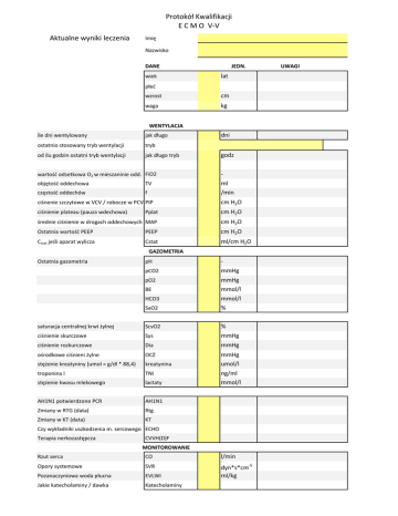 ProtokółKwalifikacji ECMOV-V Aktualnewynikileczenia Imię Nazwisko DANE wiek JEDN. lat płeć wzrost cm waga kg WENTYLACJA iledniwentylowany jakdługo ostatniostosowanytrybwentylacji tryb odilugodzinostatnitrybwentylacji jakdługotryb wartośćodsetkowaO2wmieszaninieodd. FiO2 objętośćoddechowa TV częstośćoddechów f dni godz ml /min ciśnenieszczytowewVCV/roboczewPCV PIP cmH2O ciśnienieplateau(pauzawdechowa) Pplat cmH2O średnieciśnieniewdrogachoddechowych MAP cmH2O OstatniawartośćPEEP PEEP cmH2O Cstatjeśliaparatwylicza Cstat ml/cmH2O GAZOMETRIA Ostatniagazometria pH - pCO2 mmHg mmHg mmol/l mmol/l % pO2 BE HCO3 SaO2 saturacjacentralnejkrwiżylnej ScvO2 ciśnienieskurczowe Sys % mmHg ciśnienierozkurczowe Dia mmHg ośrodkoweciśnieniżylne OCŻ stężeniekreatyniny[umol=g/dl*88,4) kreatynina mmHg umol/l troponinaI TNI stężeniekwasumlekowego lactaty AH1N1potwierdzonePCR AH1N1 ZmianywRTG(data) Rtg ZmianywKT(data) KT ng/ml mmol/l Czywykładnikiuszkodzeniam.sercowego ECHO Terapianerkozastępcza CVVH(D)F MONITOROWANIE Rzutserca CO l/min Oporysystemowe SVR Pozanaczyniowawodapłucna EVLWI dyn*s*cm-5 ml/kg Jakiekatecholaminy/dawka Katecholaminy UWAGI ProtokółKwalifikacji ECMOV-V Pytaniaodotychczasoweleczenie ZASADYWENTYLACJIOSZCZEDZAJĄCEJ(LungProtectiveStrategyLPS) TRYB PEEP VCV TV<=6ml/kg oTAKoNIE Pplateau<30cmH2O oTAKoNIE trybciśnieniowy permisywne↑pCO2 oTAKoNIE PCV/BiLevel-BiPAP Pplateau>30cmH2O oTAKoNIE miareczkowaniePEEP(5-10-20cmH2O)dooptymalnychwartości: PaO2/FiO2 MRP jeżeli lub Cstat ManewrRekrutacjiPłuc oTAKoNIE co4-8godz. oTAKoNIE 1.PIPmax40cmH20/PEEP30cmH2O/20sek oTAKoNIE 2.wdechTinsp20sek/PIP40cmH2O/2razy oTAKoNIE TRYBY próbazastosowaniaalternatywnychtrybówwentylacji oTAKoNIE alternatywne oPCVoIRVoAPRVowentoscylacyjnaoinne oTAKoNIE PRONE Ocenaleczeniawpozycjinabrzuchu oTAKoNIE JeślipoprawaPaO2/FiO2-proneposition2xdobępo6godz oTAKoNIE POZYCJA Pozycjapółsiedząca 30-45o oTAKoNIE toaletazużyciemBronchofiberoskopii oTAKoNIE ManewrRekrutacjipokażdymrozłączeniuukładuodd.? oTAKoNIE NO Próbaoptymalizacjawziewnąpodażątlenkuazotu(NO) oTAKoNIE SEDACJA Adekwatnasedacja/codziennaocenagłębokościs. oTAKoNIE zwiotczenieprzybrakusynchronizacjizwentylacją oTAKoNIE metylprednizolon0,5-2,5mg.kgm.c.Przez7dni? oTAKoNIE biopsja-wykładnikizwłóknieniapłuc? oTAKoNIE Monitorowaniepłynoterapii oTAKoNIE Ocenapodatnościnaprzetoczenie(SVV/∆SV/ECHO) oTAKoNIE Termodilucjaprzezpłucna(EV100/PICCO)-EVLWI??? Czystosowanoterapięnerkozastępczą oTAKoNIE MonitorowanieHemodynamiczne oTAKoNIE Swan-Ganz;PICCO/EV100; Echokardiografia? oTAKoNIE TechnikiograniczająceVAP oTAKoNIE TOALETA STERYDY CRRT MH VAP antybiotykoterapia;unikaniereintubacji;pozycjaciała intubacjaisondażołądkowaprzezusta;kontrolaglikemii odsysanieznadmankietururkiintubacyjnej profilaktykachorobywrzodowejorazzakrzepicyżyłgłębokich codzienneprzerwywsedacji;szybkieżywieniedojelitowe oTAKoNIE oTAKoNIE ProtokółKwalifikacji ECMOV-V Kryteriawłączenia GŁÓWNE 1 PaO2/FiO2<70mmHg oraz PEEP>=10cmH2O conajmniej2godz. DODATKOWE 2 pH<7,2 oraz paCO2>80mmHg oTAKoNIE 3 Cstat<0,5ml/kg/cmH2O 4 PIP>40cmH2O przy oTAKoNIE TV<=6ml/kg oTAKoNIE 5 OxygenationIndex >60przez0,5godz >35przez6godz 6 Rozległezacienieniewconajmniej2kwadrantachpłuc oTAKoNIE 7 PunktacjawskaliMurraya(LIS)>3,0 oTAKoNIE OI=(MAPxFiO2x100)/PaO2 oTAKoNIE Kryteriatlenowe Indekstlenowy IT=PaO2/FiO2 IT zPEEP +5cmH2O <300-mildARDS <200-moderateARDS <100-severeARDS Zmodyfikowany OxygenationIndex OI=(MAPxFiO2x100)/PaO2 AaDO2 AaDO2=PAO2-PaO2 OI >60przez1/2godz lub>35przez6godz AaDO2 >620mmHgprzez4godz lub>605mmHgprzez12godz PAO2=(Patm-PH2O)xFiO2-PaCO2/RQ Przeciwwskazania NIEODWRACALNOŚĆprocesuchorobowego Ciężkachorobaukładowa Znacznegostopniaimmunosupresja Krwawieniewewnątrzczaszkowe Innep/wskazaniadoheparynizacji Leczenierespiratoremwięcejniż7-10dni BrakmożliwościleczeniawgzasadLungProtectiveStrategy Brakzgodychorego Wiekpowyżej65r.ż. oTAKoNIE oTAKoNIE oTAKoNIE oTAKoNIE oTAKoNIE oTAKoNIE oTAKoNIE oTAKoNIE oTAKoNIE oTAKoNIE