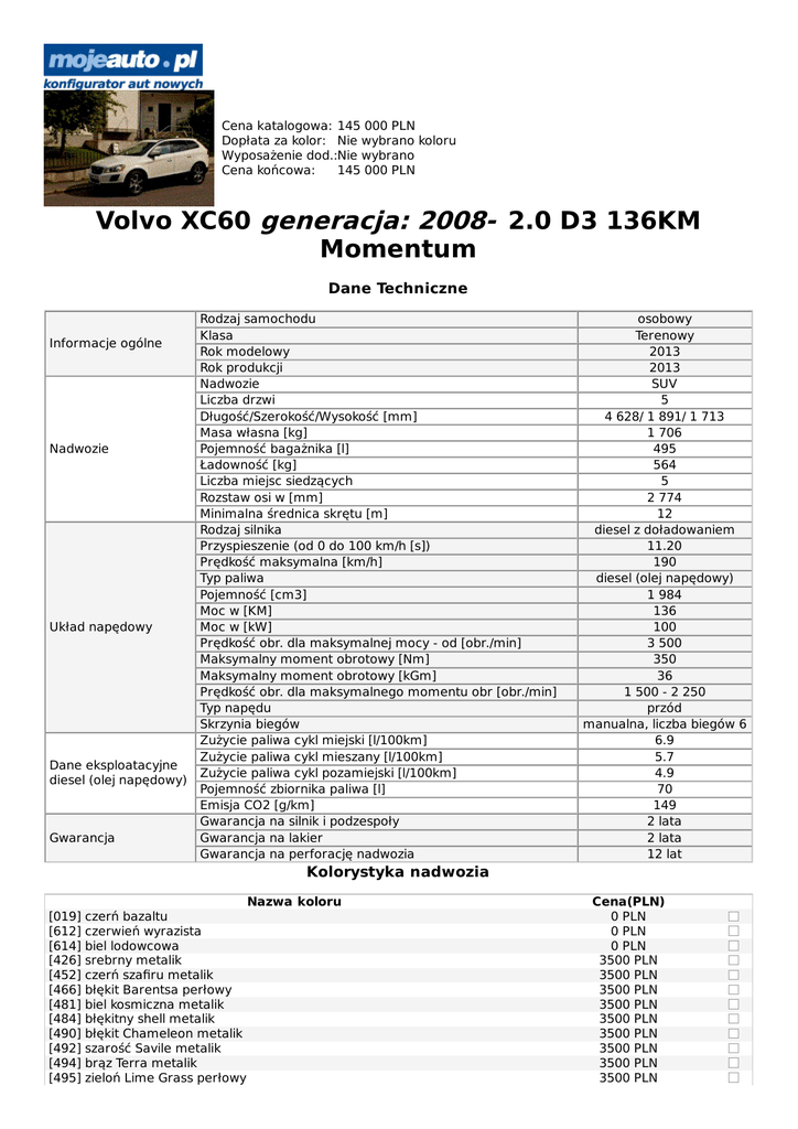 Cena katalogowa: 145 000 PLN Dopłata za kolor: Nie wybrano koloru Wyposażenie dod.:Nie wybrano Cena końcowa: 145 000 PLN Volvo XC60 generacja: 2008- 2.0 D3 136KM Momentum Dane Techniczne Informacje ogólne Nadwozie Układ napędowy Dane eksploatacyjne diesel (olej napędowy) Gwarancja Rodzaj samochodu Klasa Rok modelowy Rok produkcji Nadwozie Liczba drzwi Długość/Szerokość/Wysokość [mm] Masa własna [kg] Pojemność bagażnika [l] Ładowność [kg] Liczba miejsc siedzących Rozstaw osi w [mm] Minimalna średnica skrętu [m] Rodzaj silnika Przyspieszenie (od 0 do 100 km/h [s]) Prędkość maksymalna [km/h] Typ paliwa Pojemność [cm3] Moc w [KM] Moc w [kW] Prędkość obr. dla maksymalnej mocy - od [obr./min] Maksymalny moment obrotowy [Nm] Maksymalny moment obrotowy [kGm] Prędkość obr. dla maksymalnego momentu obr [obr./min] Typ napędu Skrzynia biegów Zużycie paliwa cykl miejski [l/100km] Zużycie paliwa cykl mieszany [l/100km] Zużycie paliwa cykl pozamiejski [l/100km] Pojemność zbiornika paliwa [l] Emisja CO2 [g/km] Gwarancja na silnik i podzespoły Gwarancja na lakier Gwarancja na perforację nadwozia osobowy Terenowy 2013 2013 SUV 5 4 628/ 1 891/ 1 713 1 706 495 564 5 2 774 12 diesel z doładowaniem 11.20 190 diesel (olej napędowy) 1 984 136 100 3 500 350 36 1 500 - 2 250 przód manualna, liczba biegów 6 6.9 5.7 4.9 70 149 2 lata 2 lata 12 lat Kolorystyka nadwozia Nazwa koloru [019] [612] [614] [426] [452] [466] [481] [484] [490] [492] [494] [495] czerń bazaltu czerwień wyrazista biel lodowcowa srebrny metalik czerń szafiru metalik błękit Barentsa perłowy biel kosmiczna metalik błękitny shell metalik błękit Chameleon metalik szarość Savile metalik brąz Terra metalik zieloń Lime Grass perłowy Cena(PLN) 0 PLN 0 PLN 0 PLN 3500 PLN 3500 PLN 3500 PLN 3500 PLN 3500 PLN 3500 PLN 3500 PLN 3500 PLN 3500 PLN [702] czerwony Flamenco metalik [477] srebrny Electric metalic 3500 PLN 4400 PLN Wyposażenie standardowe Nazwa elementu 17" obręcze ze stopów lekkich SEGIN 235/65 R17 5 trzypunktowych pasów bezpieczeństwa z napinaczami dla wszystkich miejsc 6 poduszek powietrznych: dla kierowcy i pasażera, dwie poduszki boczne (dwukomorowe), kurtyny powietrzne (IC) AQS (system poprawy jakości powietrza w kabinie) autoalarm VOLVO GUARD z czujnikiem przechyłu, układem podwójnego blokowania oraz masowym czujnikiem ruchu barwione szyby boczne światła obrysowe chromowane listwy na dolnej linii szyb bocznych City Safety - układ wspomagania hamowania czujnik deszczu dodatkowe gniazdo elektryczne (12V) w przestrzeni bagażowej dwie końcówki układu wydechowego (chromowane) elektryczna regulacja ustawienia świateł elektrycznie regulowane i podgrzewane lusterka zewnętrzne elektrycznie składane lusterka zewnętrzne z układem oświetlenia podłoża elektrycznie sterowana pokrywa bagażnika (zamykanie/otwieranie) elektrycznie sterowane szyby boczne z przodu i z tyłu z funkcją opuszczania i domykania filtr cząstek stałych DPF gniazdo 12V w przedniej i tylnej części konsoli centralnej gniazdo elektryczne 12V w przestrzeni bagażowej immobilizer ze zmiennym kodem kierownica regulowana w dwóch płaszczyznach kierownica skórzana z elementami aluminium klimatyzacja sterowana elektronicznie (ECC - Electronic Climate Control) klucz zintegrowany z pilotem centralnego zamka (KIR - Key Integrated Remote) komputer pokładowy z komunikatami w języku polskim nawiewy w słupkach środkowych (słupki B) oddzielna regulacja temperatury dla kierowcy i pasażera ograniczniki siły dla pasów bezpieczeństwa przednich foteli oświetlenie asekuracyjne Home Safe oświetlenie podłoża w lusterkach bocznych ozdobne obudowy lusterek zewnętrznych podgrzewane dysze spryskiwacza podłokietnik przedni podłokietnik tylny z uchwytami na kubki i schowkiem podświetlane lusterka wewnętrzne dla kierowcy i pasażera podświetlany i zamykany schowek na rękawiczki przeciwpyłkowy filtr powietrza relingi dachowe (zintegrowane) w kolorze czarnym roleta bagażnika RSC - układ stabilizacji przechyłu ROLL STABILITY CONTROL samoczynnie przyciemniające się lusterko wsteczne schowek pod podłogą bagażnika (zamknięcie pokrywy bagażnika blokuje dostęp do schowka) schowek w konsoli centralnej i w przednich drzwiach siatka przestrzeni bagażowej (jednoczęściowa) składane oparcie fotela pasażera skórzane poszycie dźwigni zmiany biegów sportowe tarcze wskaźników sportowe zawieszenie sterowanie audio w kierownicy strefy kontrolowanego zgniotu sygnalizacja niezapiętych pasów bezpieczeństwa dla wszystkich miejsc system inteligentnego informowania kierowcy (IDIS - Intelligent Driver Information System) system mocowania fotelika ISOFIX dla zewnętrznych miejsc tylnej kanapy system zabezpieczeń przed skutkami uderzeń bocznych (SIPS) system zabezpieczeń przed urazami kręgosłupa szyjnego (WHIPS) światła przednie Volvo DNA (LED) tapicerka tekstylna T- tech Eriksberg trójdzielna kanapa tylna (dzielona w proporcjach 40/20/40) trzecie, dodatkowe światło stopu uchwyt na torbę w bagażniku układ ABS z elektronicznym układem rozdziału sił hamowania EBD układ automatycznej kontroli prędkości układ EBL (Emergency Brake Light) - ostrzeganie innych użytkowników drogi o gwałtownym hamowaniu układ kontroli stabilności dynamicznej kontroli trakcji (DSTC - Dynamic Stability and Traction Control) układ szybkiego nagrzewania wnętrza PTC (POSITIVE TEMPERATURE CONTROL) układ wspomagania nagłego hamowania EBA układ wspomagania parkowania tyłem - PARK ASSIST wskaźnik temperatury zewnętrznej wykończenie wnętrza aluminium wyłącznik poduszki powietrznej pasażera wyświetlacz radia z komunikatami w języku polskim zamykany wlew paliwa zdalnie sterowany zamek centralny zestaw audio HIGH PERFORMANCE 4x40W, 8 głośników, 1CD/MP3, USB zestaw głośnomówiący Bluetooth zestaw naprawczy zamiast koła zapasowego zestaw wskaźników CHRONO złącze AUX do zewnętrznych urządzeń a