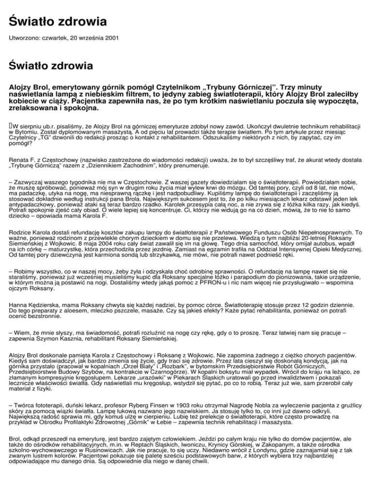 Światło zdrowia Utworzono: czwartek, 20 września 2001 Światło zdrowia Alojzy Brol, emerytowany górnik pomógł Czytelnikom „Trybuny Górniczej”. Trzy minuty naświetlania lampą z niebieskim filtrem, to jedyny zabieg światłoterapii, który Alojzy Brol zaleciłby kobiecie w ciąży. Pacjentka zapewniła nas, że po tym krótkim naświetlaniu poczuła się wypoczęta, zrelaksowana i spokojna. W sierpniu ub.r. pisaliśmy, że Alojzy Brol na górniczej emeryturze zdobył nowy zawód. Ukończył dwuletnie technikum rehabilitacji w Bytomiu. Został dyplomowanym masażystą. A od pięciu lat prowadzi także terapie światłem. Po tym artykule przez miesiąc Czytelnicy „TG” dzwonili do redakcji prosząc o kontakt z rehabilitantem. Odszukaliśmy niektórych z nich, by zapytać, czy im pomógł? Renata F. z Częstochowy (nazwisko zastrzeżone do wiadomości redakcji) uważa, że to był szczęśliwy traf, że akurat wtedy dostała „Trybunę Górniczą” razem z „Dziennikiem Zachodnim”, który prenumeruje. – Zazwyczaj waszego tygodnika nie ma w Częstochowie. Z waszej gazety dowiedziałam się o światłoterapii. Powiedziałam sobie, że muszę spróbować, ponieważ mój syn w drugim roku życia miał wylew krwi do mózgu. Od tamtej pory, czyli od 8 lat, nie mówi, ma padaczkę, utyka na nogę, ma niesprawną rączkę i jest nadpobudliwy. Kupiliśmy lampę do światłoterapii i zaczęliśmy ją stosować dokładnie według instrukcji pana Brola. Największym sukcesem jest to, że po kilku miesiącach lekarz odstawił jeden lek antypadaczkowy, ponieważ ataki są teraz bardzo rzadko. Karolek przesypia całą noc, a nie zrywa się z łóżka kilka razy, jak kiedyś. Potrafi spokojnie zjeść cały obiad. O wiele lepiej się koncentruje. Ci, którzy nie widują go na co dzień, mówią, że to nie to samo dziecko – opowiada mama Karola F. Rodzice Karola dostali refundację kosztów zakupu lampy do światłoterapii z Państwowego Funduszu Osób Niepełnosprawnych. To ważne, ponieważ rodzinom z przewlekle chorym dzieckiem w domu się nie przelewa. Wiedzą o tym najbliżsi 20-letniej Roksany Siemieńskiej z Wojkowic. 8 maja 2004 roku cały świat zawalił się im na głowę. Tego dnia samochód, który omijał autobus, wpadł na ich córkę – maturzystkę, która przechodziła przez jezdnię. Zamiast na egzamin trafiła na Oddział Intensywnej Opieki Medycznej. Od tamtej pory dziewczyna jest karmiona sondą lub strzykawką, nie mówi, nie potrafi nawet podnieść ręki. – Robimy wszystko, co w naszej mocy, żeby żyła i odzyskała choć odrobinę sprawności. O refundację na lampę nawet się nie staraliśmy, ponieważ już wcześniej musieliśmy kupić dla Roksany specjalne łóżko i parapodium do pionizowania, takie urządzenie, w którym można ją postawić na nogi. Dostaliśmy wtedy jakąś pomoc z PFRON-u i nic nam więcej nie przysługiwało – wspomina ojczym Roksany. Hanna Kędzierska, mama Roksany chwyta się każdej nadziei, by pomoc córce. Światłoterapię stosuje przez 12 godzin dziennie. Do tego preparaty z aloesem, mleczko pszczele, masaże. Czy są jakieś efekty? Każe pytać rehabilitanta, ponieważ on potrafi ocenić bezstronnie. – Wiem, że mnie słyszy, ma świadomość, potrafi rozluźnić na nogę czy rękę, gdy o to proszę. Teraz łatwiej nam się pracuje – zapewnia Szymon Kasznia, rehabilitant Roksany Siemieńskiej. Alojzy Brol doskonale pamięta Karola z Częstochowy i Roksanę z Wojkowic. Nie zapomina żadnego z ciężko chorych pacjentów. Kiedyś sam doświadczył, jak bardzo zmienia się życie, gdy traci się zdrowie. Przez lata cieszył się doskonałą kondycją, jak na górnika przystało (pracował w kopalniach „Orzeł Biały” i „Rozbark”, w bytomskim Przedsiębiorstwie Robót Górniczych, Przedsiębiorstwie Budowy Szybów, na kontrakcie w Czarnogórze). W kopalni boksytu miał wypadek. Wrócił do kraju na leżąco, ze złamanym kompresyjnie kręgosłupem. Lekarze „urazówki” w Piekarach Śląskich uratowali go przed inwalidztwem i pokazali lecznicze właściwości światła. Gdy naświetlali mu kręgosłup, wstydził się pytać, po co to robią. Teraz już wie, sam przerobił cały materiał z fizyki. – Twórca fototerapii, duński lekarz, profesor Ryberg Finsen w 1903 roku otrzymał Nagrodę Nobla za wyleczenie pacjenta z gruźlicy skóry za pomocą wiązki światła. Lampę łukową nazwano jego nazwiskiem. Ja stosuję tylko to, co inni już dawno odkryli. Największą radość sprawia mi, gdy komuś ulżę w cierpieniu. Lubię też prelekcje o światłoterapii, które często prowadzę na przykład w Ośrodku Profilaktyki Zdrowotnej „Górnik” w Łebie – zapewnia technik rehabilitacji i masażysta. Brol, odkąd przeszedł na emeryturę, jest bardzo zajętym człowiekiem. Jeździ po całym kraju nie tylko do domów pacjentów, ale także do ośrodków rehabilitacyjnych, m.in. w Reptach Śląskich, Iwoniczu, Krynicy Górskiej, w Zakopanym, a także ośrodka szkolno-wychowawczego w Rusinowicach. Jak nie pracuje, to się uczy. Niedawno wrócił z Londynu, gdzie zaznajamiał się z tak zwanym lustrem kolorów. Pacjentowi pokazuje się paletę sześciu podstawowych barw, z których wybiera trzy najbardziej odpowiadające mu danego dnia. Są odpowiednie dla niego w danej chwili. – Stosuję dwa rodzaje terapii światłem. Metodą systemiczną, w której pacjent patrzy na zapaloną lampę i przez jego oczy stymulujemy funkcjonowanie całego organizmu. Natomiast przez naświetlanie miejscowe, na przykład bolącego kolana – zmniejszamy dolegliwość i przyspieszamy leczenie zmienionego chorobowo organu – mówi Brol Rehabilitant zapewnia, że zabiegi przez oczy wspomagają układ immunologiczny. Ma tabelę z 200 schorzeniami, które można łagodzić, bądź leczyć światłem. Dobiera odpowiedniej barwy filtry dla każdego pacjenta. Światło niebieskie wycisza, łagodzi napięcia nerwowe i stany zapalne