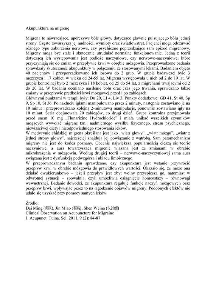 Akupunktura na migrenę Migrena to nawracające, uporczywe bóle głowy, dotyczące głownie pulsującego bólu jednej strony. Często towarzyszą jej nudności, wymioty oraz światłowstręt. Pacjenci mogą odczuwać różnego typu zaburzenia nerwowe, czy psychiczne poprzedzające sam epizod migrenowy. Migreny mogą być stałe i skutecznie utrudniać normalne funkcjonowanie. Jedną z teorii dotyczącą ich występowania jest podłoże naczyniowe, czy nerwowo-naczyniowe, które przyczyniają się do zmian w przepływie krwi w obrębie mózgowia. Przeprowadzone badania sprawdzały skuteczność akupunktury w połączeniu ze stosowanymi lekami. Badaniem objęto 40 pacjentów i przyporządkowano ich losowo do 2 grup. W grupie badawczej było 3 mężczyzn i 17 kobiet, w wieku od 24-55 lat. Migrena występowała u nich od 2 do 19 lat. W grupie kontrolnej było 2 mężczyzn i 18 kobiet, od 25 do 54 lat, z migrenami trwającymi od 2 do 20 lat. W badaniu oceniano nasilenie bólu oraz czas jego trwania, sprawdzano także zmiany w przepływie prędkości krwi mózgowej przed i po zabiegach. Głównymi punktami w terapii były: Du 20, LI 4, Liv 3. Punkty dodatkowe: GD 41, St 40, Sp 9, Sp 10, St 36. Po nakłuciu igłami manipulowano przez 2 minuty, następnie zostawiano je na 10 minut i przeprowadzano kolejną 2-minutową manipulację, ponownie zostawiano igły na 10 minut. Seria obejmowała 20 zabiegów, co drugi dzień. Grupa kontrolna przyjmowała przed snem 10 mg „Flunarizine Hydrochloride” i miała unikać wszelkich czynników mogących wywołać migrenę tzn.: nadmiernego wysiłku fizycznego, stresu psychicznego, niewłaściwej diety i nieodpowiedniego stosowania leków. W medycynie chińskiej migrena określana jest jako „wiatr głowy”, „wiatr mózgu”, „wiatr z jednej strony głowy”, najczęściej znajdują jej powiązanie z wątrobą. Sam patomechanizm migreny nie jest do końca poznany. Obecnie największą popularnością cieszą się teorie naczyniowe, a aura towarzysząca migrenie wiązana jest ze zmianami w obrębie mikrokrążenia w mózgowiu. Według drugiej teorii – nerwowo-naczyczyniowej sama aura związana jest z dysfunkcją podwzgórza i układu limbicznego. W przeprowadzanym badaniu sprawdzano, czy akupunktura jest wstanie przywrócić przepływ krwi w obrębie mózgowia do prawidłowych wartości. Okazało się, że może ona działać dwukierunkowo – jeżeli przepływ jest zbyt wolny przyspiesza go, natomiast w odwrotnej sytuacji – spowalnia, czyli umożliwia osiągnięcie homeostazy – równowagi wewnętrznej. Badanie dowodzi, że akupunktura reguluje funkcje naczyń mózgowych oraz przepływ krwi, wpływając przez to na łagodzenie objawów migreny. Podobnych efektów nie udało się uzyskać przy pomocy samych leków. Źródło: Dai Ming (戴明), Jin Miao (靳淼), Shen Weina (沈维娜) Clinical Observation on Acupuncture for Migraine J. Acupunct. Tuina. Sci. 2011, 9 (2): 84-87