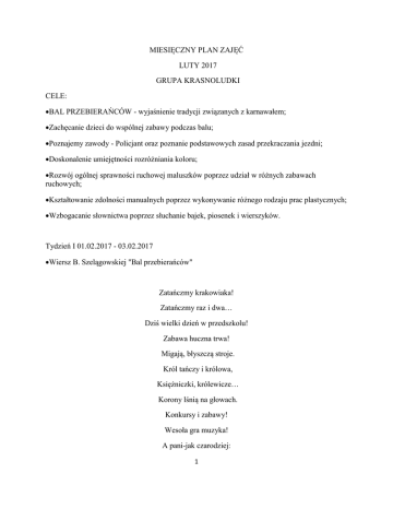 MIESIĘCZNY PLAN ZAJĘĆ LUTY 2017 GRUPA KRASNOLUDKI CELE: BAL PRZEBIERAŃCÓW - wyjaśnienie tradycji związanych z karnawałem; Zachęcanie dzieci do wspólnej zabawy podczas balu; Poznajemy zawody - Policjant oraz poznanie podstawowych zasad przekraczania jezdni; Doskonalenie umiejętności rozróżniania koloru; Rozwój ogólnej sprawności ruchowej maluszków poprzez udział w różnych zabawach ruchowych; Kształtowanie zdolności manualnych poprzez wykonywanie różnego rodzaju prac plastycznych; Wzbogacanie słownictwa poprzez słuchanie bajek, piosenek i wierszyków. Tydzień I 01.02.2017 - 03.02.2017 Wiersz B. Szelągowskiej "Bal przebierańców" Zatańczmy krakowiaka! Zatańczmy raz i dwa… Dziś wielki dzień w przedszkolu! Zabawa huczna trwa! Migają, błyszczą stroje. Król tańczy i królowa, Księżniczki, królewicze… Korony lśnią na głowach. Konkursy i zabawy! Wesoła gra muzyka! A pani-jak czarodziej: 1 Tu zjawia się, tam znika! Raz! Dzieci robią kółko! Dwa! szybko tworzą łańcuch! To nie jest zwykły bal. To bal jest przebierańców! Zabawa ruchowa do piosenki "W karnawale" Doroty Gellner; Prezentacja strojów - rozpoznajemy postacie na podstawie strojów karnawałowych i kostiumów; Zabawa przy muzyce – swobodny taniec w rytm słyszanej melodii, taniec w parach, pociąg i inne; Zabwawa "Pożegnanie" – sprawdzenie czy wszystkie części ciała są na miejscu: Ręce – machamy Nogi – tupiemy Głowa – potrząsamy Bioderka – kręcimy; Praca plastyczna. Tydzień II 06.02.2017 - 10.02.2017 Poznanie na czym polega praca Policjanta (kim jest i czym się zajmuje, narzędzia i charakterystyczny ubiór.); Co należy zrobić, aby być bezpiecznym? - rozmowa o zasadach bezpiecznego poruszania się po drodze; Wiersz "Światła na skrzyżowaniu" W. Faber: Niech każdy stanie przed skrzyżowaniem, palą się światła - popatrz na nie. Światło czerwone, jak mak, jak ogień- wszystkim przechodniom zamyka drogę. .A światło żółte, jak liść w jesieni ostrzega- spiesz się, bo ruch się zmieni. Światło zielone, jak młode listki na drugą stronę zaprasza wszystkich Zabawa ruchowa „Pan Policjant porządku pilnuje i ruchem drogowym kieruje” - z wykorzystaniem piosenek: "Kolorowe światła", "Pan policjant"; 2 Wierszyk "Różne zawody" Katarzyna Tomiak-Zaremba: W różnych zawodach ludzie pracują, wiele czynności wciąż wykonują. (kręcenie "młynka" dłońmi) Szewc podeszwy do butów przybija, (stukanie pięścią, jak młotkiem, w dłoń) krawcowa igłą sprawnie wywija. (przekładanie palców slalomem pomiędzy rozstawionymi palcami drugiej) Malarz pędzlem na płótnie maluje, (naśladowanie trzymania paletkiz farbami i malowanie) piekarz chleb z pieca łopatą wyjmuje. (przesuwanie otwartą dłonią w przód i tył); Praca plastyczna Tydzień III 13.02.2017 - 17.02.2017 Zabawa na powitanie „Mam taki kolor”; Kolor czerwony - rozmowa z czym kojarzy się kolor czerwony; Zabawa ruchowa "Szukaj czerwonej zabawki"; Zabawa z chustą animacyjną oraz matą edukacyjną "Znajdź czerwony kolor"; Praca plastyczna. Tydzień IV 20.02.2017 - 28.02.2017 Tropem zwierząt - rozpoznajemy ślady pozostawione na śniegu; Zabawa - przyporządkuj ślady do zwierząt, które je zostawiły; 3 Opowieść ruchowa: "Wybieramy się do lasu"; Zabawa "Zimno mi w ..." opiekunka mówi: Zimno mi w ręce. Dzieci rozgrzewają swoje ręce pocierając nimi. Następnie opiekunka wymienia kolejno poszczególne części ciała ręce, paluszki, uszy, stopy, kolana, nos, dzieci pocierają wymienione części ciała; Praca plastyczna. Justyna Doleżych 4