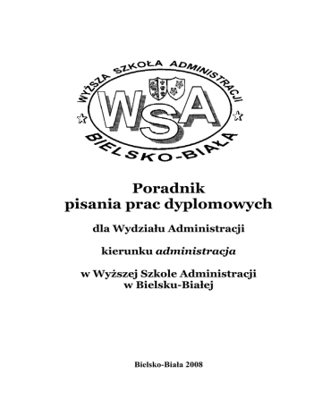 Poradnik pisania prac dyplomowych dla Wydziału Administracji kierunku administracja w Wyższej Szkole Administracji w Bielsku-Białej Bielsko-Biała 2008 I. Celem pracy dyplomowej jest wykazanie przez studenta umięjętności w zakresie: - formułowania pod kierunkiem promotora tematu badań oraz wyodrębniania w jego zakresie poszczególnych zagadnień mających być przedmiotem dalszej analizy; - samodzielnego prowadzenia kwerendy w literaturze przedmiotu i – w miarę potrzeby – prowadzenia badań źródłowych wraz z analizą źródeł; - zebrania materiału wyczerpującego założoną problematykę i uporządkowania go w spo-sób systematyczny; - łączenia analizy cudzych poglądów z przedstawieniem własnego stanowiska; - samodzielnego konstruowania rozbudowanej wielowątkowej wypowiedzi w formie pisemnej; - opanowania podstaw warsztatu naukowego, w tym zasad cytowania, posługiwania się przypisami, tworzenia bibliografii; - zapewnienia wywodom spójności i logicznego charakteru; - operowania poprawnym językiem, wolnym od błędów formalnych (ortograficznych i interpunkcyjnych). Praca dyplomowa musi być samodzielnym opracowaniem autorstwa studenta, przygotowanym przy pomocy promotora. Student jako autor ponosi pełną odpowiedzialność z tytułu oryginalności i rzetelności zaprezentowanego materiału i powinien uwzględniać wszelkie prawa i dobre obyczaje w tym zakresie. II. - W związku z powyższymi założeniami obok wymagań merytorycznych wobec pracy, których treść kształtuje w każdym przypadku promotor, pojawiają się ogólne oczekiwania formalne. Prace dyplomowe powinny: być zbudowane logicznie i w sposób adekwatny do tematu; wykorzystywać ilość publikacji naukowych, faktograficznych oraz źródeł odpowiednią do realizacji założeń badawczych; posiadać objętość wystarczającą dla pełnej analizy założonych zagadnień i wykazania się założonymi umiejętnościami; zawierać ilość przypisów o zróżnicowanym charakterze pozwalającą na stwierdzenie opanowania podstaw warsztatu naukowego; być poprawne pod względem językowym. III. - - Promotorzy i recenzenci opiniujący prace dyplomowe zwracają uwagę na zawartość treściową pracy i na stopień realizacji wymagań formalnych. W szczególności odnotowują: prawidłowość budowy planu i konsekwencję jego wdrożenia w treści pracy; odpowiednią wielkość pracy, zależną od tematu pracy; ilość wykorzystanych pozycji bibliografii i spisu źródeł, a także stron internetowych, zależną od tematu pracy; ilość przypisów (zależną od tematu pracy) oraz ich poprawność wedle jednolicie stosowanego w pracy jednego ze standardów obowiązujących w naukach humanistycznych; jakość języka; 2 - zewnętrzny kształt pracy, estetykę wydruku, a także prawidłowość paginacji, właściwy kształt bibliografii itd. IV. 1. Struktura i konstrukcja pracy struktura powinna być następująca: Strona tytułowa pracy (uczelnia, wydział, kierunek studiów, tytuł pracy, autor/autorzy, promotor, miejsce, rok). Dokładniej, strona tytułowa pracy (pierwsza strona pracy) powinna zawierać w/g wzoru: WYŻSZA SZKOŁA ADMINISTRACJI w Bielsku-Białej Wydział Administracji kierunek administracja JAN KOWALSKI POSTĘPOWANIE ODWOŁAWCZE Praca dyplomowa napisana pod kierunkiem ........................................ Bielsko-Biała 2008 3 2. 3. Spis treści Wstęp, zawierający podrozdział „Cel i zakres pracy”, tj. streszczenie specyfikacji wymagań promotora 4. Rozdział(y) teoretyczny – przegląd literatury naświetlający stan wiedzy na dany temat, 5. Rozdziały dokumentujące pracę własną studenta (rozdziały opisujące ideę / sposób / metodę rozwiązania postawionego problemu oraz rozdziały opisujące techniczną stronę rozwiązania (dokumentacja techniczna) 6. lub opisujące przeprowadzone testy / badania i uzyskane wyniki) 7. Zakończenie, zawierające podsumowanie uzyskanych wyników 8. literatura 9. dodatki Praca powinna mieć wyraźnie określony cel i sposób realizacji, powinna charakteryzować się zwięzłością i logicznym układem oraz właściwą proporcją między poszczególnymi częściami (rozdziałami) pracy. Wkład pracy dyplomanta powinien mieć odzwierciedlenie w rozmiarach poszczególnych rozdziałów. Tytuł pracy, a także tytuł każdego rozdziału musi być adekwatny do treści zawartych w pracy lub w rozdziale. Tytuł pracy, jak i tytuły rozdziałów powinny mieć charakter problemowy. Treść pracy dzieli się na rozdziały i podrozdziały, a ich układ musi być oparty na zasadzie wynikania. Każdy rozdział powinien zaczynać się od nowej strony (nie dotyczy podrozdziałów). W spisie treści pracy nie należy zamieszczać informacji o częściach pracy położonych poniżej trzeciego poziomu zagłębienia np. numer podrozdziału 4.36 lub 4.3.1 jest akceptowalny, ale numer 4.3.2.1 lub większe już absolutnie nie. Innymi słowy należy unikać głębszej numeracji podrozdziałów niż poziom trzeci, rozumiany jako np. 1.1.1. Należy unikać wydzielania elementu struktury pracy na niższym poziomie w liczbie jeden np. rozdział 1 zawierający podrozdział 1.1. i nic więcej, to niewłaściwa konstrukcja. W takim przypadku, nie należy wydzielać części składowej. Strony pracy muszą być ponumerowane (z wyjątkiem strony tytułowej). Całkowita liczba stron pracy nie ma istotnego znaczenia. Działania prowadzące do sztucznego jej zwiększania są nie dopuszczalne. Istotna jest treść pracy. Dlatego nie należy: - zwężać obszaru tekstu w miarę zagłębiania się w strukturze rozdziałów, sekcji, akapitów itp. - manipulować odstępami pomiędzy literami w wyrazach, ani między wyrazami w zdaniach; V. Zawartość pracy Wstęp do pracy (rozdział 1) powinien zawierać następujące elementy: - krótkie uzasadnienia pojęcia tematu; - cel pracy, - zakres (przedmiotowy, podmiotowy, czasowy) wyjaśniający, w jakim rozmiarze praca będzie 