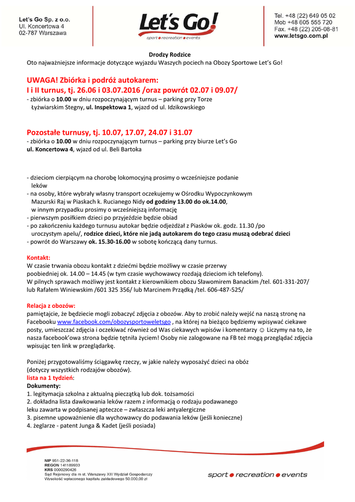 Drodzy Rodzice Oto najważniejsze informacje dotyczące wyjazdu Waszych pociech na Obozy Sportowe Let’s Go! UWAGA! Zbiórka i podróż autokarem: I i II turnus, tj. 26.06 i 03.07.2016 /oraz powrót 02.07 i 09.07/ - zbiórka o 10.00 w dniu rozpoczynającym turnus – parking przy Torze Łyżwiarskim Stegny, ul. Inspektowa 1, wjazd od ul. Idzikowskiego Pozostałe turnusy, tj. 10.07, 17.07, 24.07 i 31.07 - zbiórka o 10.00 w dniu rozpoczynającym turnus – parking przy biurze Let’s Go ul. Koncertowa 4, wjazd od ul. Beli Bartoka - dzieciom cierpiącym na chorobę lokomocyjną prosimy o wcześniejsze podanie leków - na osoby, które wybrały własny transport oczekujemy w Ośrodku Wypoczynkowym Mazurski Raj w Piaskach k. Rucianego Nidy od godziny 13.00 do ok.14.00, w innym przypadku prosimy o wcześniejszą informację - pierwszym posiłkiem dzieci po przyjeździe będzie obiad - po zakończeniu każdego turnusu autokar będzie odjeżdżał z Piasków ok. godz. 11.30 /po uroczystym apelu/, rodzice dzieci, które nie jadą autokarem do tego czasu muszą odebrać dzieci - powrót do Warszawy ok. 15.30-16.00 w sobotę kończącą dany turnus. Kontakt: W czasie trwania obozu kontakt z dziećmi będzie możliwy w czasie przerwy poobiedniej ok. 14.00 – 14.45 (w tym czasie wychowawcy rozdają dzieciom ich telefony). W pilnych sprawach możliwy jest kontakt z kierownikiem obozu Sławomirem Banackim /tel. 601-331-207/ lub Rafałem Winiewskim /601 325 356/ lub Marcinem Prządką /tel. 606-487-525/ Relacja z obozów: pamiętajcie, że będziecie mogli zobaczyć zdjęcia z obozów. Aby to zrobić należy wejść na naszą stronę na Facebooku www.facebook.com/obozysportoweletsgo , na której na bieżąco będziemy wpisywać ciekawe posty, umieszczać zdjęcia i oczekiwać również od Was ciekawych wpisów i komentarzy ☺ Liczymy na to, że nasza facebook’owa strona będzie tętniła życiem! Osoby nie zalogowane na FB też mogą przeglądać zdjęcia wpisując ten link w przeglądarkę. Poniżej przygotowaliśmy ściągawkę rzeczy, w jakie należy wyposażyć dzieci na obóz (dotyczy wszystkich rodzajów obozów). lista na 1 tydzień: Dokumenty: 1. legitymacja szkolna z aktualną pieczątką lub dok. tożsamości 2. dokładna lista dawkowania leków razem z informacją o rodzaju podawanego leku zawarta w podpisanej apteczce – zwłaszcza leki antyalergiczne 3. pisemne upoważnienie dla wychowawcy do podawania leków (jeśli konieczne) 4. żeglarze - patent Junga & Kadet (jeśli posiada) Bagaż: Bardzo prosimy, aby wszystkie rzeczy były podpisane oraz aby dzieci miały listę wszystkich rzeczy zabranych na obóz. Lista sugerowanych rzeczy na obóz: - torba podróżna/walizka – podpisana - kurtka przeciwdeszczowa - ciepły śpiwór i jasiek /te dzieci, które są zakwaterowane na obozowisku w namiotach/ - ciepłe bluzy - dres /najlepiej 2 pary/ - przynajmniej 2 pary krótkich spodenek - spódniczki, sukienka /dla dziewczynek/ - koszulki z krótkim rękawkiem - 1 piżama - bielizna osobista i skarpetki, w tym 1 para ciepłych skarpet - 1 mały ręcznik /do twarzy/ - 1 ręcznik kąpielowy - 2 czapki na głowę (najlepiej z daszkiem) - buty sportowe 2 pary, sandały, ew. buty do windsurfingu, kalosze, klapki - kostium kąpielowy Dzieci, które będą przebywały na obozie taneczno-sportowym dodatkowo proszone są o zabranie: - buty sportowe - leginsy - spódniczka krótka jednokolorowa - spódnica długa - krótkie jeansowe spodenki - koszulka na ramiączka czarna (+ jednokolorowa) - kolorowa chusta - czapka z daszkiem - koszula w kratę Dzieci, które będą przebywały na obozie żeglarskim dodatkowo proszone są o zabranie: - dobrej jakości kurtki przeciwdeszczowej - cienkiej czapki zimowej - miękkiej torby na bagaż - kaloszy!!! Dzieciom, które będą przebywały na obozie windsurfingowym dodatkowo sugerujemy zabranie: - butów windsurfingowych - pianki do pływania na windsurfingu (jeśli ma) - cienkiej czapki zimowej Dzieci, które będą przebywały na obozie fotograficzno-filmowym dodatkowo: - (jeśli posiada!) aparat fotograficzny+karta pamięci, kamerkę sportową z ładowarką i etui! - pamięć typu flash/pen drive (USB) o pojemności min. 4 GB Kosmetyki: - szczoteczka do zębów, pasta i kubeczek podpisany - mydło w mydelniczce - grzebień lub szczotka do włosów (dziewczynki gumeczki do włosów) - szampon - żel pod prysznic - krem z filtrem UV - preparat przeciw komarom !!! - płyny do czyszczenia aparatów ortodontycznych (jeśli używa) - chusteczki jednorazowe Inne: - mały plecak - kask /jeśli dzieci mają swój ulubiony/ - koniecznie podpisany! - okulary przeciwsłoneczne - mała latarka - pieniądze (max 50 zł/ tydz. w małych nominałach) - koniecznie w podpisanym portfelu! - ulubiona książka, przytulanka, gra planszowa Na miejscu pieniądze zostaną zdeponowane u wychowawcy i będą codziennie wydawane dzieciom. Pozwoli to uniknąć niepożądanych sytuacji i zbędnego wydawania pieniędzy na słodycze, itp. Odwiedziny rodziców w czasie turnusów 2 tyg. Na wstępie, dzieląc się naszym doświadczeniem uważamy, że takie odwiedziny nie wpływają najlepiej, zwłaszcza na młodsze dzieci. Czasem problemem jest też fakt, że dzieciom jest przykro jeśli do kolegi/koleżanki przyjadą rodzice, a do nich nie… Jeśli jednak planują Państwo takie odwiedziny to prosimy poinformować o odwiedzinach mailowo. Kontakty e-mail: [email protected] [email protected] Odwiedziny możliwe są jedynie w sobotę w środku turnusu 2-tygodniowego. Dokumenty, leki i pieniądze prosimy koniecznie podpisać !!! To samo najlepiej zrobić z ubraniami, oznaczając je na np. metkach. Na obozie obowiązuje zakaz grania na urządzeniach elektronicznych typu PSP, dlatego prosimy ich najlepiej nie zabierać ☺ Wakacje już tuż, tuż! Do zobaczenia!