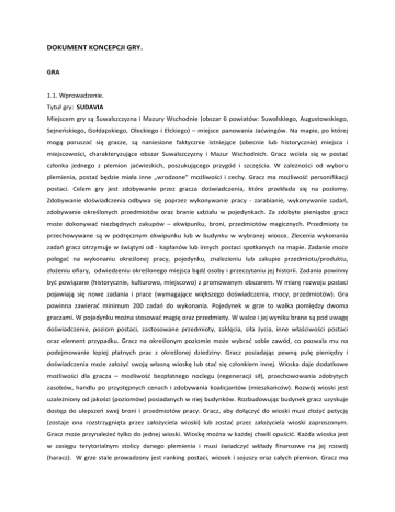 DOKUMENT KONCEPCJI GRY. GRA 1.1. Wprowadzenie. Tytuł gry: SUDAVIA Miejscem gry są Suwalszczyzna i Mazury Wschodnie (obszar 6 powiatów: Suwalskiego, Augustowskiego, Sejneńskiego, Gołdapskiego, Oleckiego i Ełckiego) – miejsce panowania Jaćwingów. Na mapie, po której mogą poruszać się gracze, są naniesione faktycznie istniejące (obecnie lub historycznie) miejsca i miejscowości, charakteryzujące obszar Suwalszczyzny i Mazur Wschodnich. Gracz wciela się w postać członka jednego z plemion jaćwieskich, poszukującego przygód i szczęścia. W zależności od wyboru plemienia, postać będzie miała inne „wrodzone” możliwości i cechy. Gracz ma możliwość personifikacji postaci. Celem gry jest zdobywanie przez gracza doświadczenia, które przekłada się na poziomy. Zdobywanie doświadczenia odbywa się poprzez wykonywanie pracy - zarabianie, wykonywanie zadań, zdobywanie określonych przedmiotów oraz branie udziału w pojedynkach. Za zdobyte pieniądze gracz może dokonywać niezbędnych zakupów – ekwipunku, broni, przedmiotów magicznych. Przedmioty te przechowywane są w podręcznym ekwipunku lub w budynku w wybranej wiosce. Zlecenia wykonania zadań gracz otrzymuje w świątyni od - kapłanów lub innych postaci spotkanych na mapie. Zadanie może polegać na wykonaniu określonej pracy, pojedynku, znalezieniu lub zakupie przedmiotu/produktu, złożeniu ofiary, odwiedzeniu określonego miejsca bądź osoby i przeczytaniu jej historii. Zadania powinny być powiązane (historycznie, kulturowo, miejscowo) z promowanym obszarem. W miarę rozwoju postaci pojawiają się nowe zadania i prace (wymagające większego doświadczenia, mocy, przedmiotów). Gra powinna zawierać minimum 200 zadań do wykonania. Pojedynek w grze to walka pomiędzy dwoma graczami. W pojedynku można stosować magię oraz przedmioty. W walce i jej wyniku brane są pod uwagę doświadczenie, poziom postaci, zastosowane przedmioty, zaklęcia, siła życia, inne właściwości postaci oraz element przypadku. Gracz na określonym poziomie może wybrać sobie zawód, co pozwala mu na podejmowanie lepiej płatnych prac z określonej dziedziny. Gracz posiadając pewną pulę pieniędzy i doświadczenia może założyć swoją własną wioskę lub stać się członkiem innej. Wioska daje dodatkowe możliwości dla gracza – możliwość bezpłatnego noclegu (regeneracji sił), przechowowania zdobytych zasobów, handlu po przystępnych cenach i zdobywania koalicjantów (mieszkańców). Rozwój wioski jest uzależniony od jakości (poziomów) posiadanych w niej budynków. Rozbudowując budynek gracz uzyskuje dostęp do ulepszeń swej broni i przedmiotów pracy. Gracz, aby dołączyć do wioski musi złożyć petycję (zostaje ona rozstrzygnięta przez założyciela wioski) lub zostać przez założyciela wioski zaproszonym. Gracz może przynależeć tylko do jednej wioski. Wioskę można w każdej chwili opuścić. Każda wioska jest w zasięgu terytorialnym stolicy danego plemienia i musi świadczyć wkłady finansowe na jej rozwój (haracz). W grze stale prowadzony jest ranking postaci, wiosek i sojuszy oraz całych plemion. Gracz ma dostęp do swoich statystyk – walk, zadań, prac, handlu,umiejętności postaci i jej stanu w grze. Ma również dostęp do komunikacji z innymi graczami (system wiadomości). Świat gry jest uruchamiany na określony czas, w którym trwa rozgrywka. System zarządzania grą powinien pozwalać na założenie okresu istnienia danego świata i możliwość uruchomienia kolejnego. W grze powinno być dostępne konto Premium oraz konto Premium Gold. Konto Premium jest zasilane poprzez specjalne kody (forma papierowa) otrzymywane przez uczestników gry dzięki fizycznej obecności w różnych obiektach (kwaterach, hotelach, restauracjach, muzeach i innych) znajdujących się na terenie funkcjonowania projektu promocyjnego. Wymagane jest prowadzenie statystyk dla wyżej wymienionych kodów (ilość wykorzystanych, miejsca otrzymania, wolne itp.). Wprowadzenie kodu daje użytkownikowi dodatkowe bonusy (które mogą być użyte na przyspieszenie budowy, wzrost mocy postaci itp.) Konto Premium Gold jest to konto które pozwala graczowi zakupić przez SMS lub przelew pewną ilość bonusów. Gra powinna mieć panel administracyjny umożliwiający analizę danych (ilość graczy, uruchamianie/zamykanie świata gry, sprawdzanie/generowanie kodów premium oraz premium Gold (z sms i płatności on-line), usuwanie gracza, szeroko rozumiane statystyki). Strony gry powinne umożliwić integrację z systemem płatności sms i płatności on-line (przelewy 24). Gra powinna posiadać system pomocy i opisów umożliwiających poznanie rządzących nią reguł.