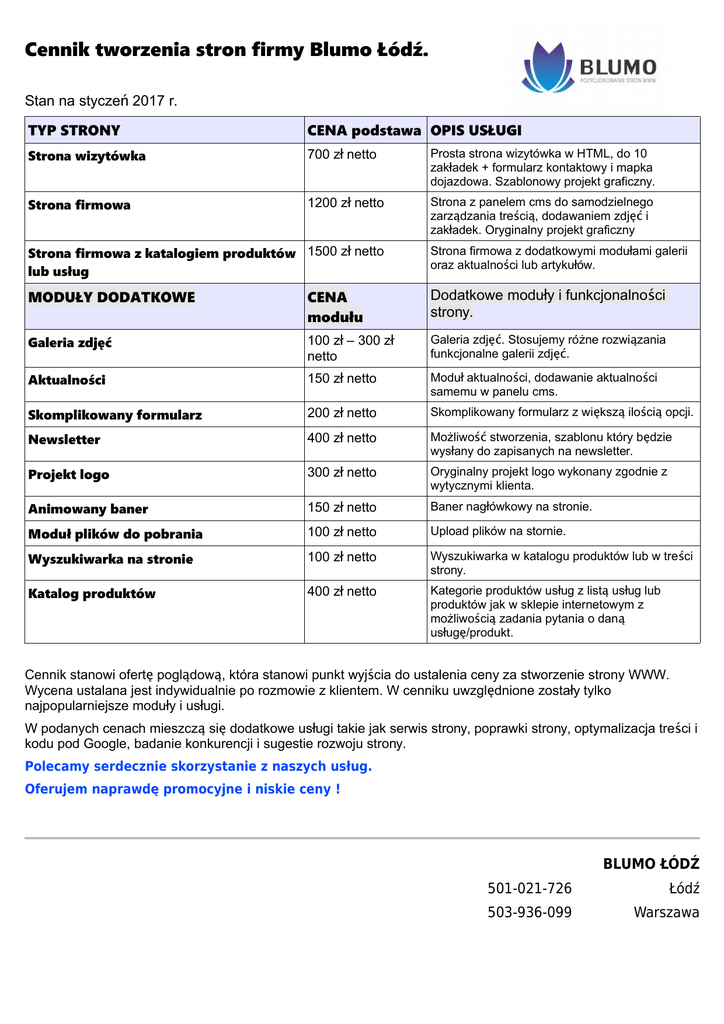 Cennik tworzenia stron firmy Blumo Łódź. Stan na styczeń 2017 r. TYP STRONY CENA podstawa OPIS USŁUGI Strona wizytówka 700 zł netto Prosta strona wizytówka w HTML, do 10 zakładek + formularz kontaktowy i mapka dojazdowa. Szablonowy projekt graficzny. Strona firmowa 1200 zł netto Strona z panelem cms do samodzielnego zarządzania treścią, dodawaniem zdjęć i zakładek. Oryginalny projekt graficzny Strona firmowa z katalogiem produktów 1500 zł netto lub usług Strona firmowa z dodatkowymi modułami galerii oraz aktualności lub artykułów. MODUŁY DODATKOWE CENA modułu Dodatkowe moduły i funkcjonalności strony. Galeria zdjęć 100 zł – 300 zł netto Galeria zdjęć. Stosujemy różne rozwiązania funkcjonalne galerii zdjęć. Aktualności 150 zł netto Moduł aktualności, dodawanie aktualności samemu w panelu cms. Skomplikowany formularz 200 zł netto Skomplikowany formularz z większą ilością opcji. Newsletter 400 zł netto Możliwość stworzenia, szablonu który będzie wysłany do zapisanych na newsletter. Projekt logo 300 zł netto Oryginalny projekt logo wykonany zgodnie z wytycznymi klienta. Animowany baner 150 zł netto Baner nagłówkowy na stronie. Moduł plików do pobrania 100 zł netto Upload plików na stornie. Wyszukiwarka na stronie 100 zł netto Wyszukiwarka w katalogu produktów lub w treści strony. Katalog produktów 400 zł netto Kategorie produktów usług z listą usług lub produktów jak w sklepie internetowym z możliwością zadania pytania o daną usługę/produkt. Cennik stanowi ofertę poglądową, która stanowi punkt wyjścia do ustalenia ceny za stworzenie strony WWW. Wycena ustalana jest indywidualnie po rozmowie z klientem. W cenniku uwzględnione zostały tylko najpopularniejsze moduły i usługi. W podanych cenach mieszczą się dodatkowe usługi takie jak serwis strony, poprawki strony, optymalizacja treści i kodu pod Google, badanie konkurencji i sugestie rozwoju strony. Polecamy serdecznie skorzystanie z naszych usług. Oferujem naprawdę promocyjne i niskie ceny ! BLUMO ŁÓDŹ 501-021-726 Łódź 503-936-099 Warszawa