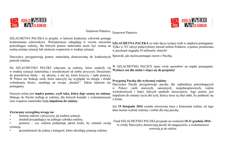 Szanowni Państwo, Szanowni Państwo, SZLACHETNA PACZKA to projekt, w którym konkretny człowiek pomaga konkretnemu człowiekowi. Wolontariusze odnajdują w swoim otoczeniu SZLACHETNA PACZKA co roku łączy tysiące osób w mądrym pomaganiu. potrzebujące rodziny, dla których pomoc materialna może być szansą na Tylko w XV edycji połączyliśmy niemal milion Polaków, a pomoc przekazana realną zmianę sytuacji lub istotnym wsparciem w trudnej sytuacji. w paczkach sięgnęła 54 milionów złotych! Darczyńcy przygotowują pomoc materialną dostosowaną do konkretnych Sprawdź, jak można pomagać razem z Paczką. potrzeb rodziny. Do SZLACHETNEJ PACZKI włączane są rodziny, które znalazły się w trudnej sytuacji materialnej z niezależnych od siebie przyczyn. Docieramy do prawdziwej biedy – tej ukrytej, a nie tej, która krzyczy i żąda pomocy. W Polsce nie brakuje osób, które nauczyły się wyglądać na ubogie i dzięki wzbudzaniu litości, zarabiają na swojej „biedzie”. Takim ludziom nie pomagamy. W SZLACHETNEJ PACZCE masz wiele sposobów na mądre pomaganie. Wybierz coś dla siebie i włącz się do projektu! Przygotuj Paczkę dla wybranej rodziny Darczyńca Paczki przygotowuje paczkę dla najbardziej potrzebujących w Polsce: osób starszych, samotnych, niepełnosprawnych, rodzin wielodzietnych i ludzi, których spotkało nieszczęście. Jego pomoc jest Naszym celem jest mądra pomoc, czyli taka, która daje szansę na zmianę. impulsem do zmiany życia dla tych, którzy teraz są zbyt słabi, by podnieść się Dlatego do Paczki trafiają te rodziny, dla których kontakt z wolontariuszem z kolan. oraz wsparcie materialne będą impulsem do zmiany. Już 19 listopada 2016 zostala otworzona baza z historiami rodzin, od tego dnia można wybrać rodzinę i zrobić dla niej paczkę. Zwracamy szczególną uwagę na: • historię rodziny i przyczyny jej trudnej sytuacji, • dochód przypadający na jednego członka rodziny, Finał SZLACHETNEJ PACZKI przypada na weekend 10-11 grudnia 2016 • postawę – czy rodzina podejmuje jakieś kroki, by zmienić swoją to wtedy Darczyńcy dostarczają paczki do magazynów, a wolontariusze sytuacją, rozwożą je do rodzin. • przynależność do jednej z kategorii, które określają sytuację rodziny. TAK DZIAŁA PACZKA! Szkoła Podstawowa im. Miry i Tadeusza Sygietyńskich w Proszeniu dołączyła do Drużyny SZLACHETNEJ PACZKI. Człowiek w centrum Chcemy nieść Mądrą Pomoc. Dzięki naszej pomocy rodzina, która każdego Ważny jest dla nas każdy człowiek. Łączymy potrzebujących z darczyńcami. Chcemy dnia walczy o lepsze jutro, otrzyma nadzieję i inspirację do samodzielnego kompleksowo zmieniać ludzi, dając im nie rybę, nie wędkę, lecz mentalność poradzenia sobie w życiu. wędkarza. Dlatego w tym roku np. robimy krok w kierunku biznesu: w ramach Oto rodzina, którą wybrała Szkoła Podstawowa w Proszeniu: Paczki Biznesu uczymy biedne rodziny zarabiania pieniędzy i planowania budżetu domowego. Wprowadzamy finansowe szkolenia dla wolontariuszy, którzy następnie Pani Teresa (60 l.) samotnie wychowuje nastoletnią córkę Paulinę (17 l.) swoją wiedzę przekażą potrzebującym. U nas stajesz się Bohaterem Bohaterami są dla nas: wolontariusz, rodzina, darczyńca i dobroczyńca – wszyscy, którzy angażują się w projekt. Na każdym poziomie tak projektujemy doświadczenia, by każda z tych osób odkryła w sobie chęć przekraczania siebie – podejmowania wyzwań i ich wygrywania. To mentalność zwycięzcy sprawia, że pojedyncze osoby w SZLACHETNEJ PACZCE stają się liderami zmiany. W Paczce tworzysz Drużynę Wokół liderów jednoczymy kolejne osoby – wolontariuszy, darczyńców, firmy, zaangażowanych w projekt. W ten sposób budujemy wspólnotę opartą na otwartości, zaufaniu i wzajemnej inspiracji. To podstawa do oddolnego tworzenia społeczeństwa, w którym szukamy „czegoś więcej” – przekraczamy siebie dla innych, wspieramy się w wzajemnie – realizując np. ideę Mądrego Pomagania. Uczymy zaradności już od dziecka Pani Teresa we wczesnym wieku doświadczyła macierzyństwa. Ma dwóch synów i trzy córki. Wraz z mężem trwali we wspólnym życiu razem. Niestety syn pani Teresy miał śmiertelny wypadek. Po śmierci dziecka, mąż Pani Teresy zaczął nadużywać alkoholu i zmarł. Na barkach kobiety spoczywa utrzymanie swojej nastoletniej córki. Na miarę swoich możliwości pomagają jej starsze dzieci, które założyły własne rodziny. Pani Teresa pracuje jako woźna. Zarabia 1506 zł miesięcznie. Po odjęciu kosztów utrzymania domu i raty za kredyt, który wzięła na życie kilka lat temu, rodzinie zostaje 141,5 zł na osobę. Pani Teresa by utrzymać swoją córkę i siebie podejmuje dodatkowe prace. Jest dzielną kobietą. Gospodarować taką kwotą nie jest łatwo. Mimo to stara się, by jej córce niczego nie zabrakło. Pauliny pasją jest śpiew- brała nawet lekcje wokalne, niestety z powodu braków środków musiała zrezygnować z zajęć. Paczka ma źródło w tym, że łączy biednych i bogatych, ale mamy też AKADEMIĘ PRZYSZŁOŚCI – siostrzany projekt Paczki, w jego ramach przeprowadzamy dzieci od porażki w szkole, do sukcesu w życiu. Pomagamy uczniom, którzy mają problemy Pani Teresa potrzebuje żywności i środków czystości. Będzie również w szkole i często pochodzą z niezamożnych rodzin. Wydobywamy z nich potencjał. wdzięczna za koc, ponieważ nie posiada w domu żadnego. To prewencja biedy i nauka zaradności już od dziecka. Wszelkie informacje dotyczące rodziny i projektu Szlachetna Paczka udziela p. Krystyna Rybak. Paczkę może przygotować każdy! Najlepiej zrobić to wspólnie z przyjaciółmi lub rodziną i dzielić się radością pomagania. Pozdrawiam, Wolontariusz Szlachetnej Paczki Pozdrawiam, Wolontariusz Szlachetnej Paczki