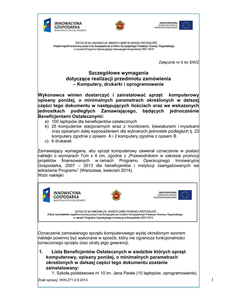 Załącznik nr 5 do SIWZ Szczegółowe wymagania dotyczące realizacji przedmiotu zamówienia – Komputery, drukarki i oprogramowanie Wykonawca winien dostarczyć i zainstalować sprzęt komputerowy opisany poniżej, o minimalnych parametrach określonych w dalszej części tego dokumentu w następujących ilościach oraz we wskazanych jednostkach podległych Zamawiającego, będących jednocześnie Beneficjentami Ostatecznymi: a) 100 laptopów dla beneficjentów ostatecznych b) 25 komputerów stacjonarnych wraz z monitorami, klawiaturami i myszkami oraz opisanym dalej wyposażeniem dla wybranych jednostek podległych tj. 23 komputery zgodnie z opisem A i 2 komputery zgodnie z opisem B c) 6 drukarek Zamawiający wymagana, aby sprzęt komputerowy zawierał oznaczenie w postaci naklejki o wymiarach 7cm x 4 cm, zgodne z „Przewodnikiem w zakresie promocji projektów finansowanych w ramach Programu Operacyjnego Innowacyjna Gospodarka, 2007 – 2013 dla beneficjentów i instytucji zaangażowanych we wdrażanie Programu” (Warszawa, kwiecień 2014). Wzór naklejki: Oznaczenie zamawianego sprzętu komputerowego wyżej określonym wzorem naklejki powinno być wykonane w sposób, który nie ogranicza funkcjonalności oznaczonego sprzętu oraz utraty jego gwarancji. 1. Lista Beneficjentów Ostatecznych w siedzibie których sprzęt komputerowy, opisany poniżej, o minimalnych parametrach określonych w dalszej części tego dokumentu zostanie zainstalowany: 1. Szkoła podstawowa nr 10 im. Jana Pawła (10 laptopów, oprogramowanie), Znak sprawy: WIN.271.2.8.2014 1 2. Gimnazjum Publiczne Nr 1 im Noblistów Polskich (10 laptopów, oprogramowanie), 3. Zespół Szkół Ogólnokształcących im. Tadeusza Kościuszki (10 laptopów, oprogramowanie), 4. II Liceum Ogólnokształcące im. Marii Konopnickiej, Pl Kościuszki 3 (10 laptopów, oprogramowanie), 5. III Liceum Ogólnokształcące, ul. Senatorska 13 (10 laptopów, oprogramowanie), 6. Zespół Szkół Drzewnych i Gimnazjalnych, ul. M. Skłodowskiej - Curie 5 (10 laptopów, oprogramowanie), 7. Zespół Szkół Technicznych i Ogólnokształcących Nr 4 (10 laptopów oprogramowanie), 8. Zespół Szkół Mechanicznych i Ogólnokształcących Nr 5 (10 laptopów, oprogramowanie), 9. Zespół Szkół Weterynaryjnych i Ogólnokształcących ul. Stacha Konwy 11 (10 laptopów, oprogramowanie), 10. Zespół Szkół Ekonomicznych i Ogólnokształcących ul. Kopernika 16 (10 laptopów, oprogramowanie), 11. Miejski Ośrodek Pomocy Społecznej w Łomży (9 komputerów- komputer stacjonarny A-9 szt., 1 drukarka, oprogramowanie) ● MOPS, ul. Dworna 23B – (4 komputery, 1 drukarka, oprogramowanie) ● Centrum Pieczy Zastępczej w Łomży, ul. M.C. Skłodowskiej 5 – (3 komputery, oprogramowanie) ● Placówka Opiekuńcza – Wychowawcza w Łomży, ul. Rybaki 14 – (2 komputery, oprogramowanie) 12. Biblioteka Publiczna (16 komputerów(komputer stacjonarny A-14 szt., komputer stacjonarny B-2 szt.) 5 drukarek, oprogramowanie) ● ul. Długa 13 – (8 komputerów-, 2 drukarki, oprogramowanie) ● ul. 3go Maja 6A – (8 komputerów, 3 drukarki, oprogramowanie) W ofercie należy uwzględnić: dostarczenie zamówionych, fabrycznie nowych, komputerów i drukarek o minimalnych parametrach opisanych poniżej, uruchomienie i konfigurację niżej opisanych urządzeń oraz oprogramowania w ww. lokalizacjach Beneficjentów Ostatecznych aktualizację zainstalowanych programów do stanu aktualizacji na dzień przekazania sprzętu. jednolity okres gwarancji na laptopy i komputery, nie krótszy niż 24 miesiące, okres gwarancji na drukarki nie krótszy niż 24 miesiące licencjonowanie systemów operacyjnych oraz pozostałego oprogramowania umożliwiające użyczenie, a następnie przekazanie ich Beneficjentom Ostatecznym, w taki sposób aby po przekazaniu każdy z Beneficjentów Ostatecznych stał się pełnoprawnym posiadaczem licencji. Dostarczony sprzęt pozostanie w wyżej wymienionych lokalizacjach. Znak sprawy: WIN.271.2.8.2014 2 2. Laptop (100 sztuk) - o parametrach minimalnych: Parametry Wymagane minimalne parametry techniczne komputerów Typ Zastosowanie Procesor Pamięć operacyjna RAM Dysk twardy Karta graficzna Wyświetlacz Wyposażenie multimedialne Rodzaje wyjść / wejść Łączność Komputer przenośny typu notebook z ekranem nie mniejszym niż 15,6 LED, proporcje ekranu 16:9 Komputer przenośny będzie wykorzystywany dla potrzeb aplikacji biurowych, dostępu do sieci Internet oraz poczty elektronicznej w jednostkach edukacyjnych. - x86 dedykowany do pracy w komputerach przenośnych, energooszczędny, - min. 3289 punktów w teście Passmark CPU Mark wg wyniku opublikowanego na stronie http://www.cpubenchmark.net/cpu_list.php Do oferty należy załączyć raport z wynikami przeprowadzonego testu, poświadczony podpisem oferenta. Ponadto Zamawiający zastrzega sobie, iż w celu sprawdzenia poprawności przeprowadzenia testów może zwrócić się do oferenta z prośbą o dostarczenie oprogramowania testującego, zaoferowanego sprzętu komputerowego oraz dokładnego opisu procedury przeprowadzonego testu. - min. dwa banki pamięci, - min. 4GB (zainstalowane w jednym banku pamięci), możliwość rozbudowy do min. 8GB poprzez zainstalowanie 4GB RAM w drugim banku pamięci - min. 500 GB 2,5’; SATA, z dedykowaną partycją do odzyskiwania systemu operacyjnego z pamięcią własną min. 1 GB z podświetleniem LED o rozdzielczości HD (1366 x 768) 1. Wbudowane głośniki stereo 2. Wbudowany mikrofon 3. Zintegrowana karta dźwiękowa zgodna z HD 4. Wbudowana kamera internetowa 1. DC-in (wejście zasilania) - 1 szt. 2. HDMI - 1 szt. 3. RJ-45 (LAN) - 1 szt. 4. USB 2.0 - 1 szt. 5. USB 3.0 - 2 szt. 6. Wyjście słuchawkowe/wejście mikrofonowe - 1 szt. 7. Czytnik kart pamięci - 1 szt. 8. Wyjście D-SUB lub DVI 1. Wi-Fi 802.11 b/g/n 2. LAN 10/100/1000 Mbps 3. Bluetooth Znak sprawy: WIN.271.2.8.2014 3 Wymagania dotyczące baterii i zasilania Certyfikaty i standardy min. 4