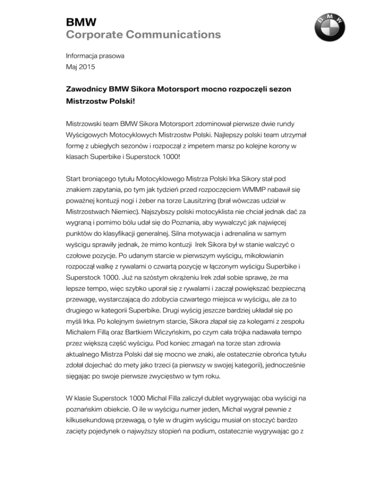 BMW Corporate Communications Informacja prasowa Maj 2015 Zawodnicy BMW Sikora Motorsport mocno rozpoczęli sezon Mistrzostw Polski! Mistrzowski team BMW Sikora Motorsport zdominował pierwsze dwie rundy Wyścigowych Motocyklowych Mistrzostw Polski. Najlepszy polski team utrzymał formę z ubiegłych sezonów i rozpoczął z impetem marsz po kolejne korony w klasach Superbike i Superstock 1000! Start broniącego tytułu Motocyklowego Mistrza Polski Irka Sikory stał pod znakiem zapytania, po tym jak tydzień przed rozpoczęciem WMMP nabawił się poważnej kontuzji nogi i żeber na torze Lausitzring (brał wówczas udział w Mistrzostwach Niemiec). Najszybszy polski motocyklista nie chciał jednak dać za wygraną i pomimo bólu udał się do Poznania, aby wywalczyć jak najwięcej punktów do klasyfikacji generalnej. Silna motywacja i adrenalina w samym wyścigu sprawiły jednak, że mimo kontuzji Irek Sikora był w stanie walczyć o czołowe pozycje. Po udanym starcie w pierwszym wyścigu, mikołowianin rozpoczął walkę z rywalami o czwartą pozycję w łączonym wyścigu Superbike i Superstock 1000. Już na szóstym okrążeniu Irek zdał sobie sprawę, że ma lepsze tempo, więc szybko uporał się z rywalami i zaczął powiększać bezpieczną przewagę, wystarczającą do zdobycia czwartego miejsca w wyścigu, ale za to drugiego w kategorii Superbike. Drugi wyścig jeszcze bardziej układał się po myśli Irka. Po kolejnym świetnym starcie, Sikora złapał się za kolegami z zespołu Michalem Fillą oraz Bartkiem Wiczyńskim, po czym cała trójka nadawała tempo przez większą część wyścigu. Pod koniec zmagań na torze stan zdrowia aktualnego Mistrza Polski dał się mocno we znaki, ale ostatecznie obrońca tytułu zdołał dojechać do mety jako trzeci (a pierwszy w swojej kategorii), jednocześnie sięgając po swoje pierwsze zwycięstwo w tym roku. W klasie Superstock 1000 Michal Filla zaliczył dublet wygrywając oba wyścigi na poznańskim obiekcie. O ile w wyścigu numer jeden, Michal wygrał pewnie z kilkusekundową przewagą, o tyle w drugim wyścigu musiał on stoczyć bardzo zacięty pojedynek o najwyższy stopień na podium, ostatecznie wygrywając go z BMW Corporate Communications Temat Informacja prasowa Maj 2015 Zawodnicy BMW Sikora Motorsport mocno rozpoczęli sezon Mistrzostw Polski! Strona 2 Data przewagą niecałej jednej dziesiątej sekundy. Nie zmienia to jednak faktu, że Czech podczas pierwszego tegorocznego weekendu WMMP był zdecydowanie najszybszym zawodnikiem na torze. Nie jest to pierwszy raz, bowiem w ciągu ostatnich kilku sezonów Filla wielokrotnie deklasował rywali i wszystko wskazuje na to, że kolejny rok z rzędu będzie on całkowicie poza zasięgiem konkurencji. Podium do dorobku teamu BMW Sikora Motorsport dołożył także Bartek Wiczyński, który w drugim wyścigu wywalczył trzecie miejsce dzięki równej i szybkiej jeździe. Najlepszy polski team wyścigowy, wspierany i w tym roku przez producenta narzędzi Proline, rozpoczął sezon 2015 od zdobycia trzech zwycięstw oraz drugiego i trzeciego miejsca, a to dopiero początek sukcesów. Kolejne dwie rundy WMMP odbędą się w ostatni weekend maja, wówczas wszyscy zawodnicy będą już w pełni sił i ponownie powalczą o komplet zwycięstw na lubianym przez siebie torze Panoniaring. Więcej informacji i aktualności o teamie znajdziecie Państwo na fanpage na facebooku: www.facebook.com/BmwSikoraMotorsport W przypadku pytań prosimy o kontakt z: Katarzyna Gospodarek, Corporate Communications Manager Tel.: +48 728 873 932, e-mail: [email protected] BMW Group BMW Group, w której portfolio znajdują się marki BMW, MINI oraz Rolls-Royce, jest światowym liderem wśród producentów samochodów i motocykli segmentu premium. Oferuje również usługi finansowe, a także z zakresu mobilności. Firma posiada 30 zakładów produkcyjnych i montażowych w 14 państwach oraz ogólnoświatową sieć sprzedaży w ponad 140 krajach. W 2014 roku BMW Group sprzedała na całym świecie ok. 2,118 mln samochodów oraz 123 000 motocykli. W 2014 r. jej zysk przed opodatkowaniem wyniósł 8,71 mld euro przy dochodach 80,40 mld euro (dane za rok finansowy). Na dzień 31 grudnia 2014 r. globalne zatrudnienie sięgało 116 324 pracowników. Źródłem sukcesu BMW Group jest długofalowe planowanie oraz działanie w sposób odpowiedzialny. Ważną częścią strategii firmy jest zrównoważony rozwój w aspekcie społecznym i BMW Corporate Communications Temat Informacja prasowa Maj 2015 Zawodnicy BMW Sikora Motorsport mocno rozpoczęli sezon Mistrzostw Polski! Strona 3 Data ochrony środowiska w całym łańcuchu dostaw, pełna odpowiedzialność za produkt oraz zobowiązania na rzecz oszczędzania zasobów. Polityka ta stanowi integralną część strategii rozwoju przedsiębiorstwa. www.bmwgroup.com Facebook: http://www.facebook.com/BMWGroup Twitter: http://twitter.com/BMWGroup YouTube: http://www.youtube.com/BMWGroupview Google+: http://googleplus.bmwgroup.com