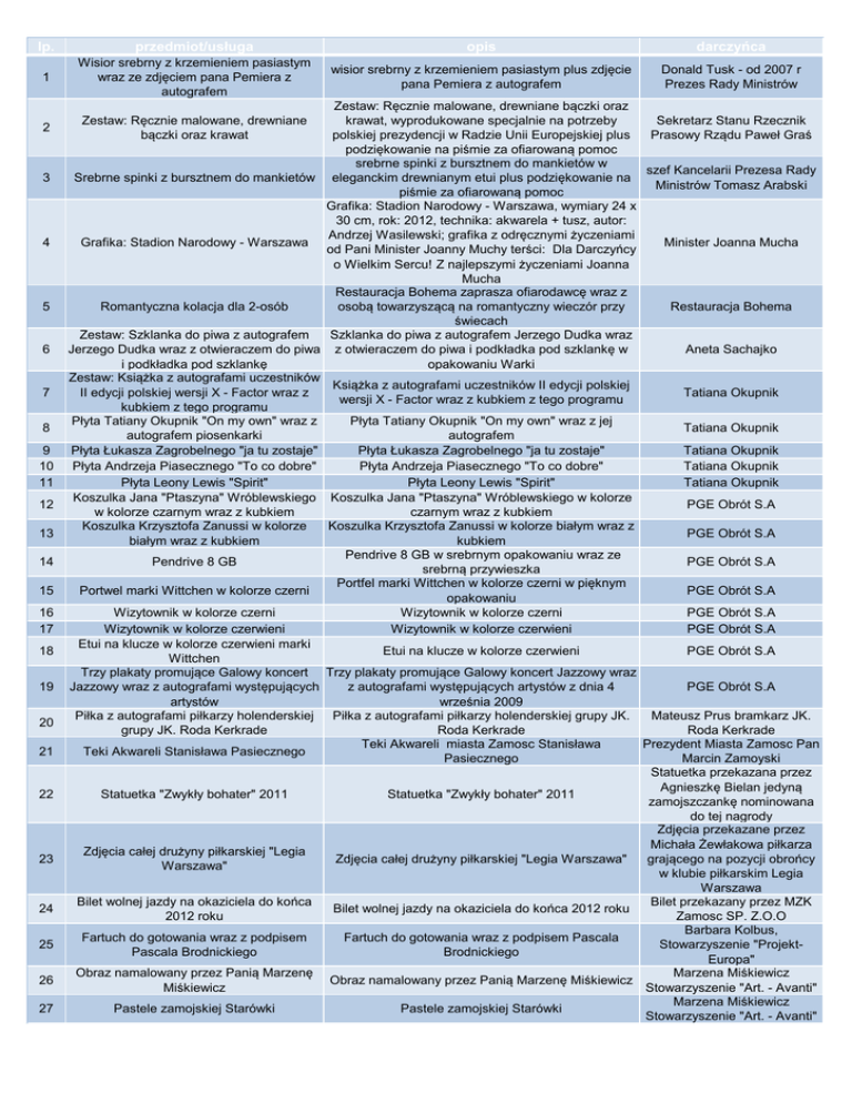 lp. przedmiot/usługa opis darczyńca 1 Wisior srebrny z krzemieniem pasiastym wraz ze zdjęciem pana Pemiera z autografem wisior srebrny z krzemieniem pasiastym plus zdjęcie pana Pemiera z autografem Donald Tusk - od 2007 r Prezes Rady Ministrów 2 3 4 5 6 7 8 9 10 11 12 13 14 15 16 17 18 19 20 21 22 23 24 25 26 27 Zestaw: Ręcznie malowane, drewniane bączki oraz Sekretarz Stanu Rzecznik krawat, wyprodukowane specjalnie na potrzeby Prasowy Rządu Paweł Graś polskiej prezydencji w Radzie Unii Europejskiej plus podziękowanie na piśmie za ofiarowaną pomoc srebrne spinki z bursztnem do mankietów w szef Kancelarii Prezesa Rady Srebrne spinki z bursztnem do mankietów eleganckim drewnianym etui plus podziękowanie na Ministrów Tomasz Arabski piśmie za ofiarowaną pomoc Grafika: Stadion Narodowy - Warszawa, wymiary 24 x 30 cm, rok: 2012, technika: akwarela + tusz, autor: Andrzej Wasilewski; grafika z odręcznymi życzeniami Grafika: Stadion Narodowy - Warszawa Minister Joanna Mucha od Pani Minister Joanny Muchy terści: Dla Darczyńcy o Wielkim Sercu! Z najlepszymi życzeniami Joanna Mucha Restauracja Bohema zaprasza ofiarodawcę wraz z osobą towarzyszącą na romantyczny wieczór przy Restauracja Bohema Romantyczna kolacja dla 2-osób świecach Zestaw: Szklanka do piwa z autografem Szklanka do piwa z autografem Jerzego Dudka wraz Jerzego Dudka wraz z otwieraczem do piwa z otwieraczem do piwa i podkładka pod szklankę w Aneta Sachajko i podkładka pod szklankę opakowaniu Warki Zestaw: Książka z autografami uczestników Książka z autografami uczestników II edycji polskiej II edycji polskiej wersji X - Factor wraz z Tatiana Okupnik wersji X - Factor wraz z kubkiem z tego programu kubkiem z tego programu Płyta Tatiany Okupnik "On my own" wraz z Płyta Tatiany Okupnik "On my own" wraz z jej Tatiana Okupnik autografem piosenkarki autografem Płyta Łukasza Zagrobelnego "ja tu zostaje" Płyta Łukasza Zagrobelnego "ja tu zostaje" Tatiana Okupnik Płyta Andrzeja Piasecznego "To co dobre" Płyta Andrzeja Piasecznego "To co dobre" Tatiana Okupnik Płyta Leony Lewis "Spirit" Płyta Leony Lewis "Spirit" Tatiana Okupnik Koszulka Jana "Ptaszyna" Wróblewskiego Koszulka Jana "Ptaszyna" Wróblewskiego w kolorze PGE Obrót S.A w kolorze czarnym wraz z kubkiem czarnym wraz z kubkiem Koszulka Krzysztofa Zanussi w kolorze Koszulka Krzysztofa Zanussi w kolorze białym wraz z PGE Obrót S.A białym wraz z kubkiem kubkiem Pendrive 8 GB w srebrnym opakowaniu wraz ze PGE Obrót S.A Pendrive 8 GB srebrną przywieszka Portfel marki Wittchen w kolorze czerni w pięknym Portwel marki Wittchen w kolorze czerni PGE Obrót S.A opakowaniu Wizytownik w kolorze czerni Wizytownik w kolorze czerni PGE Obrót S.A Wizytownik w kolorze czerwieni Wizytownik w kolorze czerwieni PGE Obrót S.A Etui na klucze w kolorze czerwieni marki Etui na klucze w kolorze czerwieni PGE Obrót S.A Wittchen Trzy plakaty promujące Galowy koncert Trzy plakaty promujące Galowy koncert Jazzowy wraz Jazzowy wraz z autografami występujących z autografami występujących artystów z dnia 4 PGE Obrót S.A artystów września 2009 Piłka z autografami piłkarzy holenderskiej Piłka z autografami piłkarzy holenderskiej grupy JK. Mateusz Prus bramkarz JK. grupy JK. Roda Kerkrade Roda Kerkrade Roda Kerkrade Teki Akwareli miasta Zamosc Stanisława Prezydent Miasta Zamosc Pan Teki Akwareli Stanisława Pasiecznego Pasiecznego Marcin Zamoyski Statuetka przekazana przez Agnieszkę Bielan jedyną Statuetka "Zwykły bohater" 2011 Statuetka "Zwykły bohater" 2011 zamojszczankę nominowana do tej nagrody Zdjęcia przekazane przez Michała Żewłakowa piłkarza Zdjęcia całej drużyny piłkarskiej "Legia Zdjęcia całej drużyny piłkarskiej "Legia Warszawa" grającego na pozycji obrońcy Warszawa" w klubie piłkarskim Legia Warszawa Bilet wolnej jazdy na okaziciela do końca Bilet przekazany przez MZK Bilet wolnej jazdy na okaziciela do końca 2012 roku 2012 roku Zamosc SP. Z.O.O Barbara Kolbus, Fartuch do gotowania wraz z podpisem Fartuch do gotowania wraz z podpisem Pascala Stowarzyszenie "ProjektPascala Brodnickiego Brodnickiego Europa" Obraz namalowany przez Panią Marzenę Marzena Miśkiewicz Obraz namalowany przez Panią Marzenę Miśkiewicz Miśkiewicz Stowarzyszenie "Art. - Avanti" Marzena Miśkiewicz Pastele zamojskiej Starówki Pastele zamojskiej Starówki Stowarzyszenie "Art. - Avanti" Zestaw: Ręcznie malowane, drewniane bączki oraz krawat 28 29 30 31 32 33 34 35 36 37 38 39 40 41 42 43 44 45 2 bilety na 30 Festiwal „Jazz na Kresach” Wystrzał z armaty wraz z dukatem koronnym Voucher: mój dzień naczelnego Gazety Zamojskiej Płyta zespołu IRA 9 [Edycja specjalna] z autografami muzyków 2 bilety na koncert w dniu 25 maja br. Grzegorz Obst Jazz Club KOSZ Wystrzał z armaty do zrealizowania w terminie maj Zamojskie Bractwo Rycerskie wrzesień 2012 wraz z dukatem koronnym Ofiarodawca przez jeden dzień będzie redaktorem Gazeta Zamojska naczelnym Gazety Zamojskiej Płyta zespołu IRA 9 [Edycja specjalna] z autografami Stowarzyszenie "Projektmuzyków Europa" prof. Lena Kolarska-Bobińska Koszulka z autografami Eurodeputowanych Koszulka z autografami Eurodeputowanych plus Poseł do Parlamentu plus zestaw gadżetów europeskich zestaw gadżetów europeskich Europejskiego Zdjęcie K. Hołowczyca z autografem Zdjęcie K. Hołowczyca z autografem Radosław Niziołek Zdjęcie z autografem Andreasa Koflera Zdjęcie z autografem Andreasa Koflera Tomasz Pakuła Zdjęcie z autografem Gregora Zdjęcie z autografem Gregora Schlierenzauera Tomasz Pakuła Schlierenzauera Zdjęcie z autografem Thomasa Zdjęcie z autografem Thomasa Morgensterna Tomasz Pakuła Morgensterna Plakat drużyny Barcelony FC Barcelona 2010/2011 Radosław Niziołek Kolczyki Technika wykonania: sutasz, ręcznie robione Ewa Woźniak Przy wykonaniu kolczyków został zastosowany koral Kolczyki Ewa Woźniak naturalny Autograf Adama Małysza Autograf Adama Małysza Tomasz Pakuł