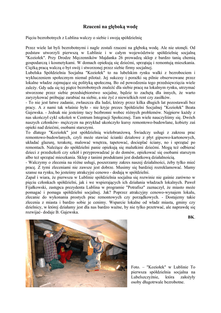 Rzuceni na głęboką wodę Pięciu bezrobotnych z Lublina walczy o siebie i swoją spółdzielnię Przez wiele lat byli bezrobotnymi i nagle zostali rzuceni na głęboką wodę. Ale nie utonęli. Od podstaw utworzyli pierwszą w Lublinie i w całym województwie spółdzielnię socjalną "Koziołek". Przy Drodze Męczenników Majdanka 26 prowadzą sklep z bardzo tanią chemią gospodarczą i kosmetykami. W domach opiekują się dziećmi, sprzątają i remontują mieszkania. Ciężką pracą walczą o byt swój i stworzonej przez siebie firmy socjalnej. Lubelska Spółdzielnia Socjalna "Koziołek" to na lubelskim rynku walki z bezrobociem i wykluczeniem społecznym niemal pilotaż. Jej sukcesy i porażki są pilnie obserwowane przez lokalne władze zajmujące się polityką społeczną. Bo od powodzenia tego przedsięwzięcia wiele zależy. Gdy uda się tej piątce bezrobotnych znaleźć dla siebie pracę na lokalnym rynku, utrzymać stworzone przez siebie przedsiębiorstwo socjalne, będzie to zachętą dla innych, że warto zaryzykować próbując zarabiać na siebie, a nie żyć z niewielkich rent czy zasiłków. - To nie jest łatwe zadanie, zwłaszcza dla ludzi, którzy przez kilka długich lat pozostawali bez pracy. A z nami tak właśnie było - nie kryje prezes Spółdzielni Socjalnej "Koziołek" Beata Gajewska. - Jednak nie jesteśmy tacy bezbronni wobec różnych problemów. Najpierw każdy z nas ukończył cykl szkoleń w Centrum Integracji Społecznej. Tam wiele nauczyliśmy się. Dwóch naszych członków- mężczyzn na przykład ukończyło kursy remontowo-budowlane, kobiety zaś opieki nad dziećmi, osobami starszymi. To dlatego "Koziołek" jest spółdzielnią wielobranżową. Świadczy usługi z zakresu prac remontowo-budowlanych, czyli może stawiać ścianki działowe z płyt gipsowo-kartonowych, układać glazurę, terakotę, malować wnętrza, tapetować, docieplać ściany, no i sprzątać po remontach. Należące do spółdzielni panie opiekują się malutkimi dziećmi. Mogą też odbierać dzieci z przedszkoli czy szkół i przyprowadzać je do domów, opiekować się osobami starszym albo też sprzątać mieszkania. Sklep z tanimi produktami jest dodatkową działalnością. - Walczymy o zlecenia na różne usługi, poszerzamy zakres naszej działalności, żeby tylko mieć pracę. Z tymi zleceniami nie zawsze jest dobrze. Musimy się bardziej rozreklamować. Mamy szanse na rynku, bo jesteśmy atrakcyjni cenowo - dodają w spółdzielni. Zapał i wiara, że pierwsza w Lublinie spółdzielnia socjalna się rozwinie nie gaśnie zarówno w pięciu członkach spółdzielni, jak i we wspierających ich działania władzach lokalnych. Paweł Fijałkowski, zastępca prezydenta Lublina w programie "Potrafisz" zaznaczył, że miasto może pomagać i pomaga spółdzielni socjalnej. Jak? Poprzez atrakcyjny cenowo-wynajem lokalu, zlecanie do wykonania prostych prac remontowych czy porządkowych. - Dostajemy takie zlecenia z miasta i bardzo sobie je cenimy. Wsparcie lokalne od władz miasta, gminy czy dzielnicy, w której działamy jest dla nas bardzo ważne, by nie tylko przetrwać, ale naprawdę się rozwijać- dodaje B. Gajewska. BK. Foto. – "Koziołek" w Lublinie To pierwsza spółdzielnia socjalna na Lubelszczyźnie, która założyły osoby długotrwale bezrobotne. Ty tez możesz założyć spółdzielnię? Sebastian Ignaszczak jest konsultantem udzielającym porad wszystkim osobom niepełnosprawnym, którzy chcą poznać jakie mają możliwości tworzenia spółdzielni socjalnych, jakie dofinansowanie można uzyskać. Na spotkanie z konsultantem można umówić się telefonicznie dzwoniąc w dni robocze, w godz. 9-17 pod numer 081-534-26-01 lub drogą elektroniczną: [email protected] Walczymy o naszą spółdzielnię Beata Kozian: Lubelska Spółdzielnia Socjalna "Koziołek" działa od połowy ubiegłego roku. Jak pracuje się w firmie stworzonej przez siebie od podstaw? Beata Gajewska, prezes Zarządu Lubelskiej Spółdzielni Socjalnej "Koziołek":- Tak naprawdę działamy kilka miesięcy. Bo zanim zaczęliśmy świadczyć usługi musieliśmy najpierw zarejestrować w krajowym rejestrze sądowym naszą spółdzielnię, spełnić wszystkie wymogi formalne, no i wyremontować sobie przyznany przez miasto lokal przy Drodze Męczenników Majdanka. Choć jest trudno nie narzekamy. Mamy satysfakcję, że pracujemy, że nie jesteśmy bezrobotnymi i że możemy się rozwijać. Być może w przyszłości będziemy w stanie dawać pracę innym osobom bezrobotnym czy niepełnosprawnym. * Co zdecydowało o założeniu przez was spółdzielni? - Niektórzy z nas pewnie znaleźliby teraz pracę, ale innym byłoby trudno. W grupie jesteśmy silniejsi. Poza tym zakładając spółdzielnię otrzymaliśmy wsparcie finansowe na rozruch. Mogliśmy więc kupić maszyny i urządzenia potrzebne do wykonywania usług np. remontowych. Jako spółdzielnia możemy też liczyć na wsparcie lokalnych władz i instytucji. To pomaga, zwłaszcza w sytuacji, gdy brakuje nam zleceń. * Trudno o zlecenia na pracę? - Myślę, że musimy bardziej się rozreklamować. Wydaliśmy już ulotkę, wysłaliśmy oferty do różnych biur, ale nie zawsze jest odzew. Próbujemy też innych metod. Ludzie w końcu dowiedzą się, że za nie wielkie kwoty sprzątamy mieszkania, myjemy okna, pielęgnujemy ogrody, kosimy trawę czy też opiekujmy się dziećmi lub osobami starszymi. Mamy swój samochód więc możemy świadczyć usługi transportowe, dowozić towar do firm. Trzeba tylko zadzwonić pod numer telefonu 081 459-20-00. * Czy praca w spółdzielni pozwala na samodzielne utrzymanie się? - Kokosów nie zarabiamy, wszyscy jesteśmy zatrudnieni na jedną piątą etatu. Na tyle wystarcza nam pieniędzy. Musimy płacić podatki, ubezpieczać się, opłacić czynsz. Jak mamy dużo zleceń i większy przychód to inwestujemy w rozwój spółdzielni. Zarząd może też podjąć decyzję, że zwiększa członkom w
