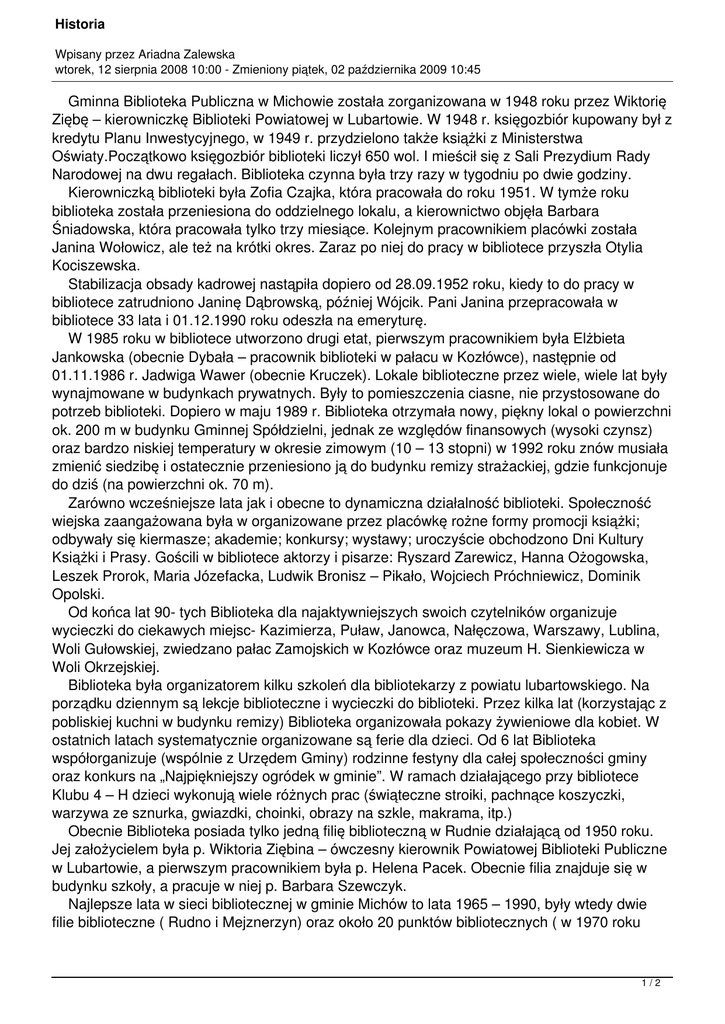 Historia Wpisany przez Ariadna Zalewska wtorek, 12 sierpnia 2008 10:00 - Zmieniony piątek, 02 października 2009 10:45 Gminna Biblioteka Publiczna w Michowie została zorganizowana w 1948 roku przez Wiktorię Ziębę – kierowniczkę Biblioteki Powiatowej w Lubartowie. W 1948 r. księgozbiór kupowany był z kredytu Planu Inwestycyjnego, w 1949 r. przydzielono także książki z Ministerstwa Oświaty.Początkowo księgozbiór biblioteki liczył 650 wol. I mieścił się z Sali Prezydium Rady Narodowej na dwu regałach. Biblioteka czynna była trzy razy w tygodniu po dwie godziny. Kierowniczką biblioteki była Zofia Czajka, która pracowała do roku 1951. W tymże roku biblioteka została przeniesiona do oddzielnego lokalu, a kierownictwo objęła Barbara Śniadowska, która pracowała tylko trzy miesiące. Kolejnym pracownikiem placówki została Janina Wołowicz, ale też na krótki okres. Zaraz po niej do pracy w bibliotece przyszła Otylia Kociszewska. Stabilizacja obsady kadrowej nastąpiła dopiero od 28.09.1952 roku, kiedy to do pracy w bibliotece zatrudniono Janinę Dąbrowską, później Wójcik. Pani Janina przepracowała w bibliotece 33 lata i 01.12.1990 roku odeszła na emeryturę. W 1985 roku w bibliotece utworzono drugi etat, pierwszym pracownikiem była Elżbieta Jankowska (obecnie Dybała – pracownik biblioteki w pałacu w Kozłówce), następnie od 01.11.1986 r. Jadwiga Wawer (obecnie Kruczek). Lokale biblioteczne przez wiele, wiele lat były wynajmowane w budynkach prywatnych. Były to pomieszczenia ciasne, nie przystosowane do potrzeb biblioteki. Dopiero w maju 1989 r. Biblioteka otrzymała nowy, piękny lokal o powierzchni ok. 200 m w budynku Gminnej Spółdzielni, jednak ze względów finansowych (wysoki czynsz) oraz bardzo niskiej temperatury w okresie zimowym (10 – 13 stopni) w 1992 roku znów musiała zmienić siedzibę i ostatecznie przeniesiono ją do budynku remizy strażackiej, gdzie funkcjonuje do dziś (na powierzchni ok. 70 m). Zarówno wcześniejsze lata jak i obecne to dynamiczna działalność biblioteki. Społeczność wiejska zaangażowana była w organizowane przez placówkę rożne formy promocji książki; odbywały się kiermasze; akademie; konkursy; wystawy; uroczyście obchodzono Dni Kultury Książki i Prasy. Gościli w bibliotece aktorzy i pisarze: Ryszard Zarewicz, Hanna Ożogowska, Leszek Prorok, Maria Józefacka, Ludwik Bronisz – Pikało, Wojciech Próchniewicz, Dominik Opolski. Od końca lat 90- tych Biblioteka dla najaktywniejszych swoich czytelników organizuje wycieczki do ciekawych miejsc- Kazimierza, Puław, Janowca, Nałęczowa, Warszawy, Lublina, Woli Gułowskiej, zwiedzano pałac Zamojskich w Kozłówce oraz muzeum H. Sienkiewicza w Woli Okrzejskiej. Biblioteka była organizatorem kilku szkoleń dla bibliotekarzy z powiatu lubartowskiego. Na porządku dziennym są lekcje biblioteczne i wycieczki do biblioteki. Przez kilka lat (korzystając z pobliskiej kuchni w budynku remizy) Biblioteka organizowała pokazy żywieniowe dla kobiet. W ostatnich latach systematycznie organizowane są ferie dla dzieci. Od 6 lat Biblioteka współorganizuje (wspólnie z Urzędem Gminy) rodzinne festyny dla całej społeczności gminy oraz konkurs na „Najpiękniejszy ogródek w gminie”. W ramach działającego przy bibliotece Klubu 4 – H dzieci wykonują wiele różnych prac (świąteczne stroiki, pachnące koszyczki, warzywa ze sznurka, gwiazdki, choinki, obrazy na szkle, makrama, itp.) Obecnie Biblioteka posiada tylko jedną filię biblioteczną w Rudnie działającą od 1950 roku. Jej założycielem była p. Wiktoria Ziębina – ówczesny kierownik Powiatowej Biblioteki Publiczne w Lubartowie, a pierwszym pracownikiem była p. Helena Pacek. Obecnie filia znajduje się w budynku szkoły, a pracuje w niej p. Barbara Szewczyk. Najlepsze lata w sieci bibliotecznej w gminie Michów to lata 1965 – 1990, były wtedy dwie filie biblioteczne ( Rudno i Mejznerzyn) oraz około 20 punktów bibliotecznych ( w 1970 roku 1/2 Historia Wpisany przez Ariadna Zalewska wtorek, 12 sierpnia 2008 10:00 - Zmieniony piątek, 02 października 2009 10:45 nawet 25.) 2/2