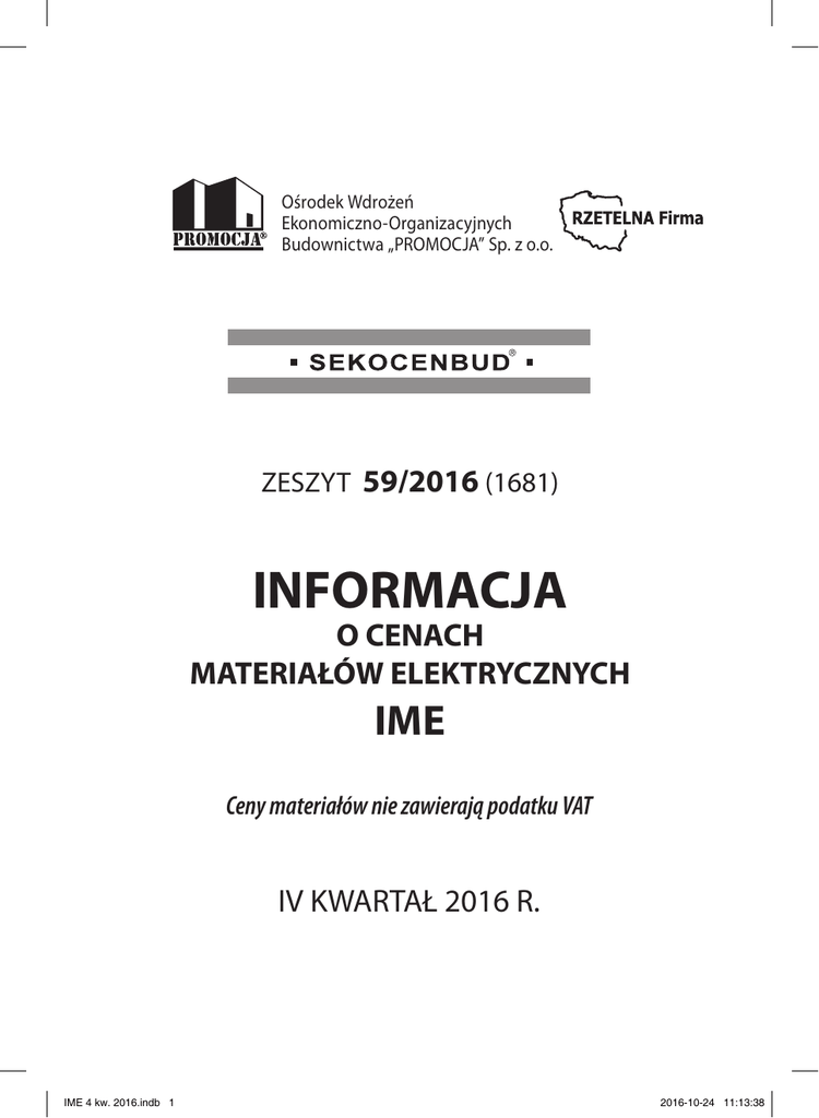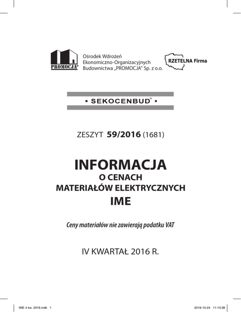 Ośrodek Wdrożeń Ekonomiczno-Organizacyjnych Budownictwa „PROMOCJA” Sp. z o.o. ZESZYT 59/2016 (1681) INFORMACJA O CENACH MATERIAŁÓW ELEKTRYCZNYCH IME Ceny materiałów nie zawierają podatku VAT IV KWARTAŁ 2016 R. IME 4 kw. 2016.indb 1 2016-10-24 11:13:38 SPIS TREŚCI Wprowadzenie ....................................................................................................................................................................5 Dział A. Ceny materiałów elektrycznych – z notowań ...................................................................................11 Grupa 70 Grupa 71 Grupa 72 Grupa 73 Grupa 74 Grupa 75 Grupa 76 Grupa 77 Grupa 78 Grupa 79 Grupa 80 Grupa 81 Grupa 82 Grupa 83 Grupa 84 Grupa 85 Grupa 86 Grupa 87 Grupa 89 Aparatura elektrotechniczna niskiego napięcia ................................................................................11 Aparatura elektroenergetyczna wysokiego napięcia (powyżej 1000V) ............................................25 Osprzęt sygnalizacyjny .....................................................................................................................26 NOWE MATERIAŁY Osprzęt oświetleniowy, klosze, wysięgniki.......................................................................................32 Izolatory oraz osprzęt izolatorowy i przewodowy.............................................................................45 Osprzęt instalacji elektrotechnicznych..............................................................................................49 Osprzęt kabli energetycznych...........................................................................................................66 Osprzęt kabli teletechnicznych i sygnalizacyjnych ............................................................................72 Osprzęt linii napowietrznych ............................................................................................................75 Przewody elektroenergetyczne .......................................................................................................76 NOWE MATERIAŁY Kable energetyczne, teletechniczne i sygnalizacyjne .......................................................................86 Słupy, szczudła, maszty, fundamenty i kanały kablowe .................................................................101 Metale nieżelazne i wyroby z nich ..................................................................................................105 Osprzęt różny .................................................................................................................................105 Wyroby chemiczne .........................................................................................................................110 Wyroby z papieru, tworzyw sztucznych, tekstylne i z gumy ...........................................................110 Kable teletechniczne światłowodowe ............................................................................................110 Kable i przewody radiofoniczne i antenowe ...................................................................................112 Materiały różne ..............................................................................................................................113 Dział B. Ceny materiałów elektrycznych wg producentów i przedstawicieli handlowych...............114 1. ABB Sp. z o.o. Warszawa (ABB) ............................................................................................................114 System przyzywowy, system nagłaśniania i interkomu AUDIO-WORLD 2. ADD Warszawa (ADD) .............................................................................................................................115 Urządzenia wideofonowe (wejściowe) 3. APKO Wrocław (APK) ..............................................................................................................................116 Zasilacze, sterowniki, sygnalizatory, detektory ruchu, wyświetlacze, znaki aktywne, głośniki, transformatory 4. APM PRO Sp. z o.o. Bielsko-Biała (APM) ..............................................................................................116 Wyświetlacze drogowe, sterowniki do oznakowania aktywnego drogowego, urządzenia do zliczania ruchu drogowego, oznakowanie drogowe aktywne: systemy SWAROLINIE i LEVELITE, znaki drogowe pracujące w trybie pulsującym 5. BAKS Kazimierz Sielski Karczew (BAK) ...............................................................................................117 Koryta kablowe 6. Błyskawica Sp. j. Wytwórnia Osprzętu Odgromowego Oława (WOO) ............................................118 Osprzęt do instalacji odgromowej, maszty odgromowe, stopy betonowe do masztów 7. CYFRAL Chabelska i Wspólnicy Sp.j. Zgierz (CYF) ..............................................................................120 Centrale i aparaty do domofonów 8. Danfoss Poland Sp. z o.o. DEVI Elektryczne Systemy Grzewcze Grodzisk Maz. (DEV) ...................120 Maty, przewody (kable), zestawy grzejne i urządzenia sterujące do systemów grzewczych 9. ELEKTRA Ożarów Mazowiecki (ELE) .....................................................................................................122 Przewody grzejne, maty grzejne, regulatory temperatury 10. ELEKTROBUD Wschowa (ELB)................................................................................................................123 Rozdzielnice, stacje transformatorowe IME 4/2016 IME 4 kw. 2016.indb 3 3 2016-10-24 11:13:39 SPIS TREŚCI 11. Elektromontaż Rzeszów SA (ELR) ........................................................................................................124 Słupy oświetleniowe, fundamenty do słupów i masztów oświetleniowych, korony ozdobne do słupów parkowych, wysięgniki do słupów 12. ELMAT Przedsiębiorstwo Handlowo-Usługowe Gorzów Wlkp. (ELM) ....................