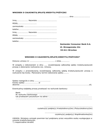 WNIOSEK O CAŁKOWITĄ SPŁATĘ KREDYTU/POśYCZKI ................ dnia ......................... Imię.................. Nazwisko .............................. PESEL……………………………….. zamieszkały: .................................................. telefon……………………………………………………………………. Imię.................. Nazwisko .............................. PESEL ………………………………. zamieszkały: .................................................. telefon……………………………………………………………………. Santander Consumer Bank S.A. Ul. Strzegomska 42c 53-611 Wrocław WNIOSEK O CAŁKOWITĄ SPŁATĘ KREDYTU/POśYCZKI* Dotyczy umowy nr ……………………………………………. z dnia……………… W związku z dokonaniem w dniu …… wcześniejszej całkowitej spłaty kredytu/poŜyczki proszę o dokonanie rozliczenia ww. Umowy. W związku z przewidywaną wcześniejszą całkowitą spłatą kredytu/poŜyczki proszę o wyliczenie tej kwoty. Planowany termin dokonania spłaty……….. Spłata nastąpi/ła w dniu …………………………… Kwota wpłaty ……………………… zł słownie:………………………………………………………………………………………………………………………………zł). Ewentualną nadpłatę proszę przekazać na rachunek bankowy: Bank: ............................................................................ Nr rachunku bankowego ............................................................................. lub przekazem pocztowym na adres :................................................................... ....................................................................................................................... ............................................................................ czytelny(e) podpis(y) Kredytobiorcy(ów) /PoŜyczkobiorcy(ów) ……………………………………………………………………………………… czytelny(e) podpis(y) WspółmałŜonka(ów) UWAGA: Niniejszy wniosek powinien być podpisany przez wszystkie osoby występujące w umowie kredytu/poŜyczki. *) niepotrzebne skreślić