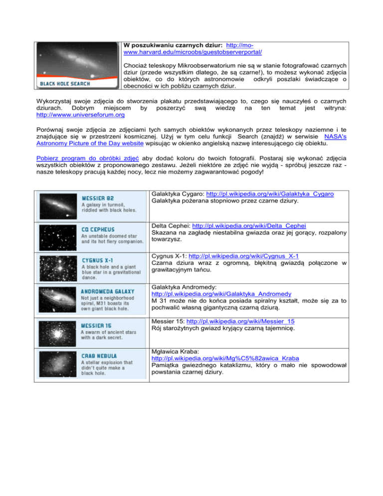 W poszukiwaniu czarnych dziur: http://mowww.harvard.edu/microobs/guestobserverportal/ Chociaż teleskopy Mikroobserwatorium nie są w stanie fotografować czarnych dziur (przede wszystkim dlatego, że są czarne!), to możesz wykonać zdjęcia obiektów, co do których astronomowie odkryli poszlaki świadczące o obecności w ich pobliżu czarnych dziur. Wykorzystaj swoje zdjęcia do stworzenia plakatu przedstawiającego to, czego się nauczyłeś o czarnych dziurach. Dobrym miejscem by poszerzyć swą wiedzę na ten temat jest witryna: http://wwww.universeforum.org Porównaj swoje zdjęcia ze zdjęciami tych samych obiektów wykonanych przez teleskopy naziemne i te znajdujące się w przestrzeni kosmicznej. Użyj w tym celu funkcji Search (znajdź) w serwisie NASA's Astronomy Picture of the Day website wpisując w okienko angielską nazwę interesującego cię obiektu. Pobierz program do obróbki zdjęć aby dodać koloru do twoich fotografii. Postaraj się wykonać zdjęcia wszystkich obiektów z proponowanego zestawu. Jeżeli niektóre ze zdjęć nie wyjdą - spróbuj jeszcze raz nasze teleskopy pracują każdej nocy, lecz nie możemy zagwarantować pogody! Galaktyka Cygaro: http://pl.wikipedia.org/wiki/Galaktyka_Cygaro Galaktyka pożerana stopniowo przez czarne dziury. Delta Cephei: http://pl.wikipedia.org/wiki/Delta_Cephei Skazana na zagładę niestabilna gwiazda oraz jej gorący, rozpalony towarzysz. Cygnus X-1: http://pl.wikipedia.org/wiki/Cygnus_X-1 Czarna dziura wraz z ogromną, błękitną gwiazdą połączone w grawitacyjnym tańcu. Galaktyka Andromedy: http://pl.wikipedia.org/wiki/Galaktyka_Andromedy M 31 może nie do końca posiada spiralny kształt, może się za to pochwalić własną gigantyczną czarną dziurą. Messier 15: http://pl.wikipedia.org/wiki/Messier_15 Rój starożytnych gwiazd kryjący czarną tajemnicę. Mgławica Kraba: http://pl.wikipedia.org/wiki/Mg%C5%82awica_Kraba Pamiątka gwiezdnego kataklizmu, który o mało nie spowodował powstania czarnej dziury.