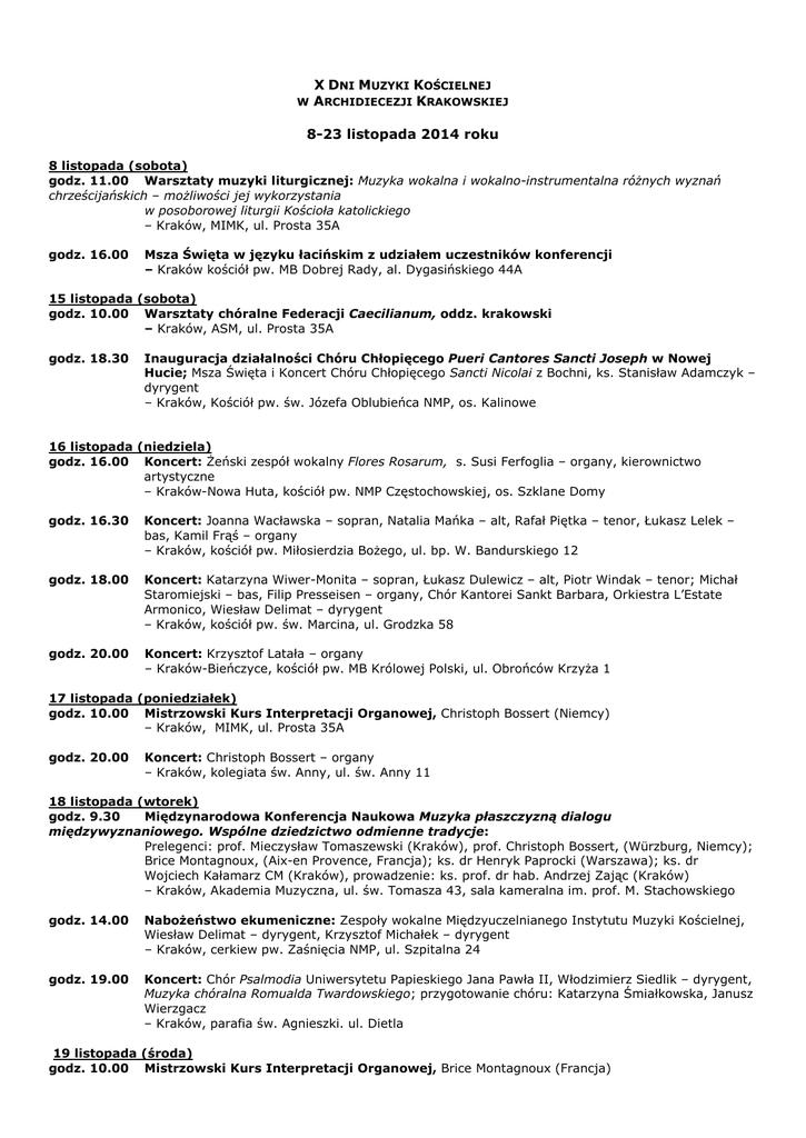 W X DNI MUZYKI KOŚCIELNEJ ARCHIDIECEZJI KRAKOWSKIEJ 8-23 listopada 2014 roku 8 listopada (sobota) godz. 11.00 Warsztaty muzyki liturgicznej: Muzyka wokalna i wokalno-instrumentalna różnych wyznań chrześcijańskich – możliwości jej wykorzystania w posoborowej liturgii Kościoła katolickiego – Kraków, MIMK, ul. Prosta 35A godz. 16.00 Msza Święta w języku łacińskim z udziałem uczestników konferencji – Kraków kościół pw. MB Dobrej Rady, al. Dygasińskiego 44A 15 listopada (sobota) godz. 10.00 Warsztaty chóralne Federacji Caecilianum, oddz. krakowski – Kraków, ASM, ul. Prosta 35A godz. 18.30 Inauguracja działalności Chóru Chłopięcego Pueri Cantores Sancti Joseph w Nowej Hucie; Msza Święta i Koncert Chóru Chłopięcego Sancti Nicolai z Bochni, ks. Stanisław Adamczyk – dyrygent – Kraków, Kościół pw. św. Józefa Oblubieńca NMP, os. Kalinowe 16 listopada (niedziela) godz. 16.00 Koncert: Żeński zespół wokalny Flores Rosarum, s. Susi Ferfoglia – organy, kierownictwo artystyczne – Kraków-Nowa Huta, kościół pw. NMP Częstochowskiej, os. Szklane Domy godz. 16.30 Koncert: Joanna Wacławska – sopran, Natalia Mańka – alt, Rafał Piętka – tenor, Łukasz Lelek – bas, Kamil Frąś – organy – Kraków, kościół pw. Miłosierdzia Bożego, ul. bp. W. Bandurskiego 12 godz. 18.00 Koncert: Katarzyna Wiwer-Monita – sopran, Łukasz Dulewicz – alt, Piotr Windak – tenor; Michał Staromiejski – bas, Filip Presseisen – organy, Chór Kantorei Sankt Barbara, Orkiestra L’Estate Armonico, Wiesław Delimat – dyrygent – Kraków, kościół pw. św. Marcina, ul. Grodzka 58 godz. 20.00 Koncert: Krzysztof Latała – organy – Kraków-Bieńczyce, kościół pw. MB Królowej Polski, ul. Obrońców Krzyża 1 17 listopada (poniedziałek) godz. 10.00 Mistrzowski Kurs Interpretacji Organowej, Christoph Bossert (Niemcy) – Kraków, MIMK, ul. Prosta 35A godz. 20.00 Koncert: Christoph Bossert – organy – Kraków, kolegiata św. Anny, ul. św. Anny 11 18 listopada (wtorek) godz. 9.30 Międzynarodowa Konferencja Naukowa Muzyka płaszczyzną dialogu międzywyznaniowego. Wspólne dziedzictwo odmienne tradycje: Prelegenci: prof. Mieczysław Tomaszewski (Kraków), prof. Christoph Bossert, (Würzburg, Niemcy); Brice Montagnoux, (Aix-en Provence, Francja); ks. dr Henryk Paprocki (Warszawa); ks. dr Wojciech Kałamarz CM (Kraków), prowadzenie: ks. prof. dr hab. Andrzej Zając (Kraków) – Kraków, Akademia Muzyczna, ul. św. Tomasza 43, sala kameralna im. prof. M. Stachowskiego godz. 14.00 Nabożeństwo ekumeniczne: Zespoły wokalne Międzyuczelnianego Instytutu Muzyki Kościelnej, Wiesław Delimat – dyrygent, Krzysztof Michałek – dyrygent – Kraków, cerkiew pw. Zaśnięcia NMP, ul. Szpitalna 24 godz. 19.00 Koncert: Chór Psalmodia Uniwersytetu Papieskiego Jana Pawła II, Włodzimierz Siedlik – dyrygent, Muzyka chóralna Romualda Twardowskiego; przygotowanie chóru: Katarzyna Śmiałkowska, Janusz Wierzgacz – Kraków, parafia św. Agnieszki. ul. Dietla 19 listopada (środa) godz. 10.00 Mistrzowski Kurs Interpretacji Organowej, Brice Montagnoux (Francja) – Kraków, MIMK, ul. Prosta 35A, aula godz. 19. 00 Koncert: Brice Montagnoux – organy – Kraków-Dąbie, kościół pw. św. Stanisława BM, ul. Zwycięstwa 21 20 listopada (czwartek) godz. 17.00 Uroczysta Msza Święta; chór Archidiecezjalnej Szkoły Muzycznej Pueri Cantores Cracovienses, połączone chóry Federacji Caecilianum Katarzyna Wiwer-Monita – sopran, Agnieszka Szostak – alt, Piotr Windak – tenor, Michał Staromiejski – bas, orkiestra L’Estate Armonico, Wiesław Delimat – dyrygent – Kraków, Sanktuarium św. Jana Pawła II, ul. Totus Tuus 32 godz. 19.30 Koncert: studenci Międzyuczelnianego Instytutu Muzyki Kościelnej i Katedry Organów Akademii Muzycznej w Krakowie – Kraków, Wyższe Seminarium Duchowne Archidiecezji Krakowskiej, ul. Podzamcze 8 21 listopada (piątek) godz. 10.00 VII Krakowski Konkurs Młodych Organistów, etap I – Kraków, ASM/MIMK ul. Prosta 35A godz. 17.00 Msza Święta transmitowana przez TVP 3: animacja muzyczna zespoły wokalne Międzyuczelnianego Instytutu Muzyki Kościelnej, Krzysztof Michałek – organy, Wiesław Delimat – dyrygent – Kraków, Sanktuarium św. Jana Pawła II, ul. Totus Tuus 32 22 listopada (sobota) godz. 10.00 Dzień skupienia organistów Archidiecezji Krakowskiej, prowadzenie ks. Robert Tyrała; Uroczysta Msza św. Koncert organowy uczniów Archidiecezjalnej Szkoły Muzycznej II st. im. ks. kard. F. Macharskiego:: Piotr Matejek, Patrycja Knapik – Kraków, kościół pw. Miłosierdzia Bożego, ul. bp. W. Bandurskiego 12 godz. 10.00 VII Krakowski Konkurs Młodych Organistów, etap II – Kraków, POSM II st. im. F. Chopina, ul. Basztowa 6 godz. 17.00 Uroczyste nieszpory chóralne – Kraków-Łagiewniki, Bazylika Bożego Miłosierdzia, ul. Siostry Faustyny 3 godz. 19.00 VII Krakowski Konkurs Młodych Organistów, koncert laureatów – Kraków, Akademia Muzyczna, ul. św. Tomasza 43, sala 404 23 listopada (niedziela) godz. 12.15 Koncert: Marek Wolak – organy; Paweł Ciuła – organy; Chór Canticum Cantorum; Piotr Ciuła – dyrygent – Libiąż, kościół pw. św. Barbary, ul. ks. Stanisława Pieli 11 godz. 16.00 Koncert: Joanna Radziszewska – sopran, Jan Baciak – organy – Jaśkowice, kościół pw. NMP Matki Kościoła, Jaśkowice 13a godz. 16.45 Koncert: Krzysztof Hotloś – organy – Kraków, kościół pw. Bernardyna ze Sieny, ul. Bernardyńska 2 godz. 17.45 Koncert: Witold Zalewski – organy – Podłęże, kościół pw. NMP Królowej Polski, Podłęże 375 godz. 18.00 Koncert: Agata Kucz – flet, Urszula Dereń-Kokoszka – organy, – Chrzanów, kościół pw. św. Rodziny, ul. Pogorska 43 f godz. 19.45 Koncert: Maciej Banek – organy, Anna Warchał – recytacje – Kraków-Salwator, kościół pw. św. Augustyna i św. Jana Chrzciciela, ul. Kościuszki 88 2