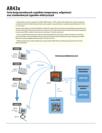 AR43x Seria bezprzewodowych czujników temperatury, wilgotności oraz standardowych sygnałów elektrycznych Bezprzewodowa sieć oparta na urządzeniach serii AR4xx (AR406 rejestrator + AR43x czujniki) umożliwia zdalny pomiar i rejestrację temperatury oraz wilgotności lub innych wielkości fizycznych (ciśnienie, poziom, prędkość, itp.) przetworzonych na standardowy sygnał elektryczny (0/4÷20 mA, 0÷10 V, 0÷60 mV). Transmisja radiowa odbywa się w paśmie ISM 868 MHz z modulacją FSK. Zasięg do 200 m w przestrzeni otwartej. W budynkach zasięg zależny jest od elementów strukturalnych takich jak rodzaj i grubości ścian, stropów, drzwi, itp. Siedem kanałów radiowych umożliwia niezależną pracę sąsiadujących ze sobą zestawów AR406 z czujnikami co łącznie pozwala na rejestrację aż 112 kanałów pomiarowych. Pomiary z czujników AR43x przekazywane są radiowo do stacji bazowej AR406, która rejestruje dane w pamięci wewnętrznej, na karcie SD lub pamięci USB. Dostęp do stacji bazowej AR406 możliwy jest poprzez interfejs Ethernet lub USB. AR406 posiada również wbudowany serwer WWW dzięki czemu możliwy jest podgląd aktualnych pomiarów w sieci LAN oraz Internet. Bezpłatne oprogramowanie umożliwia konfigurację i monitoring urządzeń (ARSoft-WZ1) oraz archiwizację danych pomiarowych i tworzenie raportów (ARSoft-WZ3). Czujnik 1 AR436 Schemat przykładowej sieci temperatura wilgotność Czujnik 2 868 MHz AR431 KONFIGURACJA MONITORING temperatura Czujnik 3 AR435 Ethernet USB AR406 temperatura wilgotność LAN Internet ARSoft-WZ1 ARCHIWIZACJA RAPORTY ARSoft-WZ3 Serwer WWW Czujnik 16 AR434 temperatura Pt100 AR131 Charakterystyka n seria bezprzewodowych czujników przeznaczona do współpracy z rejestratorem AR406 n transmisja radiowa w pasmie ISM 868MHz, zasięg do 200 m (w przestrzeni otwartej) - zależny od lokalnych warunków propagacji fal radiowych: rodzaju i grubości ścian, stropów, itp. AR431 AR435 n 7 kanałów radiowych umożliwiających niezależną pracę siedmiu sąsiadujących zestawów składających się z rejestratorów AR406 i powiązanych z nimi czujników n dostępne modele: AR432 AR436 Dla powyższych modeli istnieje możliwość umieszczenia elementu pomiarowego w zewnętrznej sondzie AR433 - AR431, AR432 - pomiar temperatury w zakresie -30÷80 °C lub-20÷70 °C, czujnik 1-kanałowy - AR433, AR434 - uniwersalne wejście pomiarowe termometryczne i analogowe (Pt100/Ni100/J/K/S/B/ R/T/E/N/0÷20mA/ 4÷20mA/0÷10V/0÷60mV/0÷700Ω ) oraz wbudowany pomiar temperatury otoczenia (-20÷70 °C), czujnik 2-kanałowy - kompensacja rezystancji linii dla czujników rezystancyjnych oraz temperatury zimnych końców termopar (automatyczna lub stała) - AR435, AR436 - pomiar wilgotności względnej i temperatury (-30÷80 °C lub-20÷70 °C), 2-kanałowy n sondy temperatury oraz wilgotności zintegrowane w obudowie lub zewnętrzne n AR432, AR434, AR436: - wyświetlacz LCD pokazujący wartości mierzone oraz komunikaty i błędy - alarmy dolne, górne, w paśmie i poza pasmem, sygnalizacja diodą LED n możliwość prezentacji i rejestracji danych z maksymalnie 16-tu kanałów pomiarowych w pojedynczym rejestratorze AR406 (z dowolnych czujników 1- lub 2-kanałowych) n obudowa przenośna dostosowana do montażu naściennego n zasilanie bateryjne z możliwością wymiany baterii we własnym zakresie n długi czas pracy na nowej baterii (do 5 lat bez wyświetlacza LCD, w temperaturze pokojowej, okresie pomiarowym > 30 min i niezakłóconej transmisji radiowej) n dołączone bezpłatne oprogramowanie umożliwiające prezentację graficzną lub tekstową zarejestrowanych (w AR406) wyników oraz konfigurację parametrów n programowalna rozdzielczość wskazań, parametry kalibracyjne, alarmowe, numer identyfikacyjny (ID), rodzaj wejścia i zakres pomiarowy dla sygnałów analogowych (AR433/434) oraz inne parametry konfiguracyjne n konfiguracja parametrów poprzez interfejs szeregowy USB n zabezpieczenie przed odwrotnym włożeniem baterii n wysoka dokładność, długoterminowa stabilność pomiarów i odporność na zakłócenia n zgodność z dyrektywą R&TTE (99/5/WE) n możliwość samodzielnej aktualizacji firmware czujnika Zawartość zestawu: - czujnik z anteną na pasmo 868MHz i baterią litową 3,6V typu AA (SAFT LS14500) - kabel USB (A4 - miniA4) do połączenia z komputerem, długość 2m - płyta CD ze sterownikami i oprogramowaniem (Windows 2000/XP/Vista/7) - instrukcja obsługi - karta gwarancyjna Dostępne akcesoria: - kabel antenowy SMA gniazdo i wtyk,impedancja 50 Ω, długość 2m - bateria litowa 3,6V typ AA (R6), 2450mAh - zasilacz stabilizowany 5V/150mA - filtr z siatką metalową do ochrony czujnika wilgotnosci przed kurzem dla sond zewnętrznych(AR435/436) AR434 Dane techniczne Obudowa i sposób montażu Zakres pomiarowy sond temperatura naścienne 0÷100 %RH, histereza ±1% RH, stabilność długoterminowa <0,5% RH/rok Wymiary 80 × 80 × 25 mm temperatura ±0,5°C w zakresie -10÷80°C oraz ±0,5÷1,5°C w pozostałym zakresie, dla AR435/436: ±0,5°C dla 20÷30°C oraz ±0,5÷1,8°C w pozostałym zakresie ±3 %RH w zakresie 20÷80 %RH, ±3÷5 %RH w pozostałym zakresie Materiał ABS UL94-V0, kolor biały Stopień ochrony IP20 wilgotność termorezystancyjne Wejście (RTD) i rezystancyjne pomiarowe w AR433 i AR434 (1 uniwersalne, termoparowe (TC) programowalne przez interfejs USB) prądowe Pt100 (zakres pomiarowy -200÷850°C), Ni100 (-50÷170°C), 0÷700 Ω, 3lub 2-przewodowe, rezystancja doprowadzeń Rd < 25 Ω (dla każdej linii), prąd polaryzujący ~480 μA (impulsowy) USB J (-40÷800 °C), K (-40÷1200 °C), S (-40÷1600 °C), B (300÷1800 °C), R (-40÷1600 °C), T (-25÷350 °C), E (-25÷680 °C), N (-35÷1300 °C) 100 - podstawowy: 0,1 % (0,2 % dla TC) zakresu pomiarowego ±1 cyfra - dodatkowy dla termopar: <2 °C (temperatura zimnych końców) - dodatkowy od zmian temp. otoczenia: < 0,005 % zakresu wejścia /°C Rozdzielcz