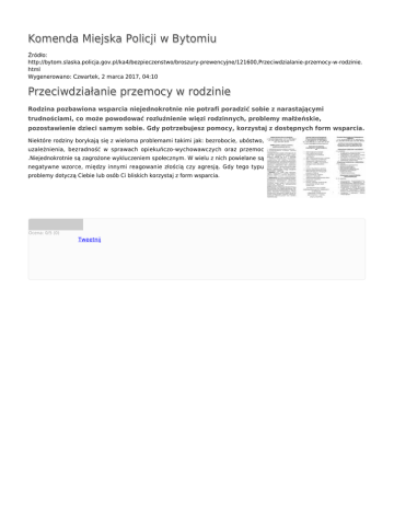 Komenda Miejska Policji w Bytomiu Źródło: http://bytom.slaska.policja.gov.pl/ka4/bezpieczenstwo/broszury-prewencyjne/121600,Przeciwdzialanie-przemocy-w-rodzinie. html Wygenerowano: Czwartek, 2 marca 2017, 04:10 Przeciwdziałanie przemocy w rodzinie Rodzina pozbawiona wsparcia niejednokrotnie nie potrafi poradzić sobie z narastającymi trudnościami, co może powodować rozluźnienie więzi rodzinnych, problemy małżeńskie, pozostawienie dzieci samym sobie. Gdy potrzebujesz pomocy, korzystaj z dostępnych form wsparcia. Niektóre rodziny borykają się z wieloma problemami takimi jak: bezrobocie, ubóstwo, uzależnienia, bezradność w sprawach opiekuńczo-wychowawczych oraz przemoc .Niejednokrotnie są zagrożone wykluczeniem społecznym. W wielu z nich powielane są negatywne wzorce, między innymi reagowanie złością czy agresją. Gdy tego typu problemy dotyczą Ciebie lub osób Ci bliskich korzystaj z form wsparcia. Ocena: 0/5 (0) Tweetnij