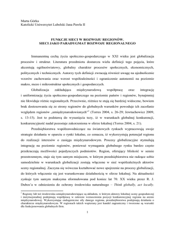 Marta Górka Katolicki Uniwersytet Lubelski Jana Pawła II FUNKCJE SIECI W ROZWOJU REGIONÓW. SIECI JAKO PARADYGMAT ROZWOJU REGIONALNEGO Immanentną cechą życia społeczno-gospodarczego w XXI wieku jest globalizacja procesów i struktur. Literatura przedmiotu dostarcza wielu definicji tego pojęcia, które akcentują ogólnoświatowy, globalny charakter procesów społecznych, ekonomicznych, politycznych i technicznych. Autorzy tych definicji zwracają również uwagę na ujednolicenie wzorów zachowania oraz wzrost współzależności i ograniczenie autonomii na poziomie makro, mezo i mikrostruktur społecznych i gospodarczych. Globalizacja zakładająca międzynarodową współpracę oraz integrację i uniformizację życia społeczno-gospodarczego na poziomie państw i regionów, bynajmniej nie likwiduje różnic regionalnych. Przeciwnie, różnice te stają się bardziej widoczne, bowiem brak dostosowania się ze strony regionów do globalnych warunków powoduje ich zacofanie względem regionów „umiędzynarodowionych”1 (Torres 2004, s. 26-29; Jewtuchowicz 2009, s. 13-15). Jest to podstawą do wysunięcia tezy, iż w warunkach globalnej konkurencji, konkurencyjność nadal pozostaje zakorzeniona w sferze lokalnej (Torres 2004, s. 21). Przedsiębiorstwa współzawodniczące na światowych rynkach wypracowują swoje strategie działania w oparciu o rynki lokalne, co oznacza, iż wykorzystują potencjał regionu do realizacji interesów o zasięgu międzynarodowym. Procesy globalizacyjne stymulują integrację na poziomie regionów, ponieważ wymagania globalnego rynku bardzo często przekraczają możliwości pojedynczych podmiotów. Region, oferujący bliskość w sensie przestrzennym, staje się tym samym miejscem, w którym przedsiębiorstwa nie radzące sobie samodzielnie w warunkach globalizacji zostają włączone w sieć współzależnych aktorów sceny regionalnej. Zaczyna się wówczas kształtować nowe spojrzenie na procesy globalizacji, do których włączenie się jest warunkowane działalnością w sferze lokalnej. Na aktualności zyskuje tym samym maksyma sformułowana pod koniec lat 70. XX wieku przez R. J. Dubos’a w odniesieniu do ochrony środowiska naturalnego – Think globally, act locally. 1 Regiony lub też środowiska umiędzynarodawiające są układem, w którym aktorzy lokalnej sceny gospodarczej i instytucjonalnej podejmują współpracę w zakresie wzmocnienia pozycji konkurencyjnej regionu na arenie międzynarodowej. Wykorzystując endogeniczne siły danego regionu, przedsiębiorstwa podejmują działania o charakterze międzynarodowym. W regionach takich wspierany jest handel zagraniczny i tworzone są warunki dla funkcjonowania globalnych firm. 1 Hasła tego, w późniejszym okresie, zaczęto stosować dla określenia innych aspektów życia społeczno-gospodarczego, przewrotnie odwracając jego brzmienie – Myśl lokalnie, działaj globalnie. W tym krótkim wyrażeniu zawarte jest pojęcie glokalizacji jako połączenia globalnego i lokalnego wymiaru rozwoju (Krzysztofek i Szczepański 2005, s. 156-159), a co za tym idzie, określenia nowych ram rozwoju regionalnego opartego na terytorium, gospodarce opartej na wiedzy oraz paradygmacie sieci społecznych. „Życie nie składa się jedynie z rozwoju w czasie, lecz również ze zróżnicowań w przestrzeni. Jeżeliby wszystko działo się w tym samym czasie, wówczas nie byłoby w ogóle rozwoju. Jeżeliby wszystko znajdowało się w tym samym miejscu, wówczas nie byłoby w ogóle odrębności. Tylko przestrzeń umożliwia istnienie odrębności, które następnie rozwijają się w czasie (…)” (Lösch 1961, s. 380). W twierdzeniu tym, którego autorem jest niemiecki teoretyk gospodarki przestrzennej A. Lösch wskazane zostały dwa główne czynniki determinujące rozwój regionalny – czas i miejsce. Kategoria czasu jest niezbędna by określić rozwój per se, bowiem generalnie ujmując, rozwój jest to nowy etap w zmieniającej się sytuacji, lub też pewien proces, który określa pozytywną zmianę istniejącego stanu rzeczy. Zmiana zawsze następuje w czasie, tylko w odniesieniu do czasu zmiana może zostać zdefiniowana. Wielowymiarowość rozwoju przejawia się w tym, iż może dotyczyć różnorodnych systemów oraz struktur społeczno-gospodarczych, które zawsze osadzone są w konkretnej przestrzeni fizycznej. Rozwój tym samym staje się czynnikiem, który różnicuje jednostki terytorialne – decyduje o ich odrębności. Rozwój na poziomie regionalnym definiowany jest jako wzrost potencjału gospodarczego oraz konkurencyjności regionu w wymiarze ilościowym, jakościowym oraz strukturalnym. To rozwój w sensie ekonomicznym i społecznym, który określany jest poprzez następujące przyrodnicze, komponenty: zasoby potencjał naturalne, gospodarczy, zagospodarowanie strukturę gospodarki, infrastrukturalne, środowisko poziom życia mieszkańców, infrastrukturę technologiczną, specyfikę rynku pracy (Nijkamp i Abreu 2009; Chądzyński i in. 2007, s. 39-40). W odniesieniu do tych i wielu innych czynników kształtowane są międzyregionalne różnice, które decydują o pozycji konkurencyjnej danego regionu w skali krajowej oraz globalnej. Globalizacja stwarza nowe warunki dla rozwoju regionalnego, stąd też wielu badaczy podjęło problematykę regionu i jego znaczenia w globalizującym się świecie. Międzynarodowa integracja gospodarcza, względna homogenizacja kultury, rozwój instytucji o charakterze globalnym oraz postęp technologiczny przełamujący bariery czasu i przestrzeni 2 zakwestionowały jednak istotność terytorium. Zaczęto obwieszczać „koniec terytorium” (Badie 1995), powstanie globalnego społeczeństwa sieci (Castells 2011), które oderwane jest od konkretnego miejsca. Z drugiej jednak strony, różnice międzyregionalne stały się bardziej widoczne, dlatego też kategorię terytorium nadal stosuje się do wyjaśniania zmian społecznogospodarc