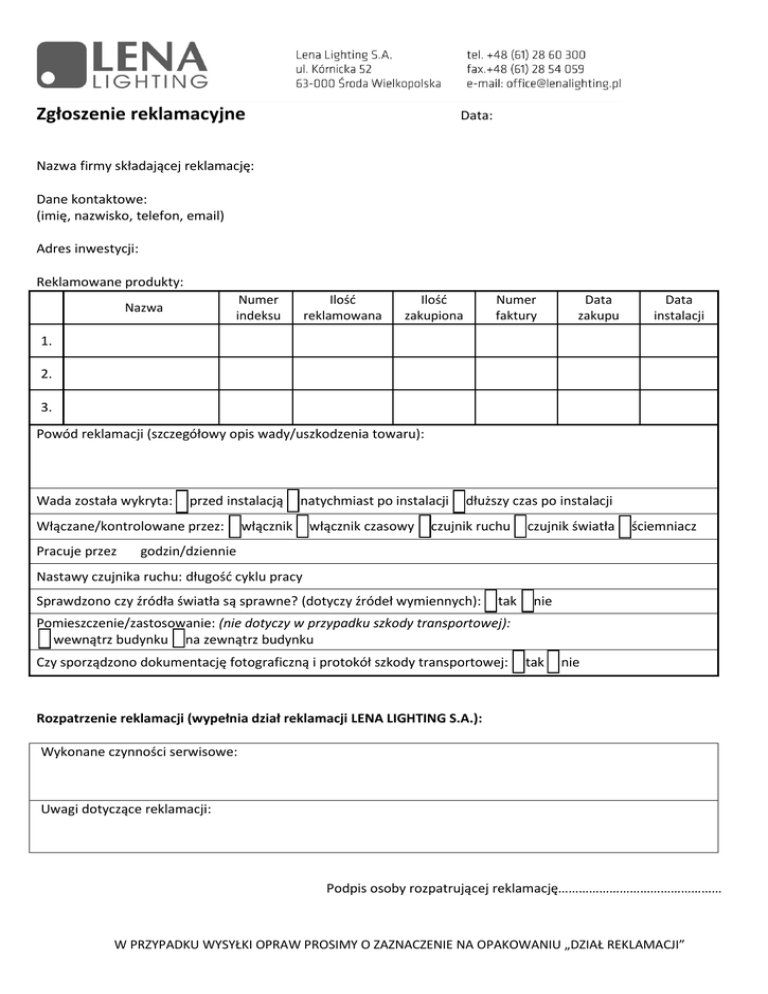 Zgłoszenie reklamacyjne Data: Nazwa firmy składającej reklamację: Dane kontaktowe: (imię, nazwisko, telefon, email) Adres inwestycji: Reklamowane produkty: Numer indeksu Nazwa Ilość reklamowana Ilość zakupiona Numer faktury Data zakupu Data instalacji 1. 2. 3. Powód reklamacji (szczegółowy opis wady/uszkodzenia towaru): Wada została wykryta: przed instalacją Włączane/kontrolowane przez: Pracuje przez natychmiast po instalacji włącznik włącznik czasowy dłuższy czas po instalacji czujnik ruchu czujnik światła ściemniacz godzin/dziennie Nastawy czujnika ruchu: długość cyklu pracy Sprawdzono czy źródła światła są sprawne? (dotyczy źródeł wymiennych): tak nie Pomieszczenie/zastosowanie: (nie dotyczy w przypadku szkody transportowej): wewnątrz budynku na zewnątrz budynku Czy sporządzono dokumentację fotograficzną i protokół szkody transportowej: tak nie Rozpatrzenie reklamacji (wypełnia dział reklamacji LENA LIGHTING S.A.): Wykonane czynności serwisowe: Uwagi dotyczące reklamacji: Podpis osoby rozpatrującej reklamację………………………………………… W PRZYPADKU WYSYŁKI OPRAW PROSIMY O ZAZNACZENIE NA OPAKOWANIU „DZIAŁ REKLAMACJI”
