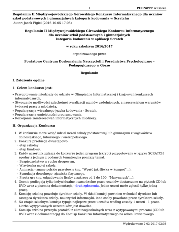 1 PCDNiPPP w Górze Regulamin II Międzywojewódzkiego Górowskiego Konkursu Informatycznego dla uczniów szkół podstawowych i gimnazjalnych kategoria kodowania w Scratchu Autor: Jacek Figiel (2016-10-05 17:05) Regulamin II Międzywojewódzkiego Górowskiego Konkursu Informatycznego dla uczniów szkół podstawowych i gimnazjalnych kategoria kodowania w aplikacji Scratch w roku szkolnym 2016/2017 organizowanego przez Powiatowe Centrum Doskonalenia Nauczycieli i Poradnictwa Psychologiczno Pedagogicznego w Górze Regulamin I. Założenia ogólne 1. Celem konkursu jest: ● ● ● ● ● Przygotowanie młodzieży do udziału w Olimpiadzie Informatycznej i krajowych konkursach informatycznych, Stworzenie możliwości szlachetnej rywalizacji uczniów uzdolnionych, a nauczycielom warunków twórczej pracy z młodzieżą, Popularyzacja wizualnego języka kodowania - Scratch, Popularyzacja umiejętności programowania, Rozwijanie zainteresowań informatycznych młodzieży. II. Organizacja Konkursu 1. W konkursie może wziąć udział uczeń szkoły podstawowej lub gimnazjum z województw dolnośląskiego, lubuskiego i wielkopolskiego. 2. Konkurs przebiega dwuetapowo: etap szkolny etap finałowy. 3. Każdy uczestnik zgłasza do konkursu jeden program (skrypt) przygotowany w języku SCRATCH zgodny z jednym z podanych tematów/na poniższy temat. Bezpieczeństwo w ruchu drogowym, Wizytówka mojej szkoły, Animacja - znane polskie przysłowie (np. “Wpaść jak śliwka w kompot”...), Symulacja dowolnego zjawiska fizycznego, Prosta gra (np. odgadywanie liczby z zakresu od 1 do 100, "Marynarzyk"...). 4. Ocenie podlegają tylko indywidualne i samodzielne prace uczniów dostarczone na płytach CD lub DVD wraz z pisemną dokumentacją - druk zgłoszenia. Jeden uczeń może zgłosić tylko jedną pracę. 5. Komisję szkolną powołuje dyrektor szkoły. W skład komisji powinien wchodzić dyrektor lub zastępca dyrektora szkoły, nauczyciel informatyki, inne osoby powołane przez dyrektora szkoły. 6. Na etapie szkolnym komisja typuje najlepsze prace uczniów według zasady 1 uczeń - 1 praca. Liczba wytypowanych uczestników jest dowolna. 7. Komisja szkolna przesyła protokół z eliminacji szkolnych wraz z wytypowanymi pracami (CD lub DVD wraz z dokumentacją) do Komisji Konkursu Informatycznego na adres Powiatowego ❍ ❍ ❍ ❍ ❍ ❍ ❍ Wydrukowano 2-03-2017 03:03 PCDNiPPP w Górze 2 Centrum Doskonalenia Nauczycieli i Poradnictwa Psychologiczno - Pedagogicznego w Górze. 8. O zakwalifikowaniu uczestnika do eliminacji finałowych decyduje Komisja Konkursu Informatycznego na podstawie oceny przesłanej pracy. 9. Do czuwania na przebiegiem konkursu powołana zostaje przez dyrektora PCDNiPPP w Górze Komisja Konkursu Informatycznego. 10. W skład komisji wchodzą nauczyciele informatyki i innych przedmiotów. Dopuszcza się włączenie w skład komisji osób nie będących nauczycielami. 11. Finał konkursu odbędzie się w wybranej placówce na terenie Powiatu Górowskiego z przestrzeganiem następujących zasad: każdy uczestnik ma do dyspozycji na czas eliminacji komputer typu IBM PC - bez dostępu do Internetu, uczestnik może korzystać z ogólnodostępnej literatury informatycznej (podręczniki, instrukcje obsługi), niedozwolone jest korzystanie z przyniesionych gotowych rozwiązań problemów, czas wykonania zadania finałowego jest limitowany i wynosi 120 minut plus czas na przygotowanie stanowiska, zadania konkursowe opracowuje Komisja Konkursu Informatycznego, na eliminacje organizator zapewnia oprogramowanie Scratch w wersji 2.0 (do pobrania z http://pcdn.edu.pl - zakładka Konkursy). 12. Oceny końcowej prac i wyłonienia laureatów dokonuje Komisja Konkursu Informatycznego. ❍ ❍ ❍ ❍ ❍ ❍ III. Kryteria oceny prac konkursowych: 1. 2. 3. 4. 5. oryginalność, wrażenia wizualne, dobór dźwięków, złożoność, ze szczególnym uwzględnieniem użycia bloków z kategorii "Czujniki" i "Wyrażenia", poprawność działania. IV. Terminarz eliminacji: 1. Eliminacje szkolne odbywają się w szkołach do dnia 3 marca 2017 r. 2. Prace należy dostarczyć do dnia 6 marca 2017 r. do PCDNiPPP w Górze, pl. Bolesława Chrobrego 27, 56-200 Góra. Liczy się data wpływu do sekretariatu. 3. Finał odbędzie się 7 kwietnia 2017 r. o godzinie 9.00 w Powiatowym Centrum Doskonalenia Nauczycieli w Górze. Dyrektorzy szkół o zakwalifikowaniu uczestników zostaną poinformowani drogą elektroniczną. 4. Wyniki eliminacji finałowych zostaną opublikowane w zakładce konkursy na stronie PCDNiPPP w Górze. 5. Uroczyste podsumowanie konkursu odbędzie się 21 kwietnia 2017 r. o godzinie 13.00 w PCDNiPPP w Górze. V. Sponsorzy: 1. Nagrody dla laureatów konkursu funduje Starostwo Powiatowe w Górze i inni sponsorzy. 2. Organizatorzy zapewniają ogłoszenie listy sponsorów w Internecie na stronie WWW konkursu oraz reklamę w czasie eliminacji konkursowych. VI. OCHRONA DANYCH OSOBOWYCH 1. Uczestnictwo w Konkursie jest równoznaczne z wyrażeniem zgody przez osoby biorące w nim udział, a w przypadku osób nieletnich - ich rodziców/opiekunów prawnych, na przetwarzanie Wydrukowano 2-03-2017 03:03 3 PCDNiPPP w Górze przez Organizatora danych osobowych uczniów. W szczególności na: publicznym podaniu imienia i nazwiska, klasy oraz szkoły, do której osoba biorąca udział w Konkursie uczęszcza, a także publikacji jej wizerunku, zgodnie z ustawą z dnia 29 sierpnia 1997 r. o ochronie danych osobowych (Dz. U. z 2014 r. poz. 1182 z późn. zm.). 2. Organizator informuje, że zgodnie z art. 24 ust. l pkt 3 ustawy wskazanej w ust. 1 osobom tym przysługuje prawo wglądu do danych oraz ich poprawienia. 3. W wypadku, gdy osoby biorące udział w Konkursie, a w przypadku osób nieletnich - ich rodzice/ opiekunowie prawni nie wyrażają zgody na przetwarzanie danych osobowych, o których mowa w ust. 1, zobowiązani są do pisemnego poinformowania o tym Organizatora Konkursu. 4. W czasie trwania tur