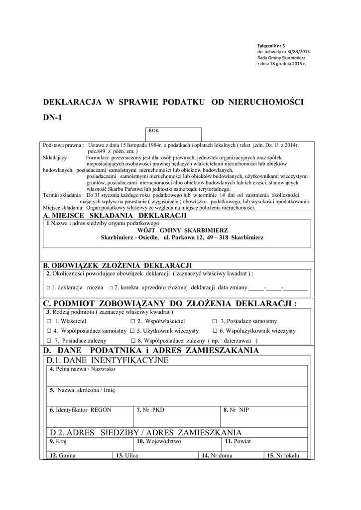 Załącznik nr 5 do uchwały nr XI/83/2015 Rady Gminy Skarbimierz z dnia 18 grudnia 2015 r. DEKLARACJA W SPRAWIE PODATKU OD NIERUCHOMOŚCI DN-1 ROK Podstawa prawna : Ustawa z dnia 15 listopada 1984r. o podatkach i opłatach lokalnych ( tekst jedn. Dz. U. z 2014r. poz.849 z późn. zm. ) Składający : Formularz przeznaczony jest dla osób prawnych, jednostek organizacyjnych oraz spółek nieposiadających osobowości prawnej będących właścicielami nieruchomości lub obiektów budowlanych, posiadaczami samoistnymi nieruchomości lub obiektów budowlanych, posiadaczami samoistnymi nieruchomości lub obiektów budowlanych, użytkownikami wieczystymi gruntów, posiadaczami nieruchomości albo obiektów budowlanych lub ich części, stanowiących własność Skarbu Państwa lub jednostki samorządu terytorialnego. Termin składania : Do 31 stycznia każdego roku podatkowego lub w terminie 14 dni od zaistnienia okoliczności mających wpływ na powstanie ( wygaśnięcie ) obowiązku podatkowego, lub wysokości opodatkowania. Miejsce składania: Organ podatkowy właściwy ze względu na miejsce położenia nieruchomości. A. MIEJSCE SKŁADANIA DEKLARACJI 1.Nazwa i adres siedziby organu podatkowego WÓJT GMINY SKARBIMIERZ Skarbimierz - Osiedle, ul. Parkowa 12, 49 – 318 Skarbimierz B. OBOWIĄZEK ZŁOŻENIA DEKLARACJI 2. Okoliczności powodujące obowiązek deklaracji ( zaznaczyć właściwy kwadrat ) : □ 1. deklaracja roczna □ 2. korekta uprzednio złożonej deklaracji data zmiany _____-_____-________ C. PODMIOT ZOBOWIĄZANY DO ZŁOŻENIA DEKLARACJI : 3. Rodzaj podmiotu ( zaznaczyć właściwy kwadrat ) □ 1. Właściciel □ 2. Współwłaściciel □ 3. Posiadacz samoistny □ 4. Współposiadacz samoistny □ 5. Użytkownik wieczysty □ 6. Współużytkownik wieczysty □ 7. Posiadacz zależny □ 8. Współposiadacz zależny ( np. dzierżawca ) D. DANE PODATNIKA i ADRES ZAMIESZAKANIA D.1. DANE INENTYFIKACYJNE 4. Pełna nazwa / Nazwisko 5. Nazwa skrócona / Imię 6. Identyfikator REGON 7. Nr PKD 8. Nr NIP D.2. ADRES SIEDZIBY / ADRES ZAMIESZKANIA 9. Kraj 12. Gmina 10. Województwo 13. Ulica 11. Powiat 14. Nr domu 15. Nr lokalu 16. Miejscowość 17. Kod pocztowy 19. Nr telefonu 18. Poczta 20. Adres e-mail E. DANE DOTYCZĄCE PRZEDMIOTÓW OPODATKOWANIA NIEPODLEGAJĄCYCH ZWOLNIENIU E.1. Powierzchnia gruntów Podstawa Stawka Kwota Przedmiot opodatkowania opodatkowania w m2 ( ha) podatku zł. gr. podatku zł. gr. 1.Związanych z prowadzeniem działalności gospodarczej, bez względu na sposób zakwalifikowania w ewidencji gruntów, 2.Pod wodami powierzchniowymi stojącymi lub wodami powierzchniowymi płynącymi jezior i zbiorników sztucznych 3.Pozostałych, w tym zajętych na prowadzenie odpłatnej statutowej działalności pożytku publicznego przez organizacje pożytku publicznego 4. Niezabudowanych objętych obszarem rewitalizacji, o których mowa w ustawie z dnia 09.10. 2015r. o rewitalizacji ( Dz.U. z 2015r. poz.1777) i położonych na terenach, dla których miejscowy plan zagospodarowania przestrzennego przewiduje przeznaczenie pod zabudowę mieszkaniową, usługową albo zabudowę o przeznaczeniu mieszanym obejmującym wyłącznie te rodzaje zabudowy, jeżeli od dnia wejścia w życie tego planu w odniesieniu do tych gruntów upłynął okres 4 lat, a w tym czasie nie zakończono budowy zgodnie z przepisami prawa budowlanego 5. Pozostałe grunty - mieszkaniowe E.2. Powierzchnia budynków lub ich części Przedmiot opodatkowania 1.Mieszkalne ogółem w tym kondygnacji o wysokości - od 1,40 do 2,20 m ( zaliczyć 50% powierzchni - powyżej 2,20 m 2.Związanych z prowadzeniem działalności gospodarczej oraz od budynków mieszkalnych lub ich części zajętych na prowadzenie działalności gospodarczej Powierzchnia użytkowa w m2 Stawka zł. gr. Kwota podatku zł. gr 3.Zajętych na prowadzenie działalności gospodarczej w zakresie obrotu kwalifikowanym materiałem siewnym 4.Związanych z udzielaniem świadczeń zdrowotnych w rozumieniu przepisów o działalności leczniczej, zajętych przez podmioty udzielające tych świadczeń 5.Pozostałych, w tym zajętych na prowadzenie odpłatnej statutowej działalności pożytku publicznego przez organizacje pożytku publicznego. E.3. WARTOŚĆ BUDOWLI LUB ICH CZĘŚCI ZWIĄZANYCH Z PROWADZENIEM DZIAŁALNOŚCI GOSPODARCZEJ Przedmiot opodatkowania Podstawa opodatkowania w zł z dokładnością do 1 zł Stawka podatku % Kwota podatku w zł Budowle F. ŁĄCZNA KWOTA PODATKU DO ZAPŁATY Kwota podatku ( po zaokrągleniach do 1 zł ) ……………… zł. G. DANE O ZWOLNIENIACH PODATKOWYCH W PODATKU OD NIERUCHOMOŚCI WYNIKAJĄCYCH Z USTAWY LUB UCHWAŁY RADY GMINY Tytuł prawny zwolnienia Art. 7 ust. 1 pkt 1- budowle wchodzące w skład infrastruktury kolejowej w rozumieniu przepisów o transporcie kolejowym oraz zajęte pod nie grunty, jeżeli : a) zarządca infrastruktury jest obowiązany do jej udostępnienia licencjonowanym przewoźnikom kolejowym lub b) są przeznaczone wyłącznie do przewozu osób, wykonywanego przez przewoźnika kolejowego, który równocześnie zarządza tą infrastrukturą bez udostępnienia jej innym przewoźnikom, lub c) tworzą linie kolejowe o szerokości torów większej niż 1435mm; Art. 7 ust. 1 pkt 1a- grunty, budynki i budowle pozostałe po likwidacji linii kolejowych lub ich odcinków- do czasu przeniesienia ich własności lub prawa użytkowania wieczystego-nie dłużej jednak niż przez 3 lata od pierwszego dnia miesiąca następującego po miesiącu, w którym stała się ostateczna decyzja lub weszło w życie rozporządzenie, wyrażające zgodę na likwidację linii lub ich odcinków, wydane w trybie przewidzianym w przepisach o transporcie kolejowym- z wyjątkiem zajętych na działalność inną niż działalność, o której mowa w przepisach o transporcie kolejowym; Art. 7 ust. 1 pkt 2 – budowle infrastruktury portowej, budowle infrastruktury zapewniające dostęp do portów i przystani morskich ora