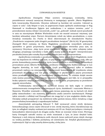 Z EWANGELIĄ NA KOZETCE Apokryficzna Ewangelia Filipa zawiera intrygującą wzmiankę, którą poszukiwacze sensacji zazwyczaj tłumaczą w następujący sposób: „Maria Magdalena była towarzyszką Zbawiciela. Chrystus miłował ją bardziej niż uczniów. Całował ją często w usta”. Cały kłopot w tym, że papirusowa kopia apokryfu znalezionego w Nag Hammadi w środkowym Egipcie jest uszkodzona i w miejsce terminu „usta” z powodzeniem można włożyć rzeczownik „czoło” czy „policzek”. Jednak nawet pocałunek w usta na starożytnym Bliskim Wschodzie wcale nie musiał oznaczać intymnej, tym bardziej seksualnej więzi. Pierwsi chrześcijanie witali się takim pocałunkiem, o czym świadczy wzmianka św. Pawła w liście skierowanym do mieszkańców Rzymu: „Pozdrówcie wzajemnie jedni drugich pocałunkiem świętym!” (Rz16,16). W gnostyckiej Ewangelii Marii czytamy, że Maria Magdalena pocałowała wszystkich zebranych apostołów w geście przywitania. Autor Ewangelii Filipa stwierdza poza tym, że wyznawcy Chrystusa: „dają życie przez pocałunek, dlatego my także całujemy jeden drugiego, przyjmując narodziny z łaski, którą mamy jedni w drugich”. Interpretowanie pocałunku Jezusa jako oznakę fizycznej intymności jest więc nieuprawnione. Apokryficzna wzmianka o pocałunku Jezusa, który złożył Marii Magdalenie, może stać się impulsem do refleksji nad tym, co psychologowie nazywają mową ciała, albo po prostu komunikacją pozawerbalną w życiu Jezusa. Badania o skuteczności komunikacji prowadzone przez Alberta Mehrabiana, profesora Uniwersytetu Kalifornijskiego w Los Angeles dowodzą, że treść wypowiedzi (czyli przekaz słowny) tylko w siedmiu procentach wpływa na wiarygodność i skuteczność komunikacji. W trzydziestu ośmiu procentach decyduje o tym ton głosu, natomiast w pięćdziesięciu pięciu procentach istota przekazu zależna jest od komunikacji pozawerbalnej. To właśnie dzięki mowie ciała można poznać uczucia i emocje rozmówcy. Ciekawym jest fakt, że w przypadku braku spójności między przekazem słownym a mową ciała, przyjmujemy za prawdziwe sygnały niewerbalne. Problematyka niewerbalnych zachowań Jezusa nie była nigdy w centrum zainteresowania ewangelistów relacjonujących życie, działalność i nauczanie Mistrza z Nazaretu. Wszelkie wzmianki o mowie ciała Jezusa pojawiają się na kartach ich dzieł jakby mimochodem i nie stanowią przedmiotu analiz autorów natchnionych. Dlatego także wnioski z refleksji nad Ewangeliami nie mogą być w tym względzie daleko idące. Chciejmy jednak przypatrzeć się niektórym tylko gestom Jezusa, które świadczą o Jego pozawerbalnej komunikacji z napotkanymi ludźmi. Amerykański antropolog Edward T. Hall wyznaczył cztery strefy dystansu komunikacyjnego. Jezus często wkraczał w tzw. strefę intymną, która charakteryzuje się tym, że odległość między osobami jest mniejsza niż 45 cm. Dotyk jest jednym z istotnych komunikatów skierowanych do drugiej osoby. Może on wyrażać różne treści. Wertując karty Ewangelii natrafić można na wiele wzmianek o tym, że Jezus dotykał ludzi. Najwięcej z nich dotyczy dotknięcia osób chorych. Jezus uzdrowił przez dotyk chorego na wodną puchlinę i kobietę pochyloną od osiemnastu lat. Dotykał głuchoniemych i trędowatych. Ujął za rękę zmarłą dziewczynkę, córkę Jaira. Psychologowie komunikacji podkreślają, że ludzkie oczy mówią. Spojrzenie Jezusa przenikało ludzkie serca i odkrywało ich tajniki. Dlatego było to często spojrzenie pełne miłości, ale niekiedy i gniewu. Tak było wówczas, gdy Żydzi gorszyli się, że Jezus uzdrawia w dzień szabatu. Zdarzało się także, że Jezus pełen delikatności dla największych nawet grzeszników, którzy szukają nawrócenia, odwracał wzrok. Gdy przyprowadzono Mu kobietę, która prowadziła grzeszne życie, Jezus nie chciał jej zawstydzić swoim wzrokiem. Pochylił się i pisał palcem po ziemi. W przypadku wizerunku Jezusa, który się uśmiecha, pozostajemy niemal całkowicie w sferze przypuszczeń. Właściwie Ewangelie tylko raz wspominają rozradowanie na twarzy Jezusa: gdy radował się w Duchu Świętym podczas modlitwy wielbienia Boga. Jeśli jednak wziąć pod uwagę fakt, że Jezus z Nazaretu był – by użyć określenia technicznego psychologów – osobowością zintegrowaną, to jedną z ważnych cech takiej osobowości jest poczucie humoru. Możemy więc dostrzec uśmiech na twarzy Jezusa np. na weselu w Kanie Galilejskiej czy też w chwili, gdy Jezus spostrzegł niskiego wzrostem Zacheusza wspinającego się na sykomorę w Jerychu. Jezus nie krył swoich łez. Wędrujący po Jerozolimie pielgrzymi chętnie zaglądają do przytulnego kościółka położonego na stokach Góry Oliwnej, o romantycznym wezwaniu „Dominus flevit”. To właśnie w tym miejscu, jak głosi chrześcijańska tradycja, Pan zapłakał nad Jerozolimą. Płacz Jezusa jest także płaczem przyjaźni. Tak było nad grobem Łazarza. Jezusowa mowa ciała ukazuje sylwetkę człowieka dojrzałego osobowościowo, wyrażającego swymi gestami całą gamę uczuć i przekazującego za ich pomocą istotne treści Jego nauczania. Wszystkie te przejawy pozawerbalnej komunikacji Jezusa z Jego rozmówcami dają wyraz Jego uczuciom i pragnieniom. Wyrażają chęć nawiązania kontaktu osobowego i intymnego, ukazują radość, smutek, współczucie, miłosierdzie, przebaczenie, słuszny gniew. Jezus pozawerbalnie nie tylko komunikuje uczucia, ale także przekazuje orędzie: wzywa do nawrócenia, ukazuje miłość Boga wobec człowieka, przejawia cudotwórczą moc, błogosławi, oczyszcza, podnosi pokutujących grzeszników i przywraca do społeczności wykluczonych zeń trędowatych.