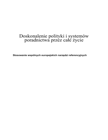 Doskonalenie polityki i systemów poradnictwa przez całe życie Stosowanie wspólnych europejskich narzędzi referencyjnych O niniejszej publikacji Niniejsza publikacja wprowadza zagadnienie trzech wspólnych europejskich narzędzi referencyjnych w zakresie poradnictwa: • cele i zasady świadczenia usług poradnictwa przez całe życie; • punkty referencyjne dla systemów zapewniania jakości w zakresie świadczenia usług poradnictwa w Europie; • najważniejsze cechy systemów poradnictwa przez całe życie. Przedstawia ona kontekst, w jakim zostały one opracowane, a także zawiera propozycje wykorzystania poszczególnych narzędzi w celu doskonalenia istniejącej polityki i systemów poradnictwa na szczeblu krajowym, regionalnym i lokalnym oraz do wymiany doświadczeń partnerskich na szczeblu krajowym i ogólnoeuropejskim. 11 Przedmowa Szefowie rządów i Państw Członkowskich UE na posiedzeniu w Lizbonie w 2000 roku wyznaczyli Europie cel: do 2010 roku ma się ona stać najbardziej konkurencyjną i dynamiczną, opartą na wiedzy gospodarką świata, zdolną do trwałego rozwoju gospodarczego, zapewniającą większą liczbę coraz lepszych miejsc pracy oraz charakteryzującą się większą spójnością społeczną. Uznali oni, iż edukacja, szkolenia oraz zatrudnienie mogą wnieść istotny wkład w urzeczywistnienie tego celu, przede wszystkim poprzez zapewnianie możliwości kształcenia przez całe życie dla wszystkich obywateli. Stwierdzili także konieczność unowocześnienia polityki, systemów oraz stosowanych praktyk. Kolejnym krokiem było uzgodnienie przez Radę ds. Edukacji oraz Komisję Europejską wspólnej struktury europejskiej ułatwiającej procesy modernizacji. Struktura ta, określana mianem programu pracy „Edukacja i Szkolenie 2010”1, obejmuje trzy powiązane ze sobą komponenty: rozwój systemów kształcenia przez całe życie, realizacja przyszłych celów dotyczących systemów edukacji i szkolenia oraz poszerzenie współpracy w zakresie kształcenia i szkolenia zawodowego (ang. VET). Świadczenie usług poradnictwa przez całe życie dla obywateli Europy uznano za integralny składnik wszystkich trzech komponentów. Aby ułatwić formułowanie polityki w zakresie poradnictwa, w grudniu 2002 roku Komisja Europejska powołała Grupę Ekspertów ds. Poradnictwa Przez Całe Życie2, stawiając przed nią następujące zadania: (a) wypracowanie wspólnego zrozumienia podstawowych pojęć i fundamentalnych zasad dotyczących poradnictwa; (b)przeanalizowanie jakości świadczonych usług poradnictwa w celu opracowania wspólnych wytycznych oraz kryteriów jakości wykorzystywanych do akredytacji usług i produktów poradnictwa3. (1) Zob.: http://europa.eu.int/comm/education/policies/2010/doc/10_year_en.pdf (2) Grupa składa się z 25 przedstawicieli reprezentujących ministerstwa właściwe do spraw edukacji i pracy, europejskich partnerów społecznych, europejskie stowarzyszenia konsumentów, rodziców i młodzież, podmioty o charakterze ogólnoeuropejskim (Europejska Fundacja ds. Szkoleń, Cedefop) oraz międzynarodowym (Międzynarodowe Stowarzyszenie Poradnictwa Edukacyjnego i Zawodowego – IAEVG, Organizacja Współpracy Gospodarczej i Rozwoju - OECD, Światowe Stowarzyszenie Publicznych Służb Zatrudnienia - WAPES). (3) Zadania te są odzwierciedleniem potrzeb rozpoznanych w ramach przeglądu polityki w zakresie poradnictwa zawodowego, zainicjowanego w 2001 roku przez OECD oraz rozszerzonego, w latach 20022003, przez Komisję Europejską na wszystkie kraje europejskie, dzięki współpracy Cedefopu oraz ETF. Zob: http://www.trainingvillage.gr/etv/Projects_Networks/Guidance/Career_Guidance_survey/ and http://www.oecd.org/document/35/0,2340,en_2649_34511_1940323_1_1_1_37455,00.html 22 Wspólny Raport Okresowy Rady i Komisji Europejskiej z 2004 roku pt. Edukacja i Szkolenie 2010: sukces strategii lizbońskiej zależy od przeprowadzenia pilnych reform4 wzywał do opracowania wspólnych europejskich zasad i punktów referencyjnych, przydatnych w aspekcie formułowania polityk krajowych. Polityka Unii Europejskiej w zakresie edukacji i szkolenia zasadniczo pozostaje w kompetencji poszczególnych państw członkowskich UE. Z tego względu działania na szczeblu europejskim odbywają się na zasadzie dobrowolności. Aby usprawniać i unowocześniać politykę, systemy i praktyki w dziedzinie edukacji, kraje uzgadniają wspólne priorytety i cele, opracowują wspólne europejskie wskaźniki i wartości porównawcze (benchmarks), wspólne punkty referencyjne oraz uczą się od siebie wzajemnie poprzez wymianę najlepszych praktyk. Efektem pracy Grupy Ekspertów ds. Poradnictwa przez Całe Życie jest opracowanie następujących europejskich narzędzi referencyjnych: • wspólne cele i zasady świadczenia usług poradnictwa przez całe życie, • wspólne punkty referencyjne dla systemów zapewniania jakości w zakresie poradnictwa, przede wszystkim z perspektywy obywatela/użytkownika, • najważniejsze cechy systemowego modelu poradnictwa przez całe życie. Narzędzia te mają pomagać Państwom Członkowskim w usprawnianiu i unowocześnianiu swoich polityk, systemów i praktyk poprzez samoocenę oraz samodzielny rozwój świadczenia usług na poziomie krajowym, regionalnym i lokalnym. Konieczność zreformowania polityk, systemów i praktyki w zakresie poradnictwa w Europie dodatkowo podkreśla Uchwała Rady ds. Edukacji z maja 2004 roku(5). W Uchwale tej za zagadnienia priorytetowe uznano: rozwój powszechnie dostępnych usług wysokiej jakości poradnictwa, usprawnienie mechanizmów zapewniania jakości oraz wzmocnienie struktur odpowiedzialnych za formułowanie polityki i rozwój systemów na szczeblu krajowym i regionalnym. Uchwała zachęcała państwa członkowskie UE do przyjrzenia się krajowym usługom poradnictwa i sposobom ich świadczenia w sektorze oświaty, szkoleń i zatrudnienia w świetle wniosków wypływających z przegląd