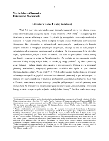 1 Maria Jolanta Olszewska Uniwersytet Warszawski Literatura wobec I wojny światowej Wiek XX łączy się z doświadczeniem licznych, toczących się w tym okresie wojen, 1 wśród których miejsce szczególne zajęła I wojna światowa (1914-1918) . Traktujemy ją dziś jako historię mocno oddaloną w czasie. Przysłoniła ją niewątpliwie straszniejsza od niej w skutkach II wojna światowa, potem nastąpiły kolejne jeszcze trudniejsze doświadczenia historyczne. Dla historyków o skłonnościach syntetycznych, podejmujących badania dziejów ludzkości z rozległych perspektyw dziejowych, okazuje się ona do dziś jednym z najważniejszych momentów przełomowych w dziejach. W ich rozpoznaniu była nie tylko wojną, wydarzeniem jednym z wielu w historii, ale stała się początkiem końca pewnej cywilizacji – znaczącym wstęp do Współczesności. Ze względu na swe znaczenie została nazwana Wielką Wojną białych ludzi, co nadało jej rangę symbolu2. Jej idea – pierwszej wojny totalnej – dobrze oddaje istotę sporów o nowoczesność3. Wpisuje się w przestrzeń globalnej modernizacji, dotyczącej praktycznie wszelkich sfer życia, w tym również literatury, także polskiej4. Wojna z lat 1914-1918 skorelowana jest ściśle z tempem przemian technologiczno-cywilizacyjnych i zmianami świadomości społecznej z tym związanymi, co znalazło swe odzwierciedlenie w myśleniu estetycznym. Zakończyła definitywnie XIX wiek w Europie, sankcjonując rozpad dawnego porządku politycznego i rozkład społeczny oraz kryzys etyki. Jej żniwem była śmierć dziewięciu milionów ludzi: „zmieniła mapę i przyszłość Europy w takim samym stopniu, w jakim raniła jej ciało i duszę”5. Problem modernistycznego 1 Problemowi literatury polskiej wobec I wojny światowej poświęciłam monografię: Człowiek w świecie Wielkiej Wojny. Literatura polska z lat 1914-1919 wobec I wojny światowej. Wybrane zagadnienia. Warszawa 2004. Zob. też Literatura wobec I wojny światowej, pod red. M. J. Olszewskiej i J. Zacharskiej, Warszawa 2000, s. 125-126. 2 Na ten temat pisze obszernie i nowatorsko: M. Eksteins, Święto wiosny. Wielka wojna i narodziny nowego wieku, przeł. K. Rabińska, Warszawa 1996. 3 Pojęcie modernizmu jest semantycznie nieostre. W naszych rozważaniach korzystamy z koncepcji: R. Shepparda, Problematyka modernizmu europejskiego, przeł. P. Wawrzyszko [w:] Odkrywanie modernizmu. Przekłady i komentarze, [zbiór.] pod red. i ze wstępem R. Nycza, Kraków 1998. Por. R. Nycz, Kilka uwag o formacji modernistycznej, [w:] tenże, Język modernizmu. Prolegomena historycznoliterackie, Wrocław 1998, str. 9-43. Nowoczesność rozumiemy nie jako przygotowawczą fazę Młodej Polski (wg Kazimierza Wyki), ale jako zespół zjawisk i tendencji w kulturze (w tym w literaturze), który ukształtował się około roku 1910 i swym zasięgiem objął większą część XX wieku. Zakładamy, że istnieje silny związek między modernistycznym przełomem a procesami modernistycznymi zachodzącymi w Europie, w tym również w polskim społeczeństwie. 4 Taką interpretację zaproponował m.in. M. Eksteins, op. cit.; M. Gilbert, Pierwsza wojna światowa, przeł. S. Amsterdamski, Poznań 2003; por. artykuł J. Święcha, Wojna a „projekt nowoczesności” op. cit., s. 9-34. 5 M. Gilbert, op. cit., s. 15. 2 dyskursu wojny to przede wszystkim kwestia doświadczenia nowoczesności. Słusznie pisze Jerzy Święch, że: […] wojna straciła jakby swoją dawną, niejako przypisaną sobie od zawsze ideę, jakąś myśl porządkującą, nadającą jej sens, skoro teraz jawi się jako zjawisko nieprzedstawialne i niepojmowalne. Idea wojny wymknęła się tym samym spod kontroli tych, którzy chcieli ją wprząc do własnych celów, wyemancypowała się – czy jak kto woli – wyalienowała w sposób, jakiego nikt wcześniej nie był w stanie przewidzieć6. Skutkiem wojna totalnej, rozpoczynającej odmierzanie „czasu” nowoczesności, musiała być alienacja idei wojny jako zjawiska kulturowego, co z kolei doprowadziło do poczucia nieodwracalnej klęski humanizmu, szczególnie silnie odczuwanej w obliczu straszliwych zniszczeń, które przekroczyły wszelkie dotychczasowe wyobrażenia i stopień ludzkiej wrażliwości. Coraz bardziej czytelny stawał się dylemat: „kto ma prawo mówić o wojnie” i „czy w ogóle możliwe jest uporządkowanie doświadczeń oraz wiarygodna ich werbalizacja?” Nie do rozstrzygnięcia wydawał się problem wojennej prawdy. Niemożliwy bowiem do realizacji ze względu na zafałszowanie rzeczywistości wojennej okazał się globalny przekaz o „wojnie” wpisany w romantyczny schemat „wielkiej narracji”. W wypowiedziach na temat wojny twórcy eksponowali jej trudny do zwerbalizowania fenomen: […] wojna jest zjawiskiem zgoła wyjątkowym – tak Mieczysław Szerer w pracy Socjologia wojny z kwietnia 1915 roku próbował «na gorąco» scharakteryzować fenomen wojny totalnej – i jako taka pobudza społeczność do reakcji zupełnie wyjątkowych, a więc zdeterminowanych i w rodzaju swoim i w trwałości swojej potrzebami osobliwej chwili9. Starając się uchwycić jej istotę, twórcy mówili o tej wojnie jako o „epoce przejściowej”, o jej „przełomowości” eksponując w ten sposób jej nowoczesność i totalny wpływ na wszystkie dziedziny życia. Np. Marian Barski swój artykuł Przyczyny i cele wojny, drukowany w „Sfinksie” w roku 1917 (nr 102-104), tak podzielił, aby wyeksponować znaczenie przełomowości zjawiska, co znalazło swe odzwierciedlenie w tytułach poszczególnych części: Wojna jako przewrót moralny, Wojna jako przewrót umysłowy, Wojna jako przewrót społeczny i Wojna jako przewrót państwowy. „Przewrót” ogarnął – jego zdaniem – wszystkie sfery życia, również etyczne i mentalne11. Jedno było tylko pewne - wojna totalna „zmieniła 6 Ibidem, op. cit., s. 13, s. 9-10. M. Szerer, Socjologia wojny, Krak