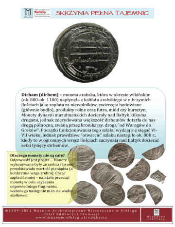Dirham (dirhem) – moneta arabska, która w okresie wikińskim (ok. 800‐ok. 1100) napłynęła z kalifatu arabskiego w olbrzymich ilościach jako zapłata za niewolników, zwierzęta hodowlane (głównie bydło), produkty rolne oraz futra, miód czy bursztyn. Monety dynastii muzułmańskich docierały nad Bałtyk kilkoma drogami, jednak zdecydowana większość dirhemów dotarła do nas drogą północną, zwaną przez kronikarzy. drogą "od Waregów do Greków". Początki funkcjonowania tego szlaku wydają się sięgać VI‐ VII wieku, jednak prawdziwe "otwarcie" szlaku nastąpiło ok. 800 r., kiedy to w ogromnych wręcz ilościach zaczynają nad Bałtyk docierać setki tysięcy dirhemów. Dlaczego monety nie są całe? Odpowiedź jest prosta… Monety wykonywane były ze srebra i to ono przedstawiało wartość pieniądza (a konkretnie waga srebra). Chcąc zapłacić mniej – należało przeciąć monetę w celu uzyskania odpowiedniego fragmentu, ważonego następnie m.in. na wadze szalkowej. ®2009‐2011 Muzeum Archeologiczno‐Historyczne w Elblągu Dział Edukacji i Promocji www.muzeum.elblag.pl/edukacja MUZEALNA SKRZYNIA