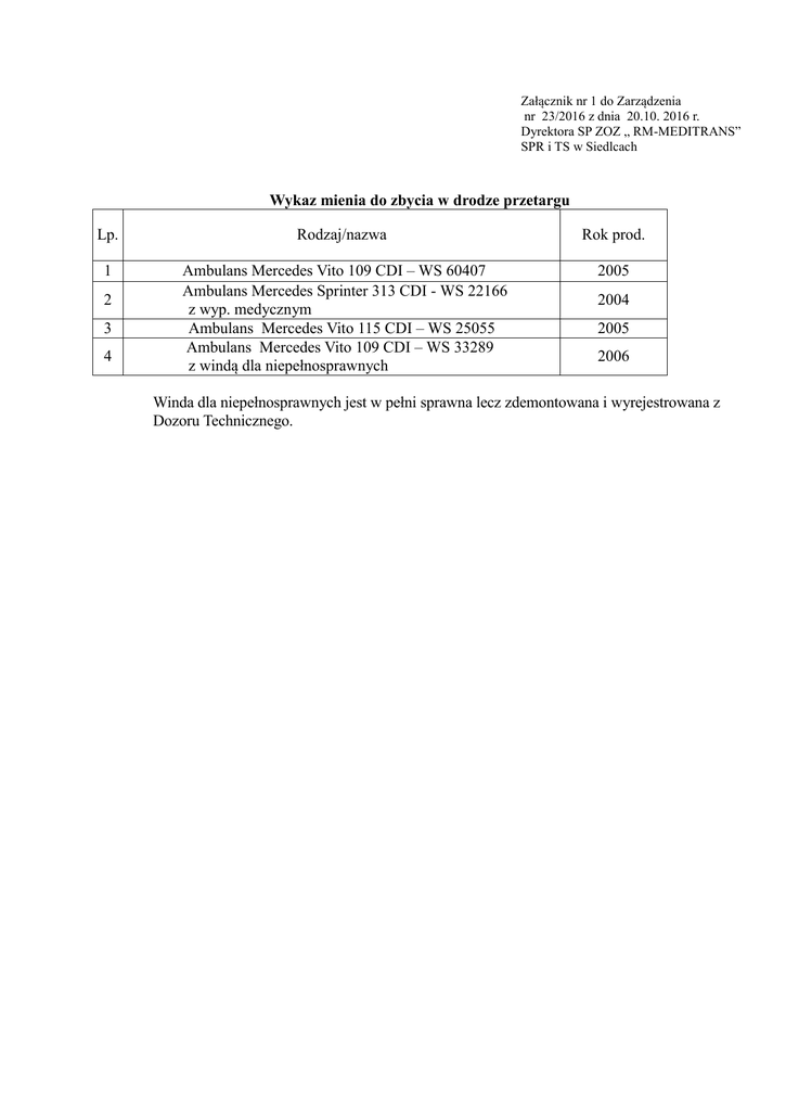 Załącznik nr 1 do Zarządzenia nr 23/2016 z dnia 20.10. 2016 r. Dyrektora SP ZOZ „ RM-MEDITRANS” SPR i TS w Siedlcach Wykaz mienia do zbycia w drodze przetargu Lp. Rodzaj/nazwa Rok prod. 1 Ambulans Mercedes Vito 109 CDI – WS 60407 Ambulans Mercedes Sprinter 313 CDI - WS 22166 z wyp. medycznym Ambulans Mercedes Vito 115 CDI – WS 25055 Ambulans Mercedes Vito 109 CDI – WS 33289 z windą dla niepełnosprawnych 2005 2 3 4 2004 2005 2006 Winda dla niepełnosprawnych jest w pełni sprawna lecz zdemontowana i wyrejestrowana z Dozoru Technicznego.