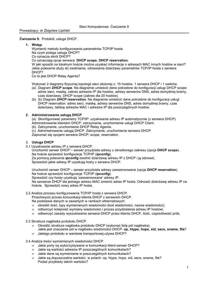 Sieci Komputerowe. Ćwiczenie 9 Prowadzący: dr Zbigniew Lipiński Ćwiczenie 9. Protokół, usługa DHCP. 1. Wstęp Wymienić metody konfigurowania parametrów TCP/IP hosta. Na czym polega usługa DHCP? Co oznacza skrót DHCP? Co oznaczają opcje serwera: DHCP scope, DHCP reservation. W jaki sposób na lokalnym hoście moŜna uzyskać informacje o adresach MAC innych hostów w sieci? Jakie polecenie słuŜy do zwalniania, odnawiania dzierŜawy parametrów TCP/IP hosta z serwera DHCP? Co to jest DHCP Relay Agenta? Wykonać 2 diagramy fizycznej topologii sieci złoŜonej z: 15 hostów, 1 serwera DHCP i 1 switcha. (a) Diagram DHCP scope. Na diagramie umieścić dane potrzebne do konfiguracji usługi DHCP scope: adres sieci, maskę, zakres adresów IP dla hostów, adresy serwerów DNS, adres domyślnej bramy, czas dzierŜawy, DHCP scope (zakres dla 20 hostów). (b) (b) Diagram DHCP reservation. Na diagramie umieścić dane potrzebne do konfiguracji usługi DHCP reservation: adres sieci, maskę, adresy serwerów DNS, adres domyślnej bramy, czas dzierŜawy, tablicę adresów MAC i adresów IP dla poszczególnych hostów. 2. Administrowanie usługą DHCP (a) Skonfigurować parametry TCP/IP: uzyskiwanie adresu IP automatycznie (z serwera DHCP). Administrowanie klientem DHCP: zatrzymanie, uruchomienie usługi DHCP Client. (b) Zatrzymanie, uruchomienie DHCP Relay Agenta. (c) Administrowanie usługą DHCP. Zatrzymanie, uruchomienie serwera DHCP. Zapoznać się opcjami serwera DHCP: scope, reservation. 3. Usługa DHCP 3.1 Uzyskiwanie adresu IP z serwera DHCP. Uruchomić serwer DHCP – serwer przydziela adresy z określonego zakresu (opcja DHCP scope). Na hoście sprawdzić konfiguracje TCP/IP (ipconfig). Za pomocą polecenia ipconfig zwolnić dzierŜawę adresu IP z DHCP i ją odnowić. Sprawdzić jakie adresy IP uzyskują hosty z serwera DHCP. Uruchomić serwer DHCP – serwer przydziela adresy zarezerwowane (opcja DHCP reservation). Na hoście sprawdzić konfiguracje TCP/IP (ipconfig). Sprawdzić czy hosty uzyskują ‘zarezerwowane’ adresy IP. Na serwerze DHCP dla jednego adresu MAC zmienić adres IP hosta. Odnowić dzierŜawę adresu IP na hoście. Sprawdzić nowy adres IP hosta. 3.2 Analiza procesu konfigurowania TCP/IP hosta z serwera DHCP. Przechwycić proces komunikacji klienta DHCP z serwerem DHCP. Na podstawie danych w zawartych w ramkach ethernetowych: • określić ilość, typy wymienianych wiadomości (kod wiadomości, nazwa wiadomości). • odtworzyć kolejność wymiany wiadomości i proces przydzielania adresu IP hostowi. • odtworzyć zasady wyszukiwania serwera DHCP przez klienta DHCP, ilość, częstotliwość prób. 3.3 Struktura nagłówka protokołu DHCP. • Określić struktura nagłówka protokołu DHCP (wykonać listę pól nagłówka). Jakie jest znaczenie pól w nagłówku wiadomości DHCP: op, htype, hops, xid, secs, sname, file? • Jakiego protokołu w warstwie transportowej uŜywa DHCP? 3.4 Analiza treści wymienianych wiadomości DHCP. • Jakie porty są wykorzystywane w komunikacji klient-serwer DHCP? • Jakie są wartości adresów IP poszczególnych komunikatach? • Jakie dane są wymienianie w poszczególnych komunikatach? • Jakie są dopuszczalne wartości w polach: op, htype, hops, xid, secs, sname, file? Podać przykłady takich wartości? 1 Sieci Komputerowe. Ćwiczenie 9 Prowadzący: dr Zbigniew Lipiński 4. Konfigurowanie serwra DHCP na routerze Zbudować sieć złoŜoną z dwóch hostów m110, m11, jednego switcha i jednego routera. Przypisać routerowi adres IP. Router(config)# interface fastethernet 0/0 Router(config-if)# ip address 192.168.1.1 255.255.255.0 Router(config-if)# no shutdown Skonfigurować usługę DHCP na routerze (usułga DHCP jest domyślnie uruchomiona). Konfigurowanie pul adresowych Router(config)# ip dhcp pool pula1 Router(dhcp-config)# default-router 192.168.1.1 Router(dhcp-config)# domain-name opole.pl Router(dhcp-config)# dns-server 192.168.1.2 Router(dhcp-config)# dns-server 172.16.20.20 Router(dhcp-config)# network 192.168.1.0 255.255.255.0 Router(dhcp-config)# exit Wykluczanie adresów Router(config)#ip dhcp excluded-address adresOd adresDo Router(config)#ip dhcp excluded-address 192.168.1.1 Router(config)#ip dhcp excluded-address 192.168.1.2 Informacja o dzierŜawie adresu Router# show ip dhcp binding Uruchomienie serwera DHCP na routerze Router(config)#service dhcp Sprawdzić czy hosty m110, m11 uzyskały adresy IP i inne parametry konfiguracyjne TCP/IP z serwera DHCP. 2