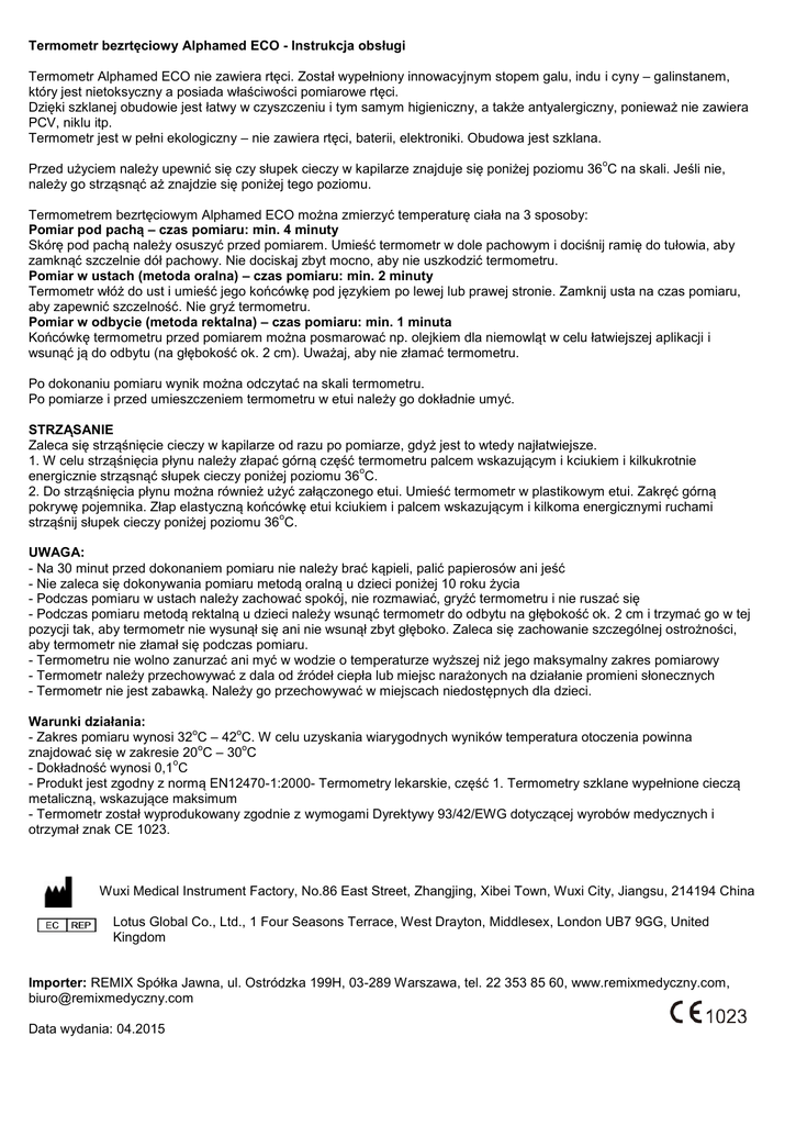 Termometr bezrtęciowy Alphamed ECO - Instrukcja obsługi Termometr Alphamed ECO nie zawiera rtęci. Został wypełniony innowacyjnym stopem galu, indu i cyny – galinstanem, który jest nietoksyczny a posiada właściwości pomiarowe rtęci. Dzięki szklanej obudowie jest łatwy w czyszczeniu i tym samym higieniczny, a także antyalergiczny, ponieważ nie zawiera PCV, niklu itp. Termometr jest w pełni ekologiczny – nie zawiera rtęci, baterii, elektroniki. Obudowa jest szklana. o Przed użyciem należy upewnić się czy słupek cieczy w kapilarze znajduje się poniżej poziomu 36 C na skali. Jeśli nie, należy go strząsnąć aż znajdzie się poniżej tego poziomu. Termometrem bezrtęciowym Alphamed ECO można zmierzyć temperaturę ciała na 3 sposoby: Pomiar pod pachą – czas pomiaru: min. 4 minuty Skórę pod pachą należy osuszyć przed pomiarem. Umieść termometr w dole pachowym i dociśnij ramię do tułowia, aby zamknąć szczelnie dół pachowy. Nie dociskaj zbyt mocno, aby nie uszkodzić termometru. Pomiar w ustach (metoda oralna) – czas pomiaru: min. 2 minuty Termometr włóż do ust i umieść jego końcówkę pod językiem po lewej lub prawej stronie. Zamknij usta na czas pomiaru, aby zapewnić szczelność. Nie gryź termometru. Pomiar w odbycie (metoda rektalna) – czas pomiaru: min. 1 minuta Końcówkę termometru przed pomiarem można posmarować np. olejkiem dla niemowląt w celu łatwiejszej aplikacji i wsunąć ją do odbytu (na głębokość ok. 2 cm). Uważaj, aby nie złamać termometru. Po dokonaniu pomiaru wynik można odczytać na skali termometru. Po pomiarze i przed umieszczeniem termometru w etui należy go dokładnie umyć. STRZĄSANIE Zaleca się strząśnięcie cieczy w kapilarze od razu po pomiarze, gdyż jest to wtedy najłatwiejsze. 1. W celu strząśnięcia płynu należy złapać górną część termometru palcem wskazującym i kciukiem i kilkukrotnie o energicznie strząsnąć słupek cieczy poniżej poziomu 36 C. 2. Do strząśnięcia płynu można również użyć załączonego etui. Umieść termometr w plastikowym etui. Zakręć górną pokrywę pojemnika. Złap elastyczną końcówkę etui kciukiem i palcem wskazującym i kilkoma energicznymi ruchami o strząśnij słupek cieczy poniżej poziomu 36 C. UWAGA: - Na 30 minut przed dokonaniem pomiaru nie należy brać kąpieli, palić papierosów ani jeść - Nie zaleca się dokonywania pomiaru metodą oralną u dzieci poniżej 10 roku życia - Podczas pomiaru w ustach należy zachować spokój, nie rozmawiać, gryźć termometru i nie ruszać się - Podczas pomiaru metodą rektalną u dzieci należy wsunąć termometr do odbytu na głębokość ok. 2 cm i trzymać go w tej pozycji tak, aby termometr nie wysunął się ani nie wsunął zbyt głęboko. Zaleca się zachowanie szczególnej ostrożności, aby termometr nie złamał się podczas pomiaru. - Termometru nie wolno zanurzać ani myć w wodzie o temperaturze wyższej niż jego maksymalny zakres pomiarowy - Termometr należy przechowywać z dala od źródeł ciepła lub miejsc narażonych na działanie promieni słonecznych - Termometr nie jest zabawką. Należy go przechowywać w miejscach niedostępnych dla dzieci. Warunki działania: o o - Zakres pomiaru wynosi 32 C – 42 C. W celu uzyskania wiarygodnych wyników temperatura otoczenia powinna o o znajdować się w zakresie 20 C – 30 C o - Dokładność wynosi 0,1 C - Produkt jest zgodny z normą EN12470-1:2000- Termometry lekarskie, część 1. Termometry szklane wypełnione cieczą metaliczną, wskazujące maksimum - Termometr został wyprodukowany zgodnie z wymogami Dyrektywy 93/42/EWG dotyczącej wyrobów medycznych i otrzymał znak CE 1023. Wuxi Medical Instrument Factory, No.86 East Street, Zhangjing, Xibei Town, Wuxi City, Jiangsu, 214194 China Lotus Global Co., Ltd., 1 Four Seasons Terrace, West Drayton, Middlesex, London UB7 9GG, United Kingdom Importer: REMIX Spółka Jawna, ul. Ostródzka 199H, 03-289 Warszawa, tel. 22 353 85 60, www.remixmedyczny.com, [email protected] Data wydania: 04.2015