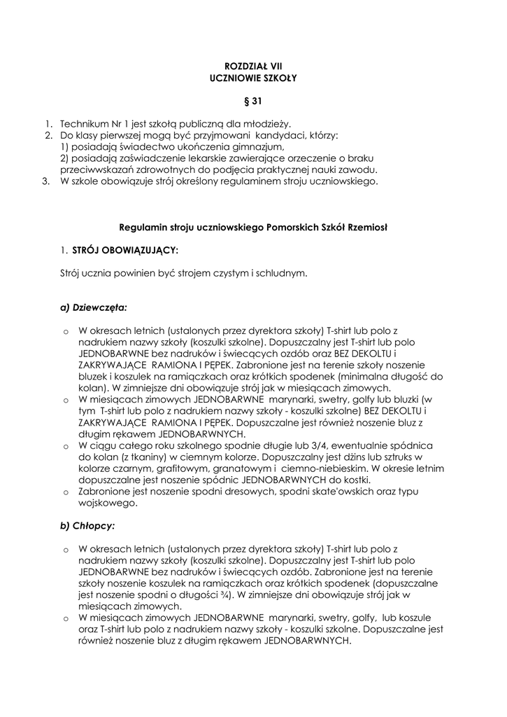 ROZDZIAŁ VII UCZNIOWIE SZKOŁY § 31 1. Technikum Nr 1 jest szkołą publiczną dla młodzieży. 2. Do klasy pierwszej mogą być przyjmowani kandydaci, którzy: 1) posiadają świadectwo ukończenia gimnazjum, 2) posiadają zaświadczenie lekarskie zawierające orzeczenie o braku przeciwwskazań zdrowotnych do podjęcia praktycznej nauki zawodu. 3. W szkole obowiązuje strój określony regulaminem stroju uczniowskiego. Regulamin stroju uczniowskiego Pomorskich Szkół Rzemiosł 1. STRÓJ OBOWIĄZUJĄCY: Strój ucznia powinien być strojem czystym i schludnym. a) Dziewczęta: o o o o W okresach letnich (ustalonych przez dyrektora szkoły) T-shirt lub polo z nadrukiem nazwy szkoły (koszulki szkolne). Dopuszczalny jest T-shirt lub polo JEDNOBARWNE bez nadruków i świecących ozdób oraz BEZ DEKOLTU i ZAKRYWAJĄCE RAMIONA I PĘPEK. Zabronione jest na terenie szkoły noszenie bluzek i koszulek na ramiączkach oraz krótkich spodenek (minimalna długość do kolan). W zimniejsze dni obowiązuje strój jak w miesiącach zimowych. W miesiącach zimowych JEDNOBARWNE marynarki, swetry, golfy lub bluzki (w tym T-shirt lub polo z nadrukiem nazwy szkoły - koszulki szkolne) BEZ DEKOLTU i ZAKRYWAJĄCE RAMIONA I PĘPEK. Dopuszczalne jest również noszenie bluz z długim rękawem JEDNOBARWNYCH. W ciągu całego roku szkolnego spodnie długie lub 3/4, ewentualnie spódnica do kolan (z tkaniny) w ciemnym kolorze. Dopuszczalny jest dżins lub sztruks w kolorze czarnym, grafitowym, granatowym i ciemno-niebieskim. W okresie letnim dopuszczalne jest noszenie spódnic JEDNOBARWNYCH do kostki. Zabronione jest noszenie spodni dresowych, spodni skate'owskich oraz typu wojskowego. b) Chłopcy: o o W okresach letnich (ustalonych przez dyrektora szkoły) T-shirt lub polo z nadrukiem nazwy szkoły (koszulki szkolne). Dopuszczalny jest T-shirt lub polo JEDNOBARWNE bez nadruków i świecących ozdób. Zabronione jest na terenie szkoły noszenie koszulek na ramiączkach oraz krótkich spodenek (dopuszczalne jest noszenie spodni o długości ¾). W zimniejsze dni obowiązuje strój jak w miesiącach zimowych. W miesiącach zimowych JEDNOBARWNE marynarki, swetry, golfy, lub koszule oraz T-shirt lub polo z nadrukiem nazwy szkoły - koszulki szkolne. Dopuszczalne jest również noszenie bluz z długim rękawem JEDNOBARWNYCH. o o W ciągu całego roku szkolnego spodnie długie w ciemnym kolorze. Dopuszczalny jest dżins lub sztruks w kolorze czarnym, grafitowym, granatowym i ciemno-niebieskim. Zabronione jest noszenie spodni dresowych, spodni skate'owskich oraz typu wojskowego. Właściwy strój obowiązuje w trakcie trwania całego roku szkolnego, niezależnie od warunków atmosferycznych. 2. NIE WOLNO o nosić spodni lub spódnic innego typu niż wymienione, np. kolorowe spodnie, krótsze niż te standardowej długości , spodnie dresowe, skate'owskie oraz typu wojskowego czy dziurawe dżinsy, o nosić kapturów (również tych od bluz) na głowach, o nosić jakichkolwiek nakryć głowy na terenie szkoły. 3. STRÓJ GALOWY a) Dziewczęta o marynarka lub żakiet, spodnie lub spódnica przepisowej długości, biała bluzka bez dekoltu i zakrywająca ramiona i pępek. b) Chłopcy pełny garnitur, biała koszula, krawat o Strój uczniowski obowiązuje również podczas wyjść szkolnych. 4. Niestosowanie się do powyższego regulaminu skutkować będzie nakładaniem kar regulaminowych przewidzianych w statucie szkoły.