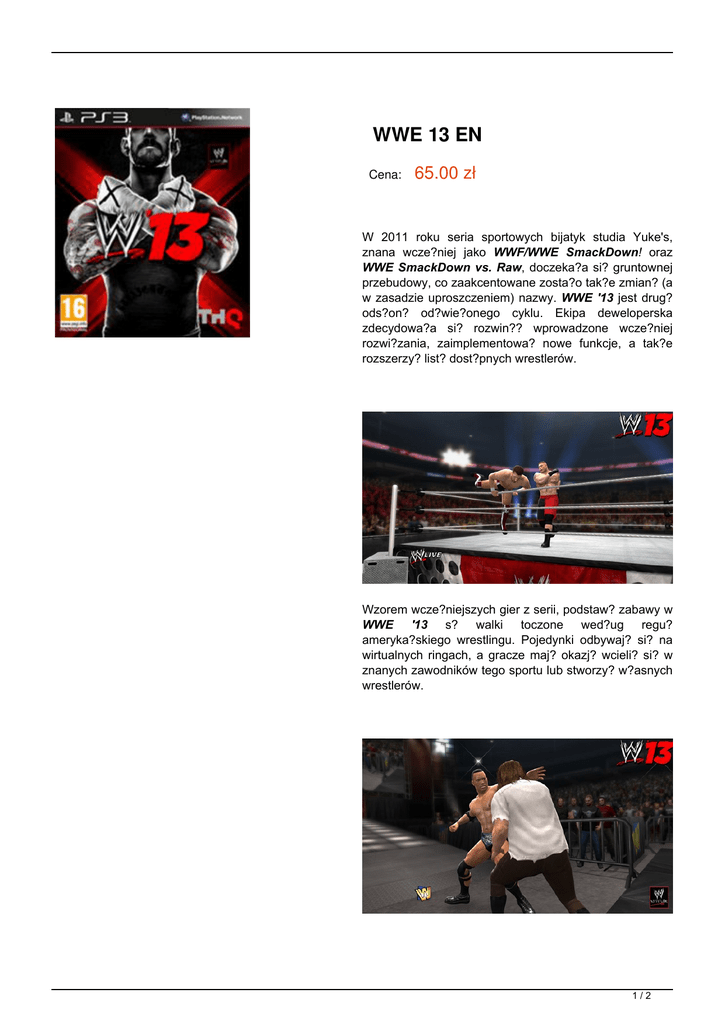 WWE 13 EN Cena: 65.00 zł W 2011 roku seria sportowych bijatyk studia Yuke's, znana wcze?niej jako WWF/WWE SmackDown! oraz WWE SmackDown vs. Raw, doczeka?a si? gruntownej przebudowy, co zaakcentowane zosta?o tak?e zmian? (a w zasadzie uproszczeniem) nazwy. WWE '13 jest drug? ods?on? od?wie?onego cyklu. Ekipa deweloperska zdecydowa?a si? rozwin?? wprowadzone wcze?niej rozwi?zania, zaimplementowa? nowe funkcje, a tak?e rozszerzy? list? dost?pnych wrestlerów. Wzorem wcze?niejszych gier z serii, podstaw? zabawy w WWE '13 s? walki toczone wed?ug regu? ameryka?skiego wrestlingu. Pojedynki odbywaj? si? na wirtualnych ringach, a gracze maj? okazj? wcieli? si? w znanych zawodników tego sportu lub stworzy? w?asnych wrestlerów. 1/2 Najwa?niejsz? nowo?ci? wprowadzon? w WWE '13 jest kampania jednoosobowa – Story Mode, która zast?pi?a tryb Road To WrestleMania obecny w poprzednich cz??ciach serii. Ten wariant rozgrywki umo?liwia wcielenie si? w jednego z o?miu zapa?ników i wzi?cie udzia?u w serii walk os?awionego, telewizyjnego cyklu „Monday Night Wars”. Zobacz wideo: 2/2 Powered by TCPDF (www.tcpdf.org)