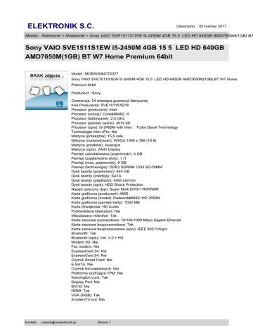 ELEKTRONIK S.C. Utworzono : 02 marzec 2017 Mobile - Notebooki > Notebooki > Sony VAIO SVE1511S1EW i5-2450M 4GB 15 5 LED HD 640GB AMD7650M(1GB) BT Sony VAIO SVE1511S1EW i5-2450M 4GB 15 5 LED HD 640GB AMD7650M(1GB) BT W7 Home Premium 64bit Model : MOBSONNOT0377 Sony VAIO SVE1511S1EW i5-2450M 4GB 15 5 LED HD 640GB AMD7650M(1GB) BT W7 Home Premium 64bit Producent : Sony Gwarancja: 24 miesiące gwarancji fabrycznej Kod Producenta: SVE1511S1E/W Procesor (producent): Intel� Procesor (rodzaj): Core™ i5 Procesor (taktowanie): 2,5 GHz Procesor (pamięć cache): 3072 kB Procesor (opis): i5-2450M with Intel� Turbo Boost Technology Technologia Intel vPro: Nie Matryca (przekątna): 15,5 cale Matryca (rozdzielczość): WXGA 1366 x 768 (16:9) Matryca (powłoka): świecąca Matryca (opis): VAIO Display Pamięć zainstalowana (pojemność): 4 GB Pamięć (zajęte/wolne sloty): 1 /1 Pamięć (max. pojemność): 8 GB Pamięć (technologia): DDR3 SDRAM 1333 SO-DIMM Dysk twardy (pojemność): 640 GB Dysk twardy (interfejs): SATA Dysk twardy (prędkość): 5400 obr/min Dysk twardy (opis): HDD Shock Protection Napęd optyczny (typ): Super Multi DVD+/-RW/RAM Karta graficzna (producent): AMD Karta graficzna (model): Radeon™ HD 7650M Karta graficzna (pamięć karty): 1024 MB Karta dźwiękowa: HD Audio Podświetlana klawiatura: Nie Wbudowany mikrofon: Tak Karta sieciowa przewodowa: 10/100/1000 Mbps Gigabit Ethernet Karta sieciowa bezprzewodowa: Tak Karta sieciowa bezprzewodowa (opis): IEEE 802.11b/g/n Bluetooth: Tak Bluetooth (opis): Ver. 4.0 + HS Modem 3G: Nie Fax modem: Nie ExpressCard 34: Nie ExpressCard 54: Nie Czytnik Smart Card: Nie E-SATA: Nie Czytnik linii papilarnych: Nie Platforma szyfrująca TPM: Nie Kensington Lock: Tak Display Port: Nie DVI-D: Nie HDMI: Tak VGA (RGB): Tak S-video/TV-out: Nie kontakt : - [email protected] Strona 1 ELEKTRONIK S.C. Utworzono : 02 marzec 2017 Mobile - Notebooki > Notebooki > Sony VAIO SVE1511S1EW i5-2450M 4GB 15 5 LED HD 640GB AMD7650M(1GB) BT Sony VAIO SVE1511S1EW i5-2450M 4GB 15 5 LED HD 640GB AMD7650M(1GB) BT W7 Home Premium 64bit AV-in (Tuner TV): Nie Line-in: Nie Line-out: Tak Wejście mikrofonu: Tak S/PDIF: Nie RS232 (szeregowy): Nie Czytnik kart pamięci: Tak Czytnik kart pamięci (opis): Memory Stick Duo slot x 1, SD memory card slot Panel klawiszy multimedialnych: Nie Złącze replikatora portów: Nie Fire-Wire (IEEE1394): Nie USB 2.0: 3 szt. USB 3.0: 1 szt. System operacyjny: Windows 7 Home Premium 64 bit System operacyjny (wer. Językowa): multilanguage Dodatkowe oprogramowanie: McAfee Internet Security 30 day subscription, McAfee Online Backup 30 day subscription, Internet Explorer� 9, VAIO Transfer Support, VAIO Update, VAIO Smart network , Office 2010 preloaded – buy Office 2010 product key for full activation, Windows Live Essentials 2011, Adobe� Reader� 10 , Remote Keyboard, Remote Play with PlayStation� 3 Wbudowana kamera: Tak Akumulator (technologia): Lithium ion battery Akumulator (czas pracy): 4 h Wymiary (wysokość): 25/35 mm Wymiary (szerokość): 372 mm Wymiary (głębokość): 353 mm Waga: 2,7 kg Gwarancja: 24 mies Gwarancja międzynarodowa: Tak Gwarancja baterii: 12 mies Wyposażenie: AC Adapter - VGP-AC19V31, Power Cord, Documentation Pack, VAIO International Repair Service Guide Opis: BIAŁY Adres www producenta: Link na stronę opisu technicznego Cena : 3.008,70 zł Brutto ( 2.466,15 zł Netto) Dostępność: Produkt dostępny w naszym sklepie od 17 lipiec 2012 kontakt : - [email protected] Strona 2